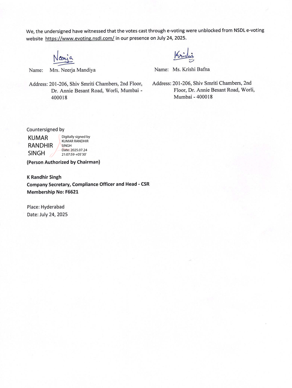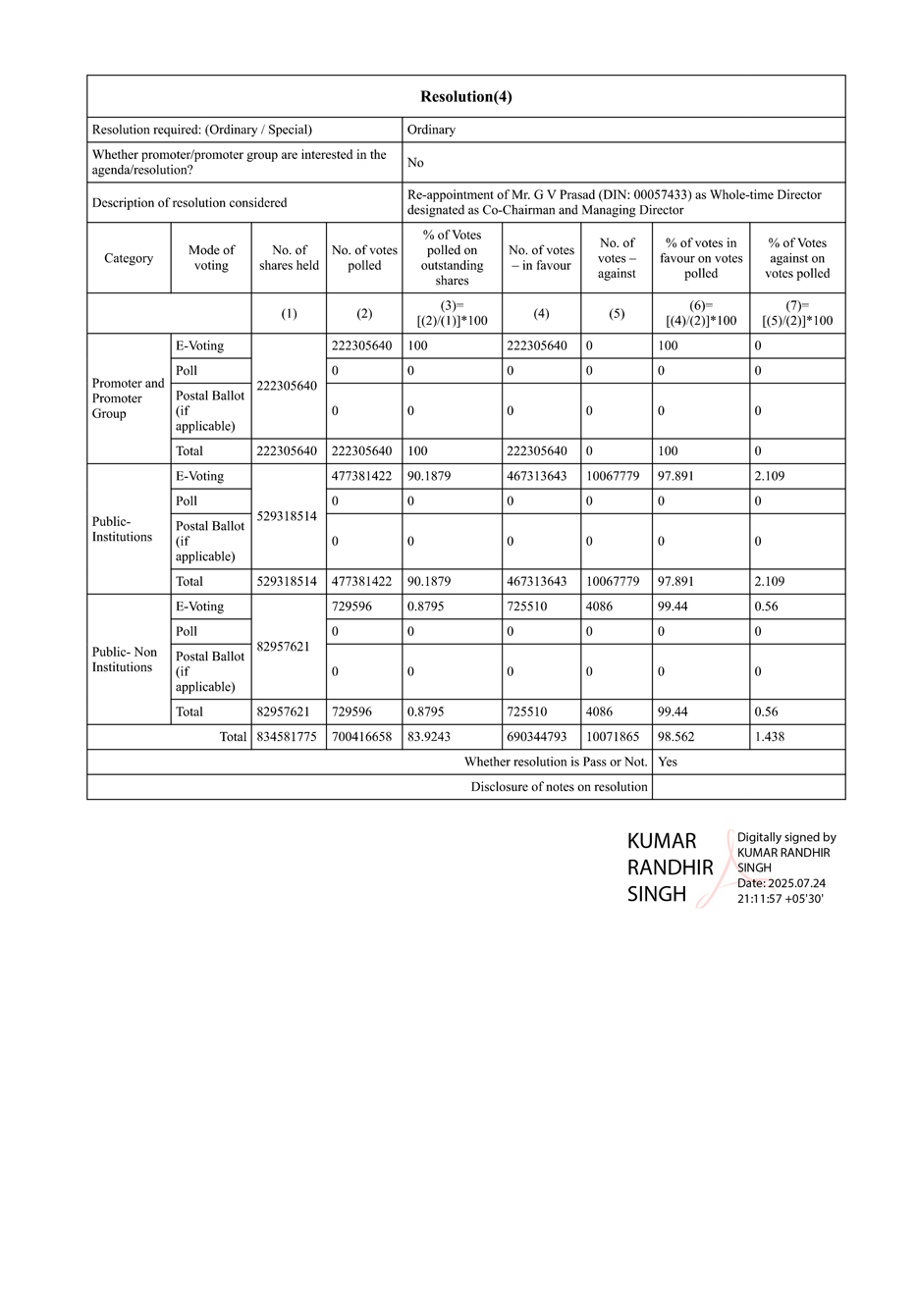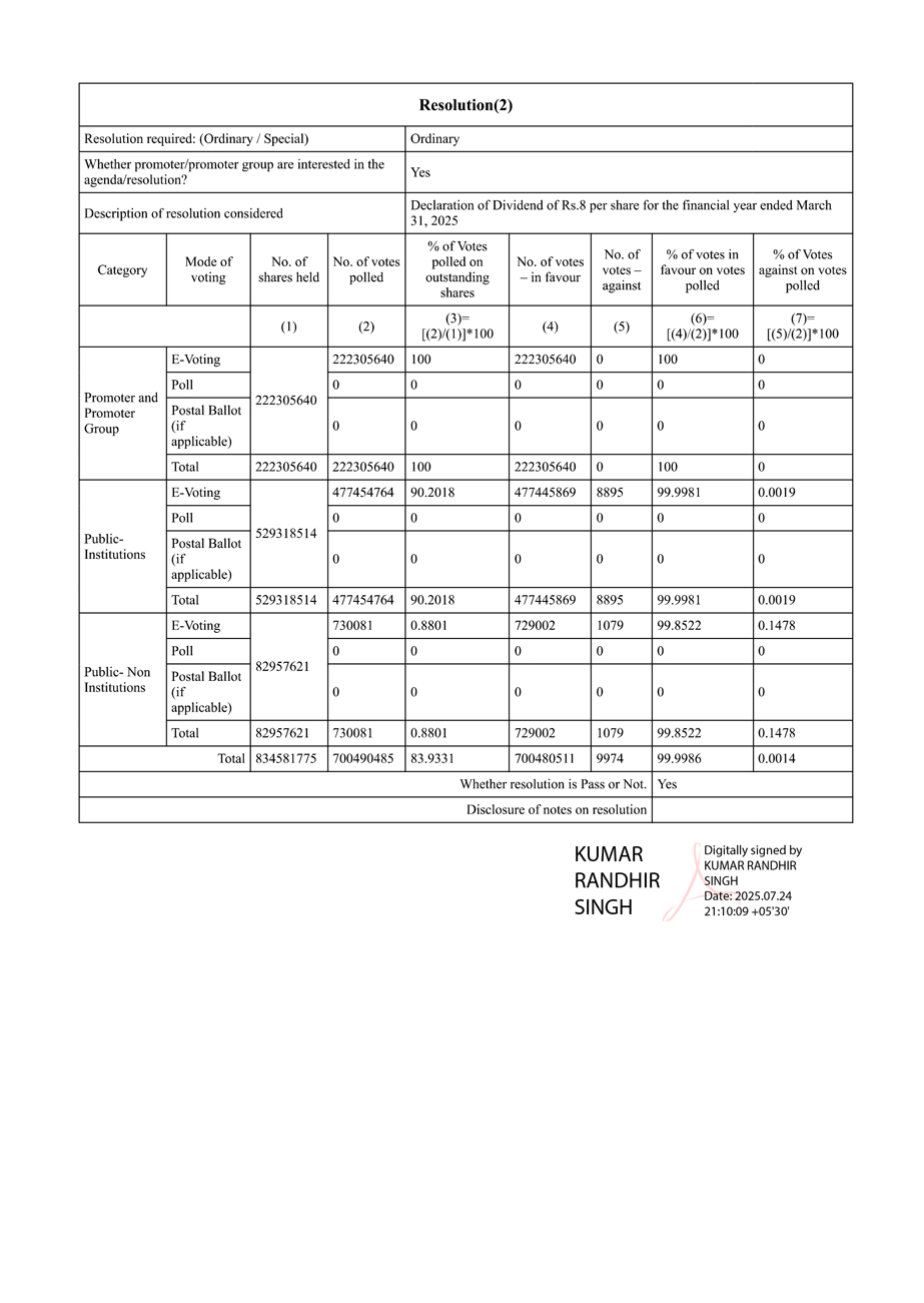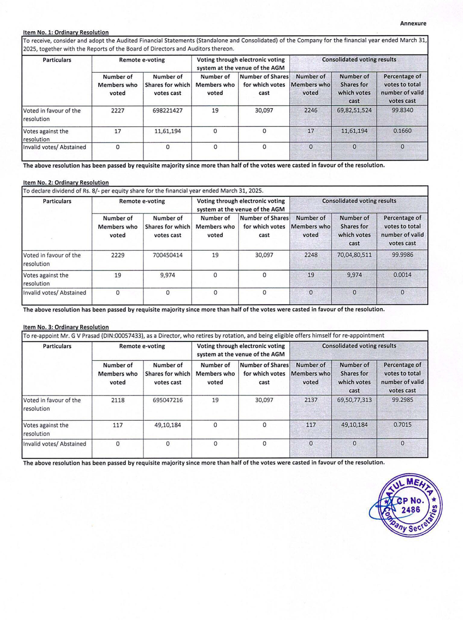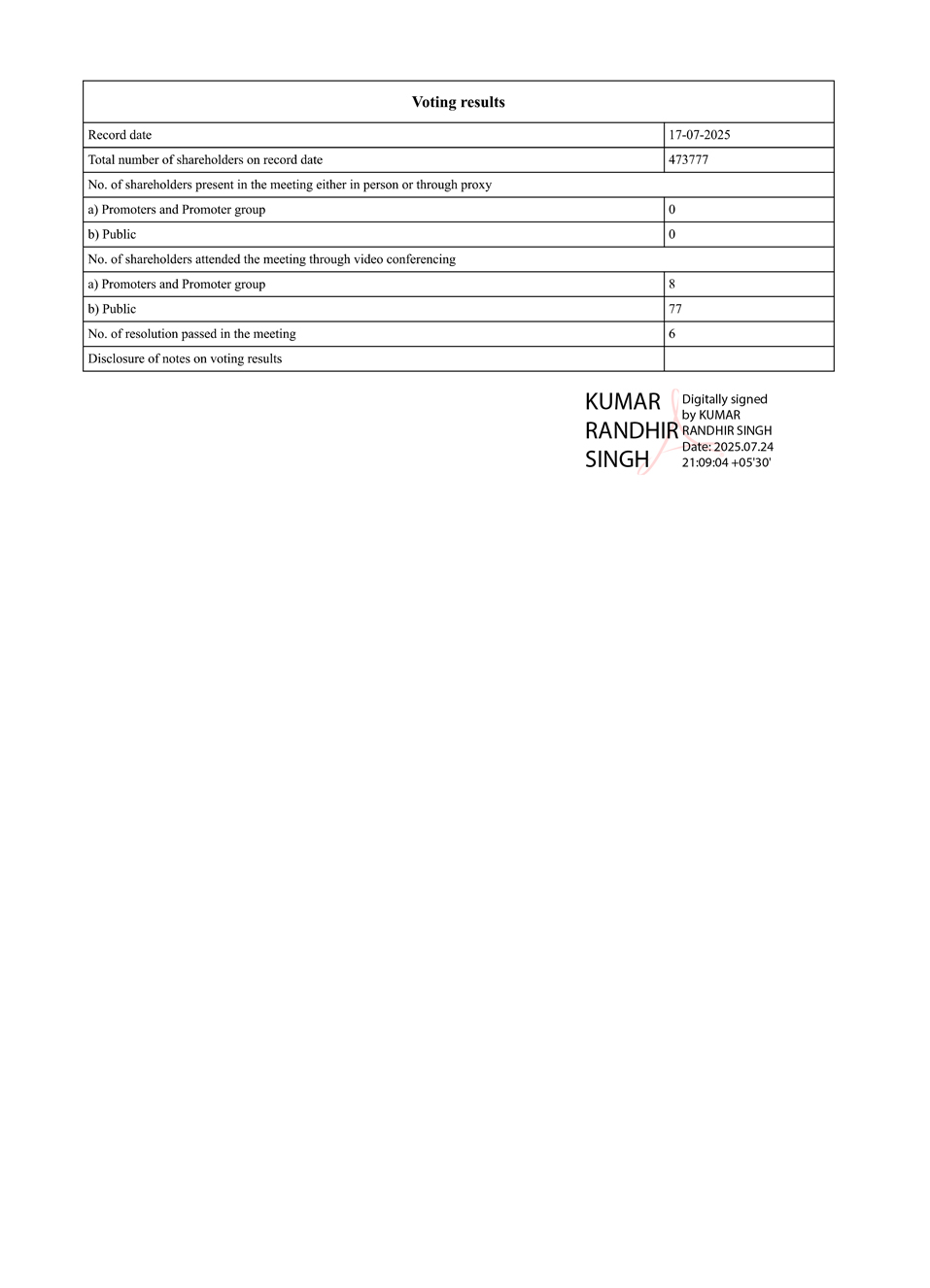 In accordance with Regulation 44 of the SEBI (Listing Obligations and Disclosure Requirements) Regulations, 2015 (SEBI Listing Regulations), this is to inform you that the Members of the Company transacted the business as stated in the Notice of 41st AGM, dated May 09, 2025, through Video Conferencing (VC) /Other Audio Visual Means (OAVM).