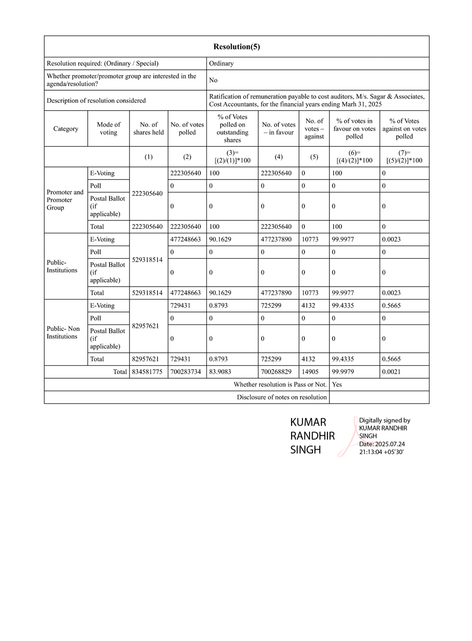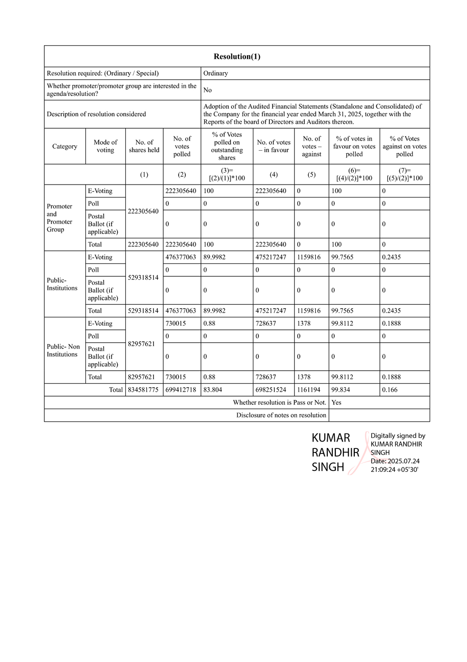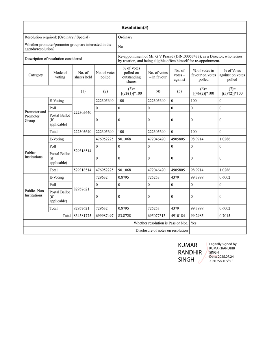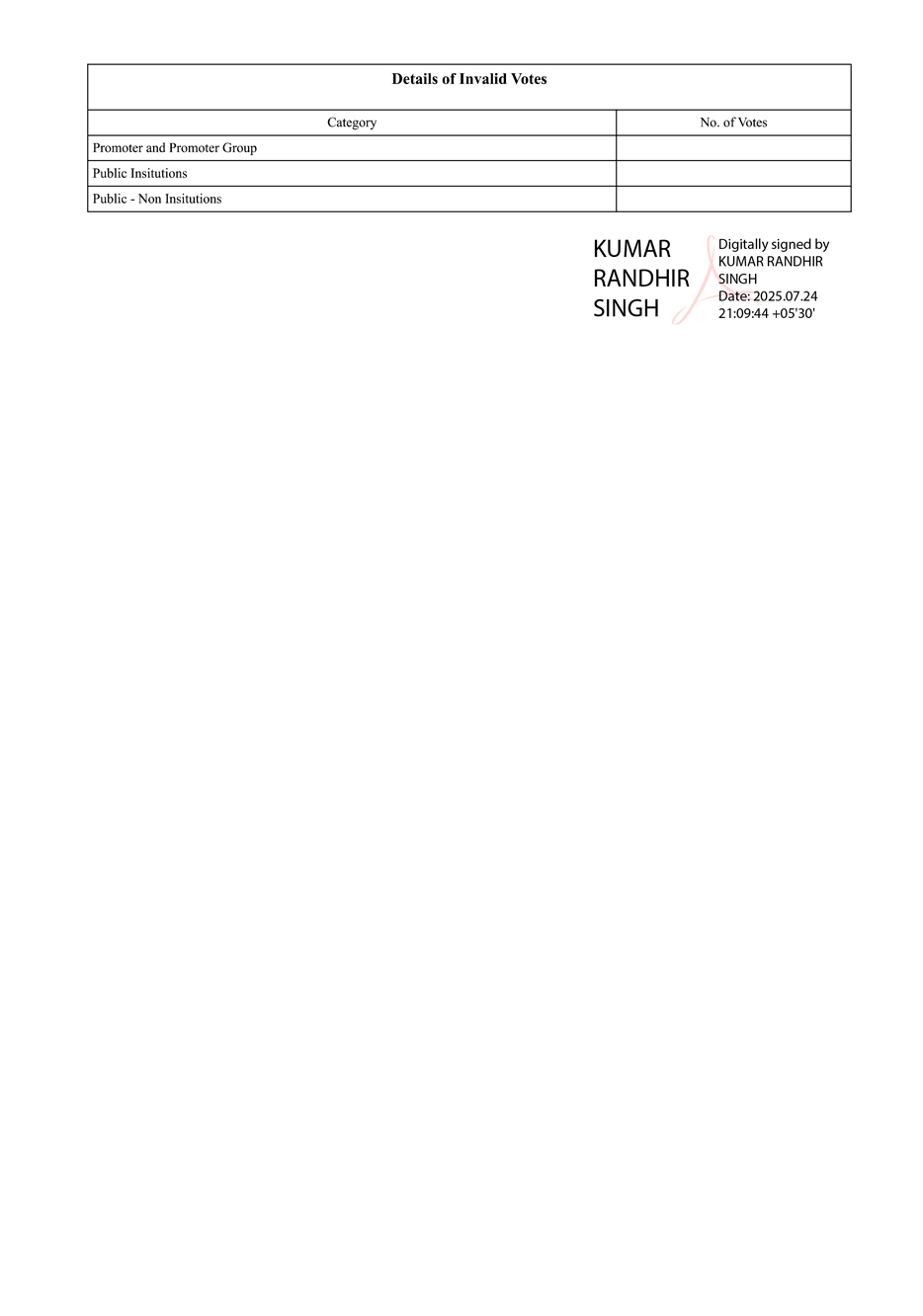In accordance with Regulation 44 of the SEBI (Listing Obligations and Disclosure Requirements) Regulations, 2015 (SEBI Listing Regulations), this is to inform you that the Members of the Company transacted the business as stated in the Notice of 41st AGM, dated May 09, 2025, through Video Conferencing (VC) /Other Audio Visual Means (OAVM).