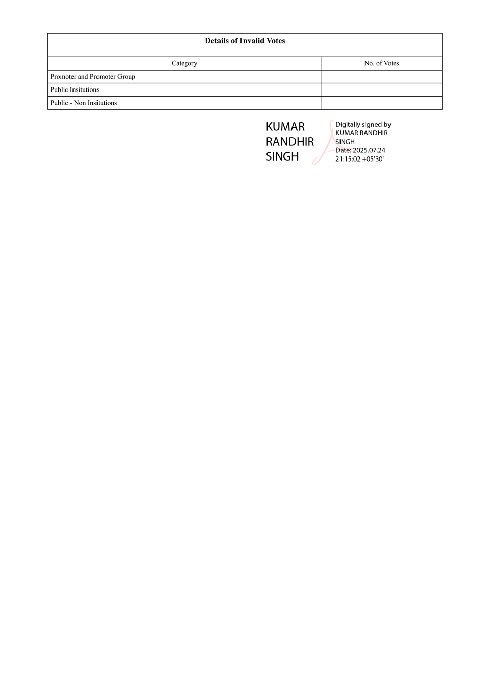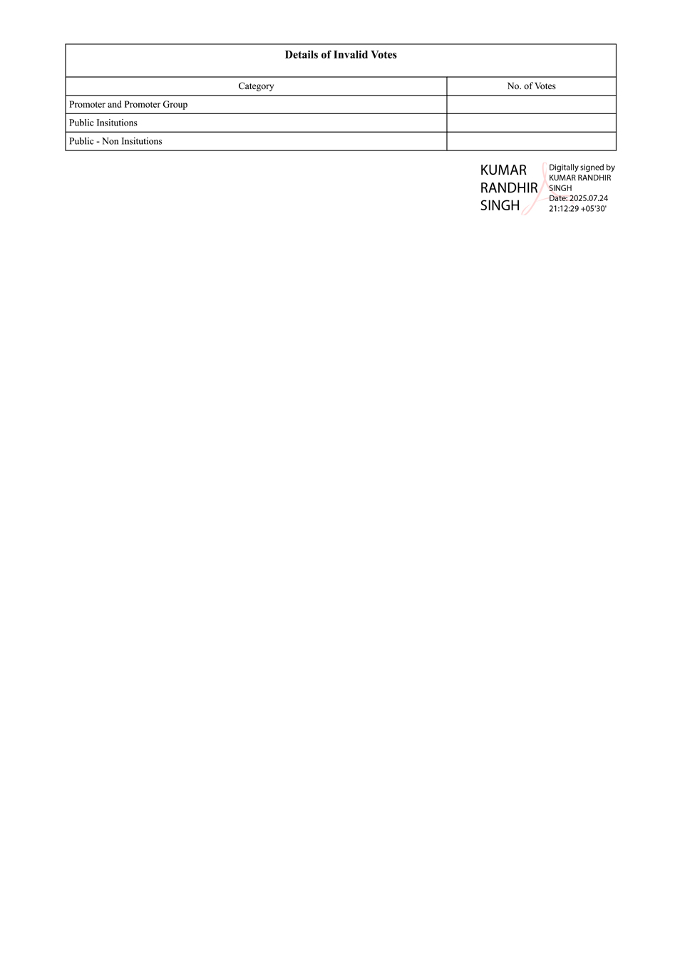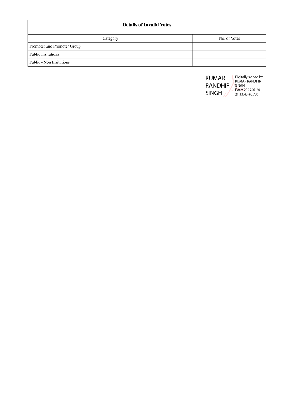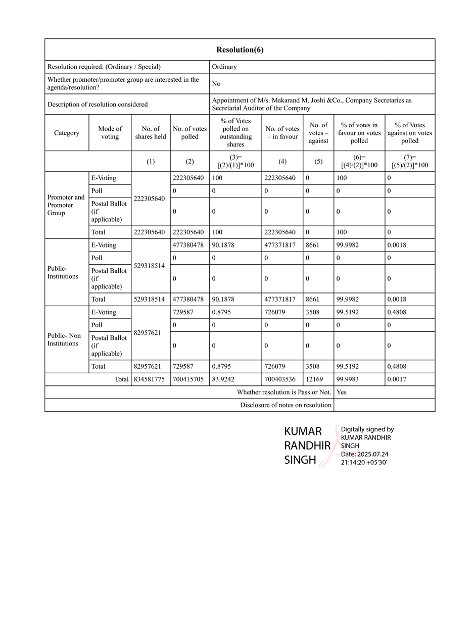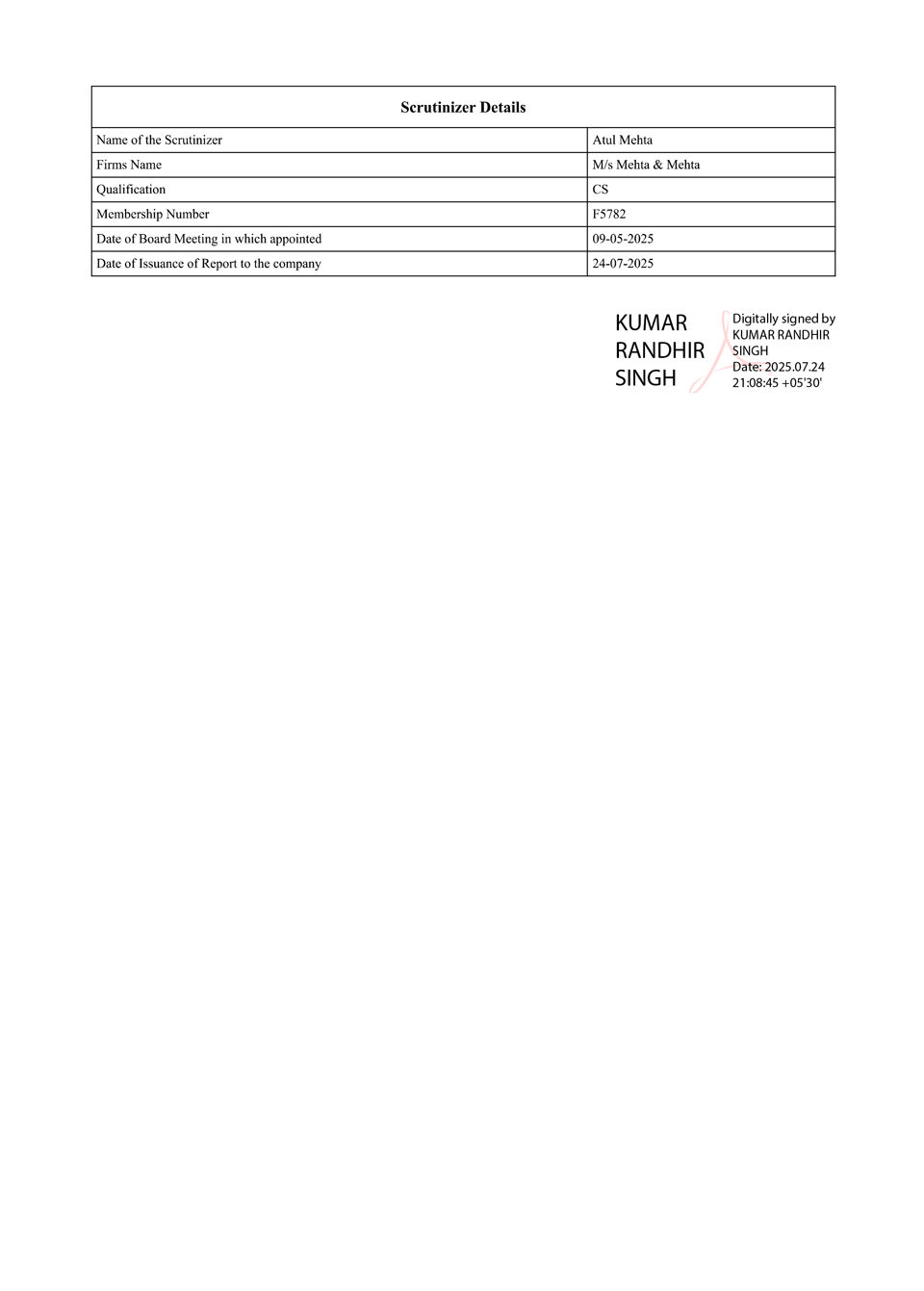 In accordance with Regulation 44 of the SEBI (Listing Obligations and Disclosure Requirements) Regulations, 2015 (SEBI Listing Regulations), this is to inform you that the Members of the Company transacted the business as stated in the Notice of 41st AGM, dated May 09, 2025, through Video Conferencing (VC) /Other Audio Visual Means (OAVM).