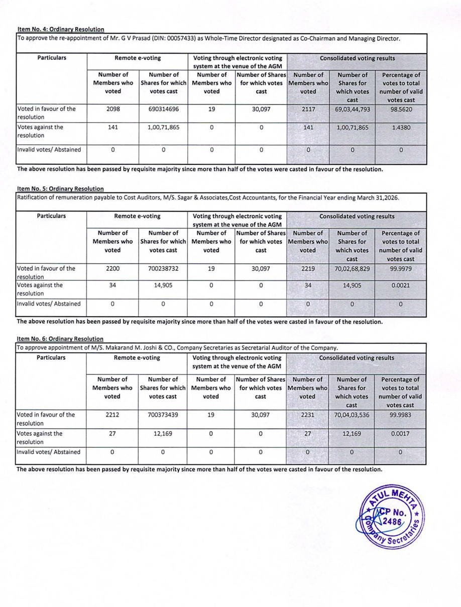 The Scrutinizer’s Report was received, and accordingly all the resolutions as set out in the Notice of the 41st AGM were declared as passed by requisite majority.