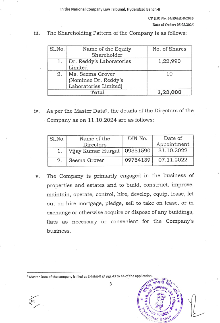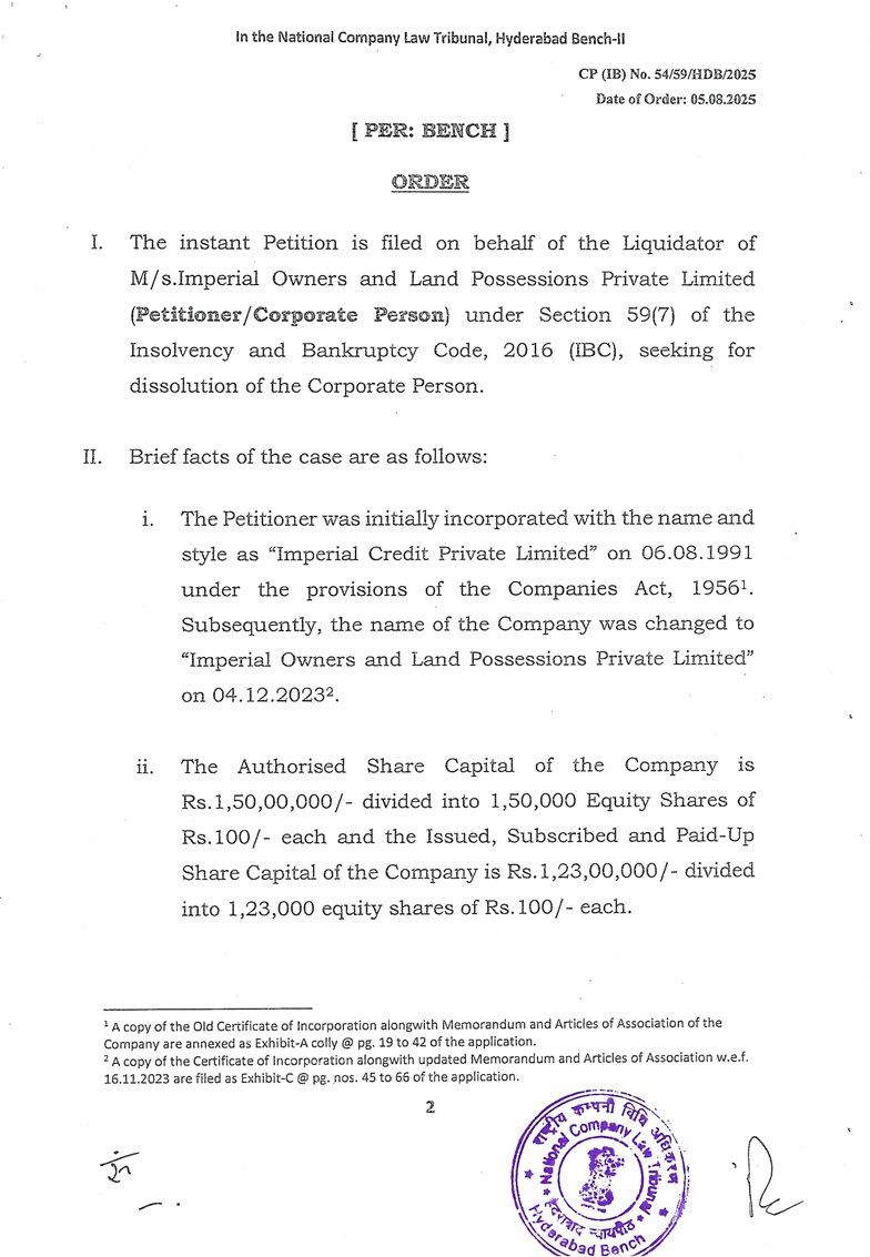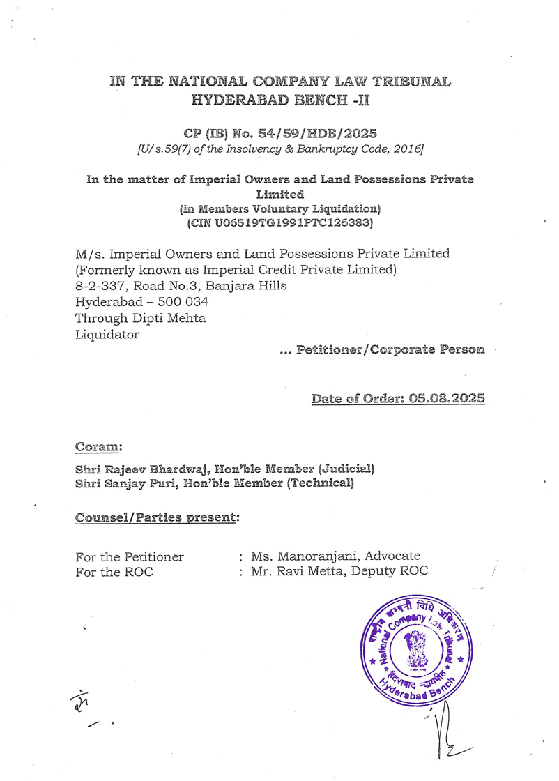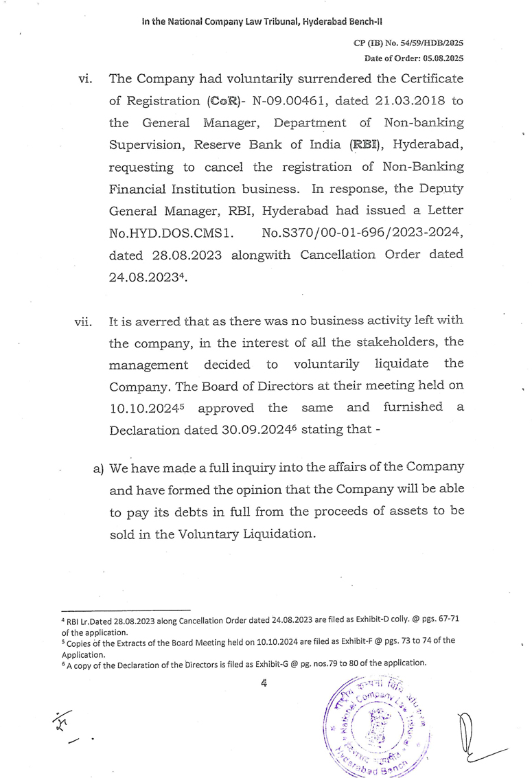 In this regard, we wish to inform you that Hon’ble National Company Law Tribunal (“NCLT”), Hyderabad Bench vide its order dated August 5, 2025 has approved the Voluntary Liquidation of Imperial form the date of said order and as a result Imperial stands dissolved with effect from August 5, 2025. A certified true copy of the order was received by the Company on August 7, 2025 and is enclosed as Annexure.