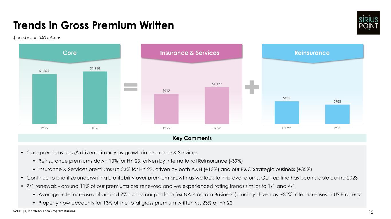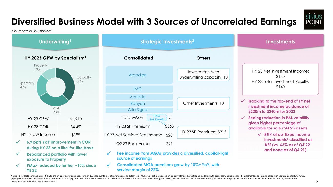 2023 年 6 月 30 日に終了した 6 ヶ月間の中核業績には、2022 年 6 月 30 日に終了した 6 ヶ月間の 4,690 万ドルの利益に対し、2 億 5,550 万ドルの利益が含まれている。2023 年 6 月 30 日に終了した 6 ヶ月間の利益の内訳は、保険引受利益 1 億 8,910 万ドル(コンバインド・レシオ 84.4%)、正味サービス利益 1,640 万ドルであり、2022 年 6 月 30 日に終了した 6 ヶ月間の保険引受利益 2,230 万ドル(コンバインド・レシオ 98.0%)、正味サービス利益 2,460 万ドルであった。正味保険引受成績の改善は主に、前年度の支払備金の積立てが良好であったこと、異常災害損害が減少したこと、および経費率(手数料率およびその他の保険引受費用率の両方)が良好であったことにより、保険引受利益が増加したことによるものである。2023 年 6 月 30 日に終了した 6 ヶ月間の正味事業利益には、2022 年 6 月 30 日に終了した 6 ヶ月間の損失が 0.8 百万ドルであったのに対し、戦略的投資からの正味投資損失が 8.0 百万ドル含まれている。
