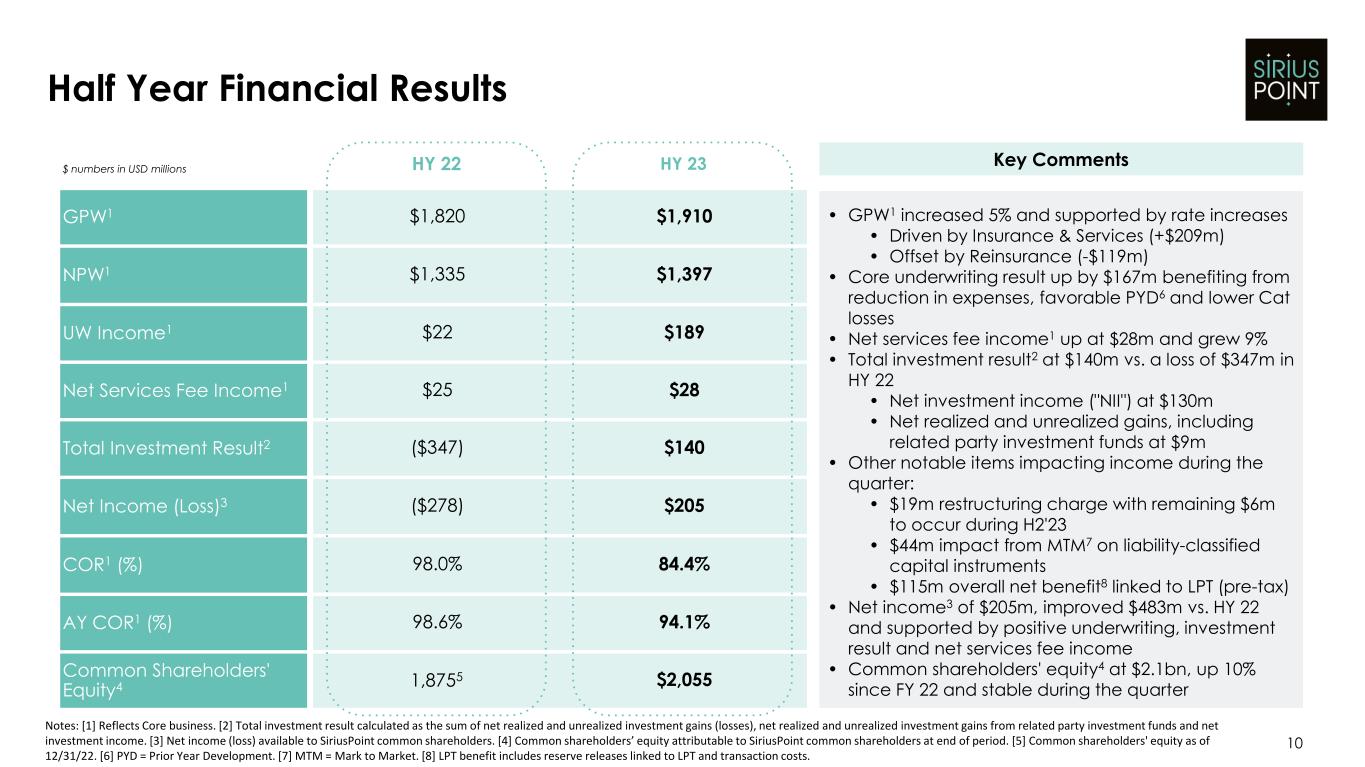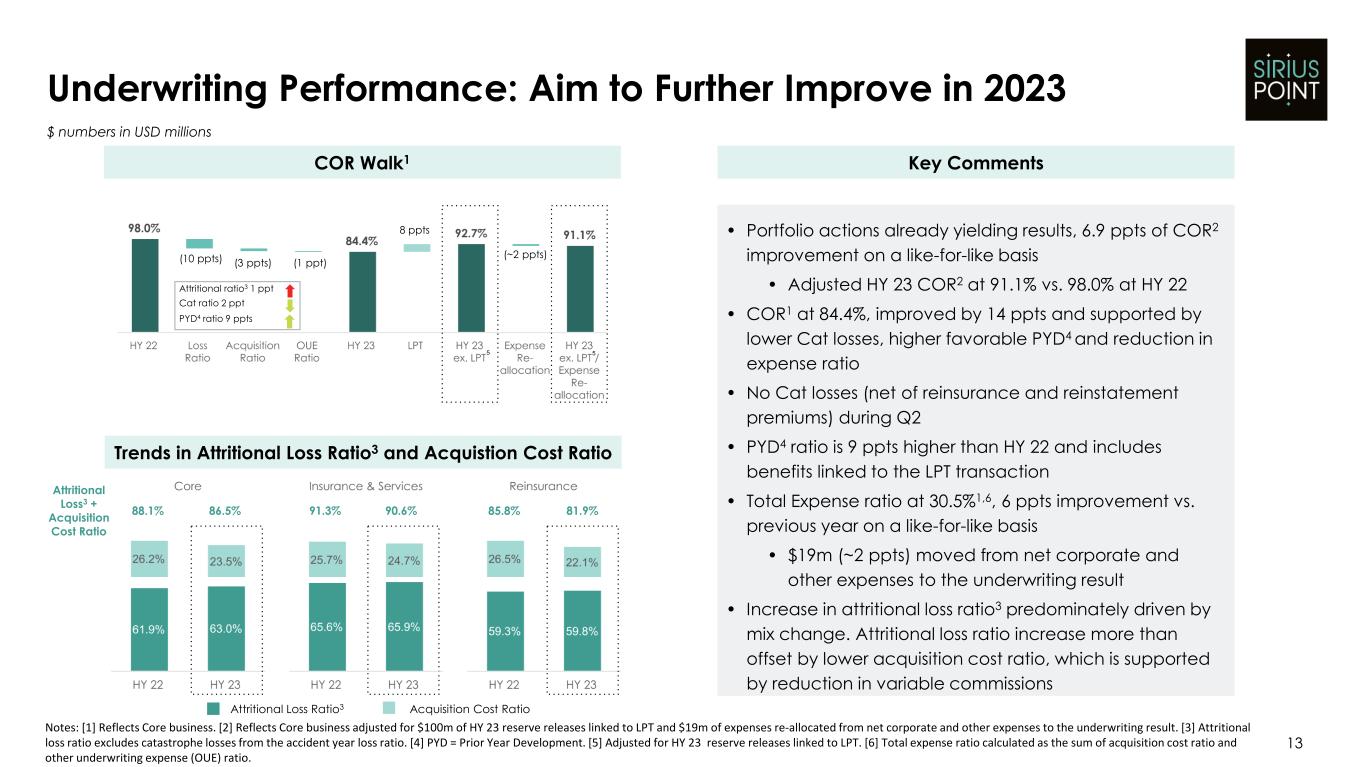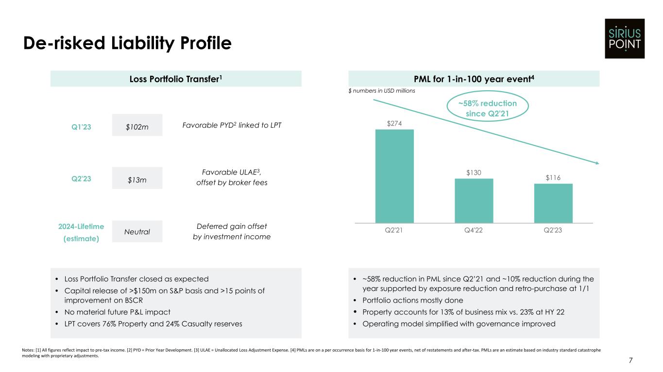 発生した損害には、2023 年 6 月 30 日に終了した 6 ヶ月間の 1 億 1,710 万ドルの支払備金の積み増しが含まれ、2022 年 6 月 30 日に終了した 6 ヶ月間の支払備金の積み増しは 650 万ドルであった。この良好な前期支払備金の積み増しは、主に、2023 年 6 月 30 日まで引き続き良好な報告損害が発生し たことを経営陣が備金の最善の見積りに反映させた結果であり、この見積りは外部再保険会社からの 2023 年 LPT の価格設定によりさらに有効性が高まったことに加え、2023 年 LPT の条件によりシリウスポイントが管理しなくなる保険金請求に関連する未割当の損害調 整費用備金を削減したことによるものです。