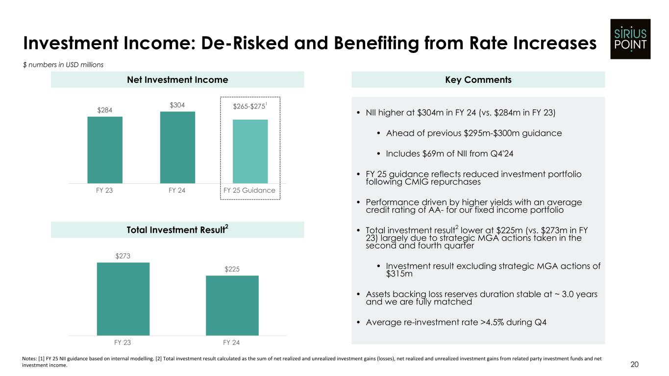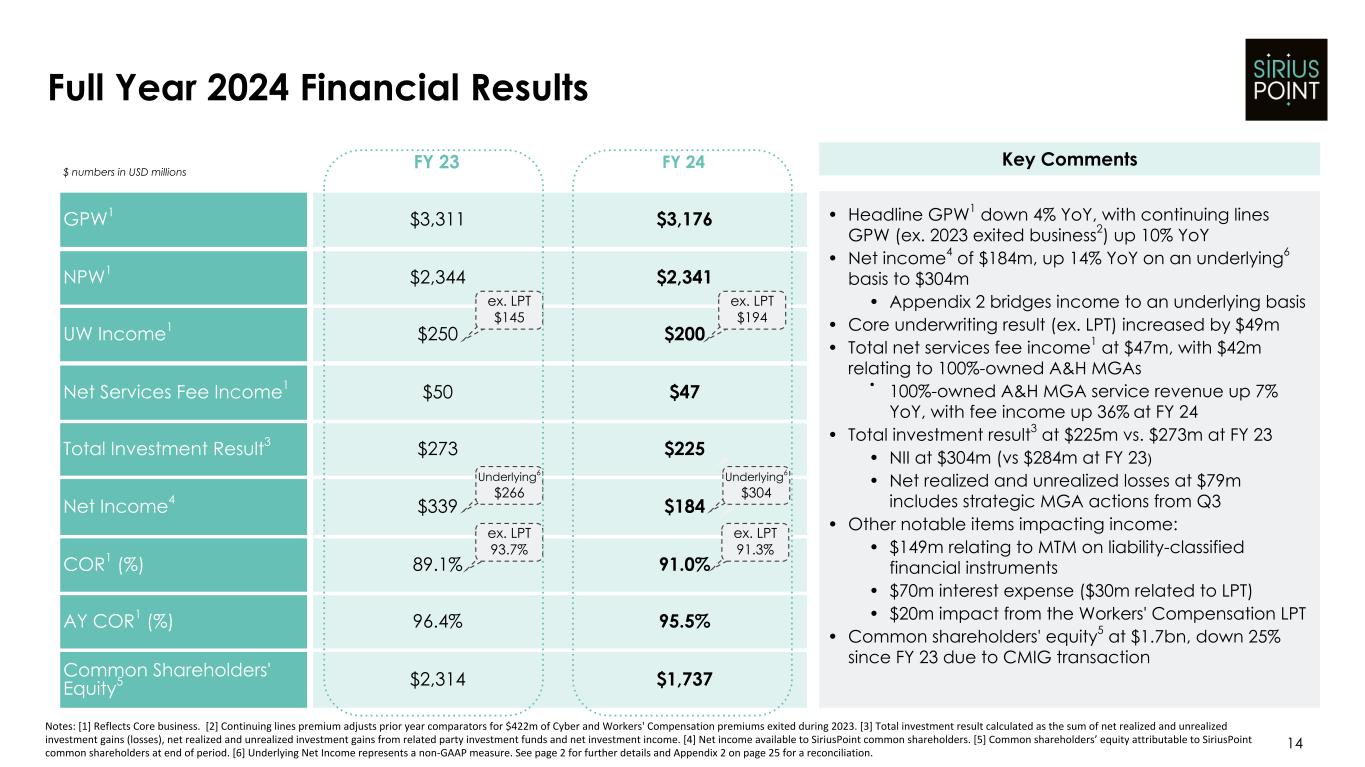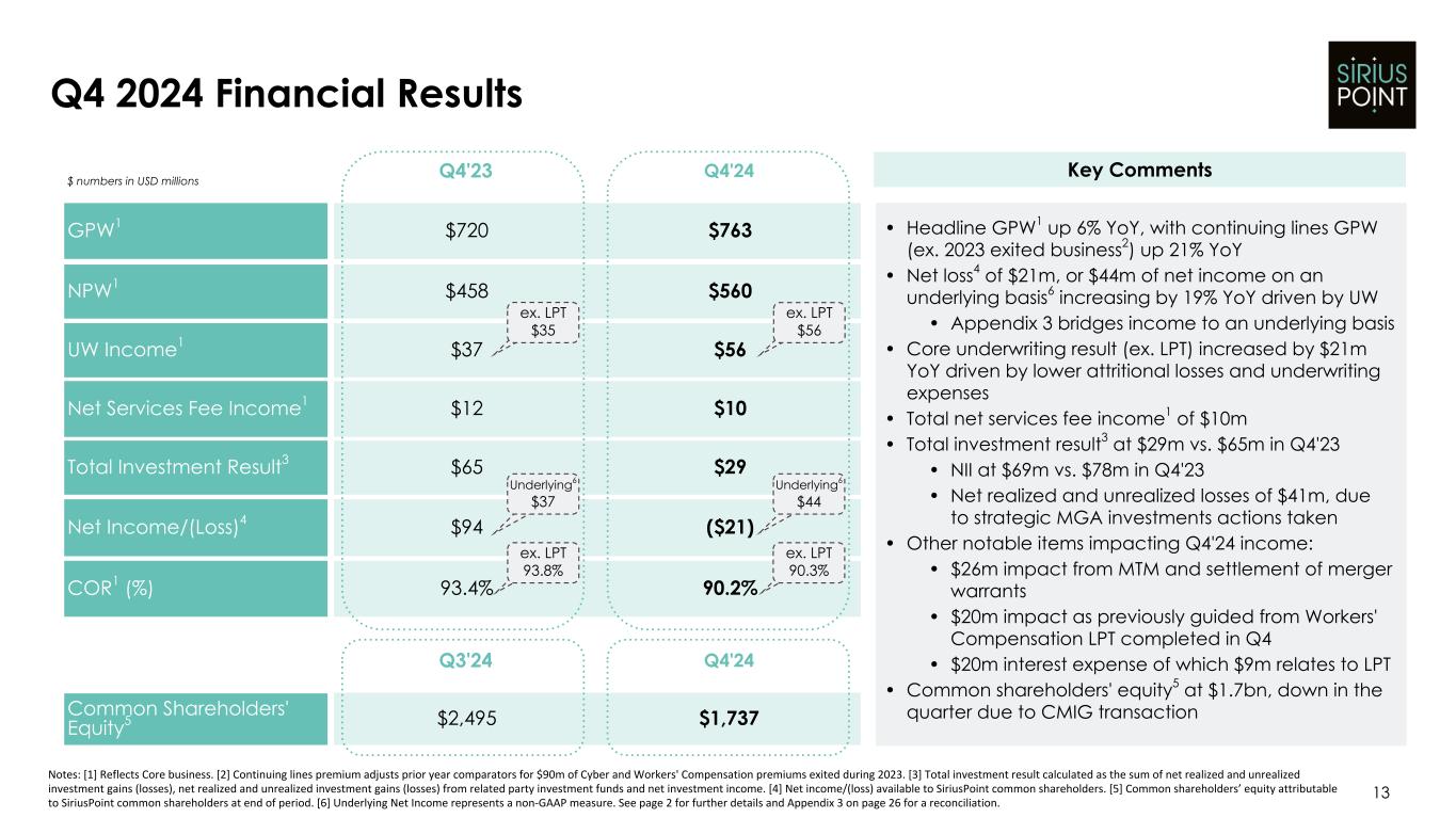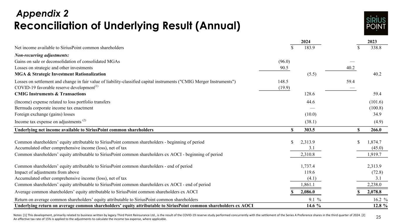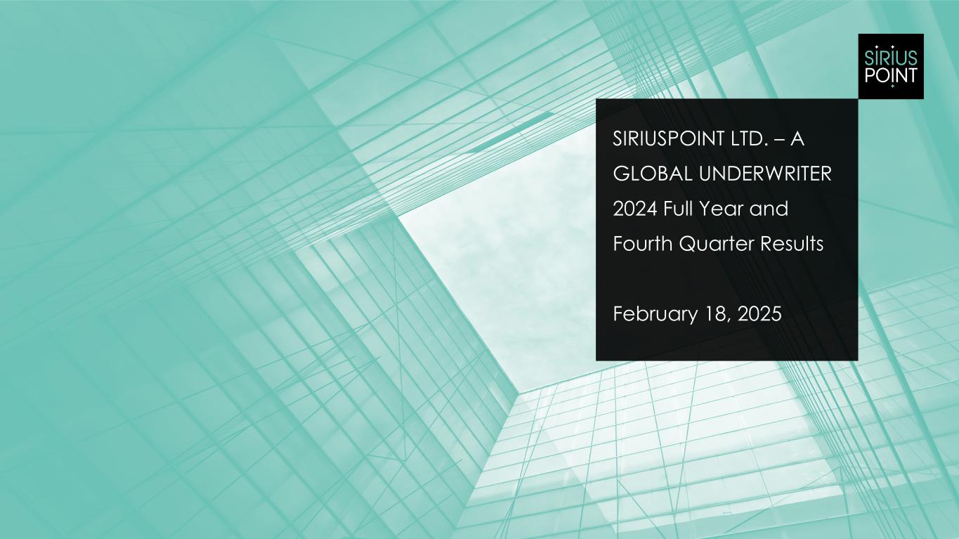 バミューダ諸島ハミルトン、2025 年 2 月 18 日 - シリウスポイント社(SiriusPoint Ltd. 以下「当社」)は本日、2024 年 12 月 31 日をもって終了した第 4 四半期の業績を発表した。(NYSE:SPNT)は本日、2024年12月31日を期末とする第4四半期の業績を発表しました。