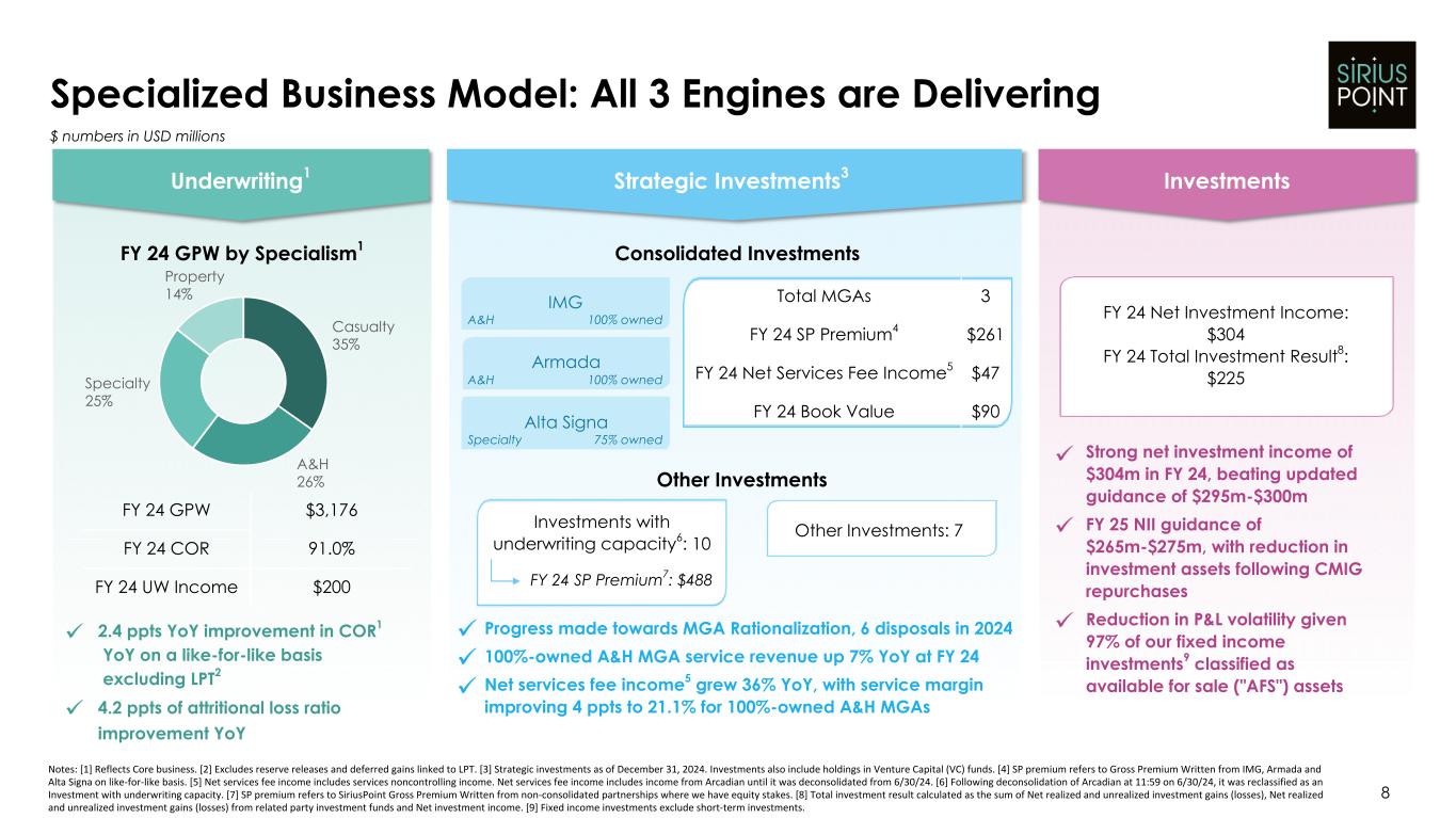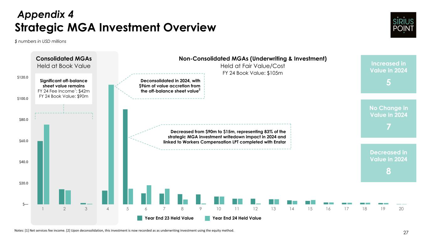 2024年12月31日現在、当社は20の事業体(マネージング・ゼネラル・エージェント(MGA)、インシュアテック、その他)に出資している。当社は引き続きMGA出資持分の合理化を進め、連結MGAのオフバランスにおける重要な価値を実現しており、うち6社は2024年に合理化する予定である。2024年12月31日現在の連結MGA3社の帳簿価額は9,010万ドルで、2023年12月31日時点では7,630万ドルであった(2024年6月30日に連結から除外したアルカディアン・リスク・キャピタル社を除く)。