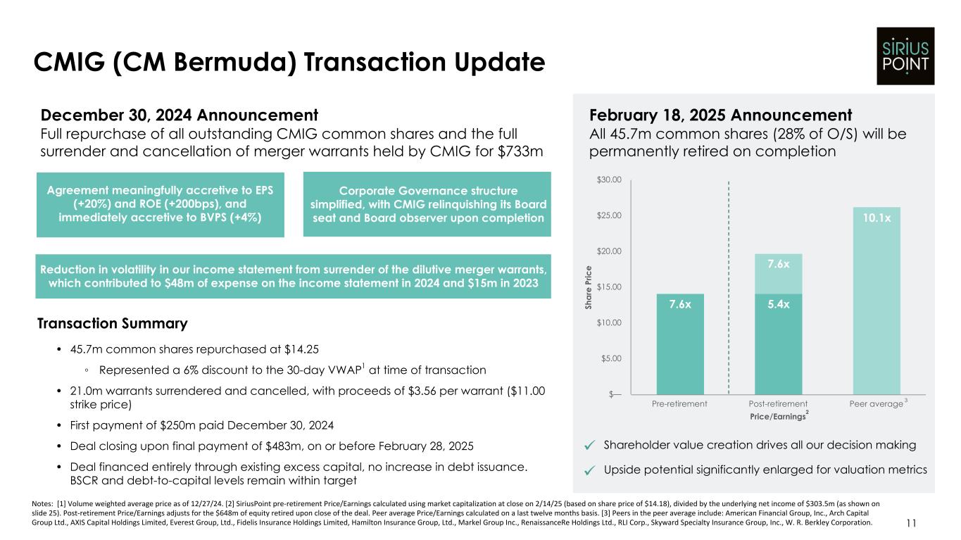 -取引完了時にCMバミューダから買い戻した普通株式4,570万株の永久消却により、1株当たり利益が20%以上増加する。