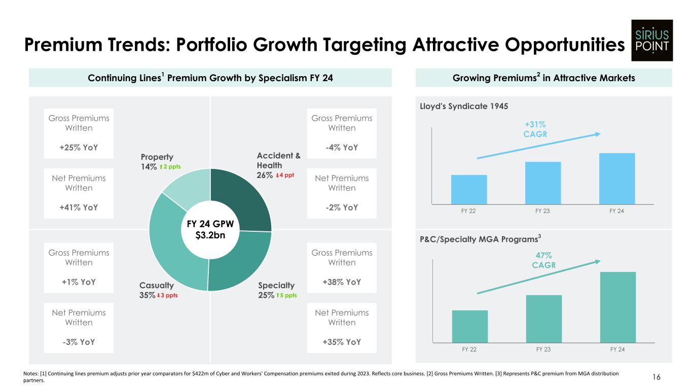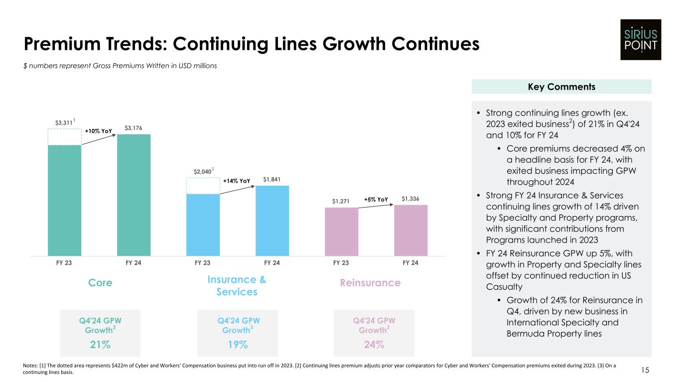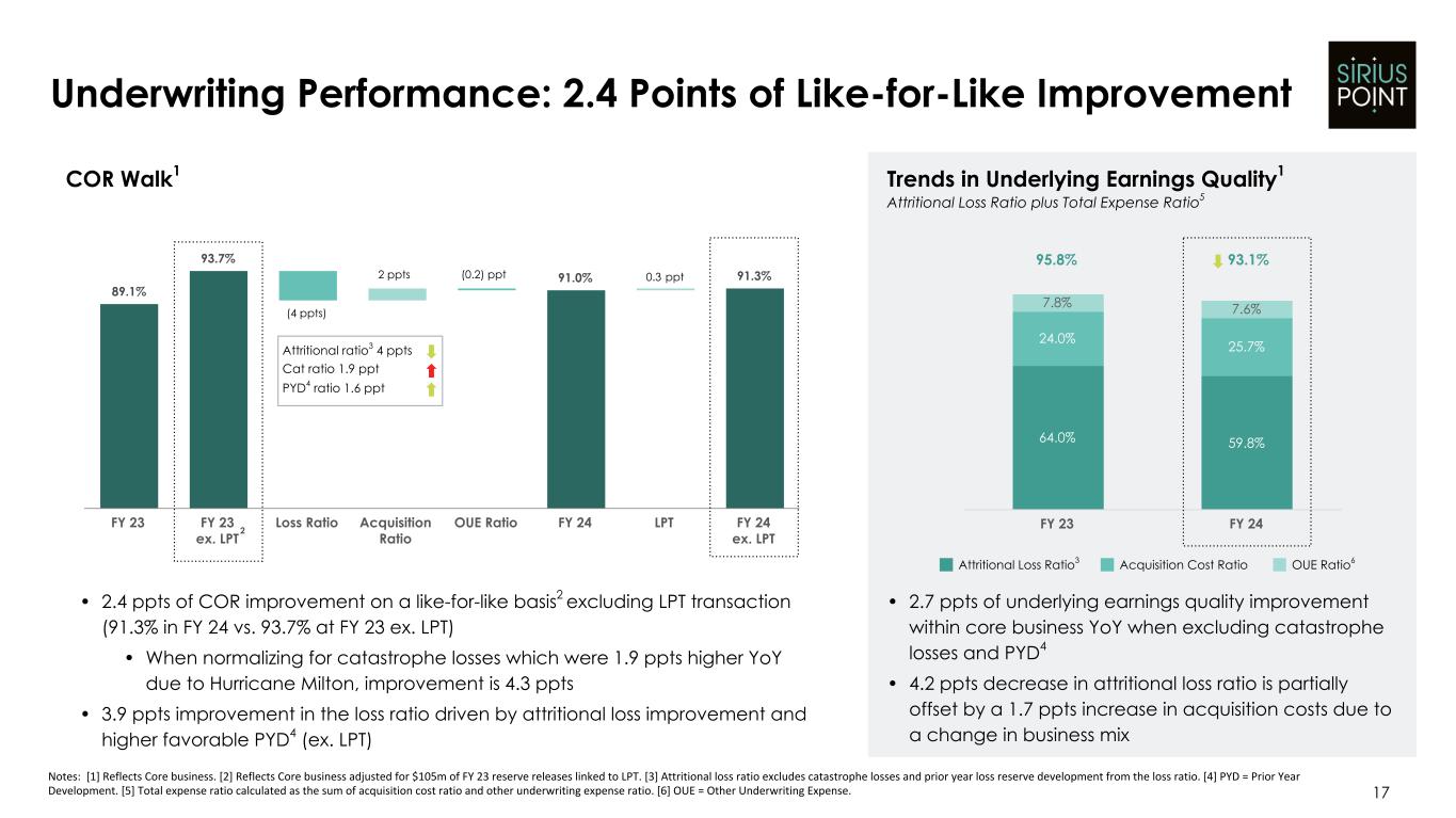 スコット・イーガン最高経営責任者(CEO)は次のように述べた:「2024 年はシリウスポイントにとって目覚ましい業績を達成した年となりました。キャタストロフが増加したにもかかわらず、2023年の損害ポートフォリオ移管による影響を除いたコアコンバインドレシオは91.0%と、昨年から大幅に改善しました。損害率が4.2 ポイント改善したことは、アンダーライティングの質の向上に注力していることを示すものである。継続事業の収入保険料は、当四半期で 21%、通期で 10%の伸びを示しました。