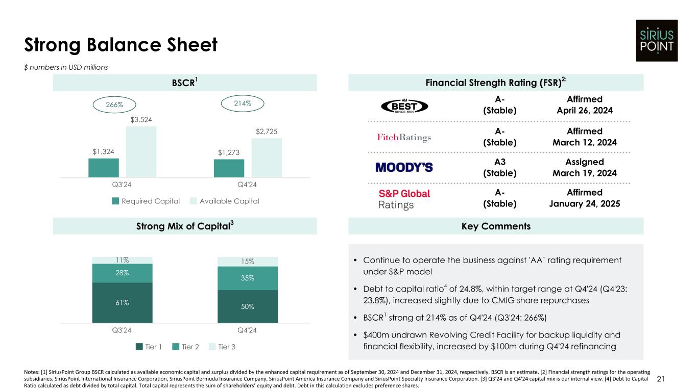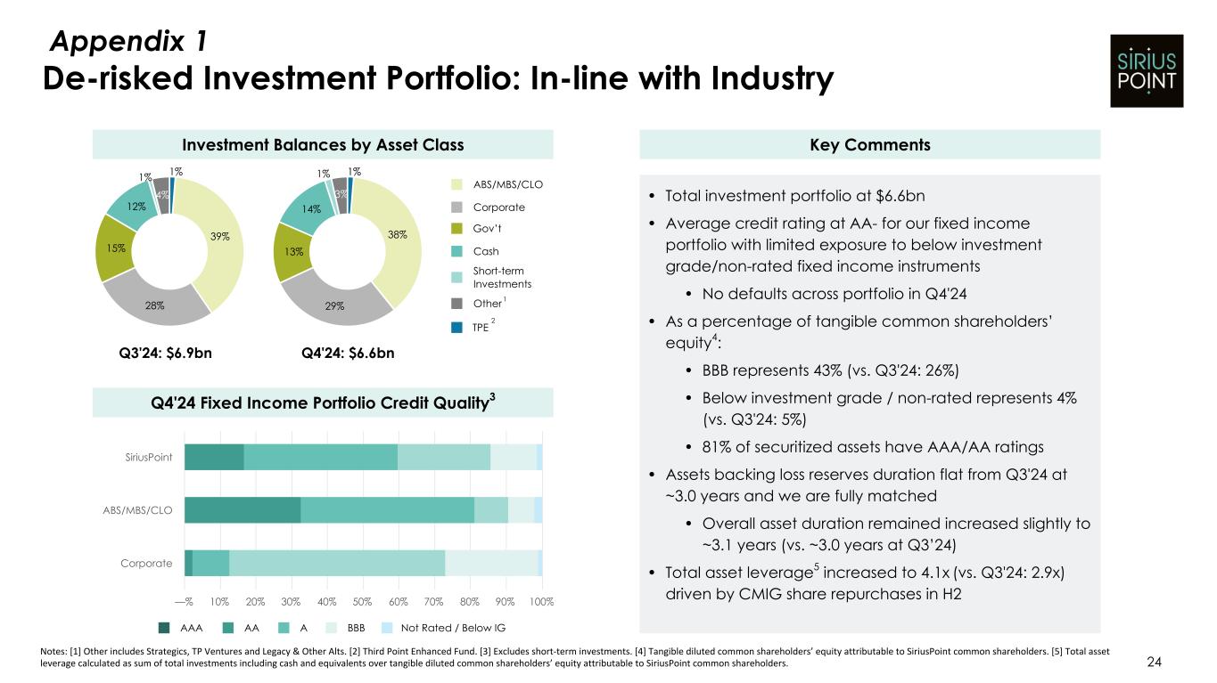 -希薄化後普通株式1株当たり純資産(AOCI控除後)は14.64ドルで、前期比2.7%増、2023年12月31日比9.8%増。CMバミューダ取引後のバランスシートは引き続き強固で、24年第4四半期のBSCR予想は214%。