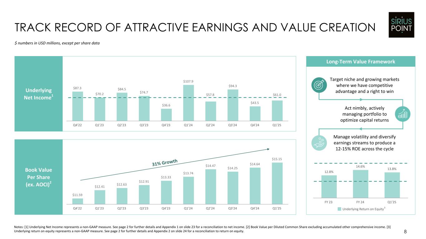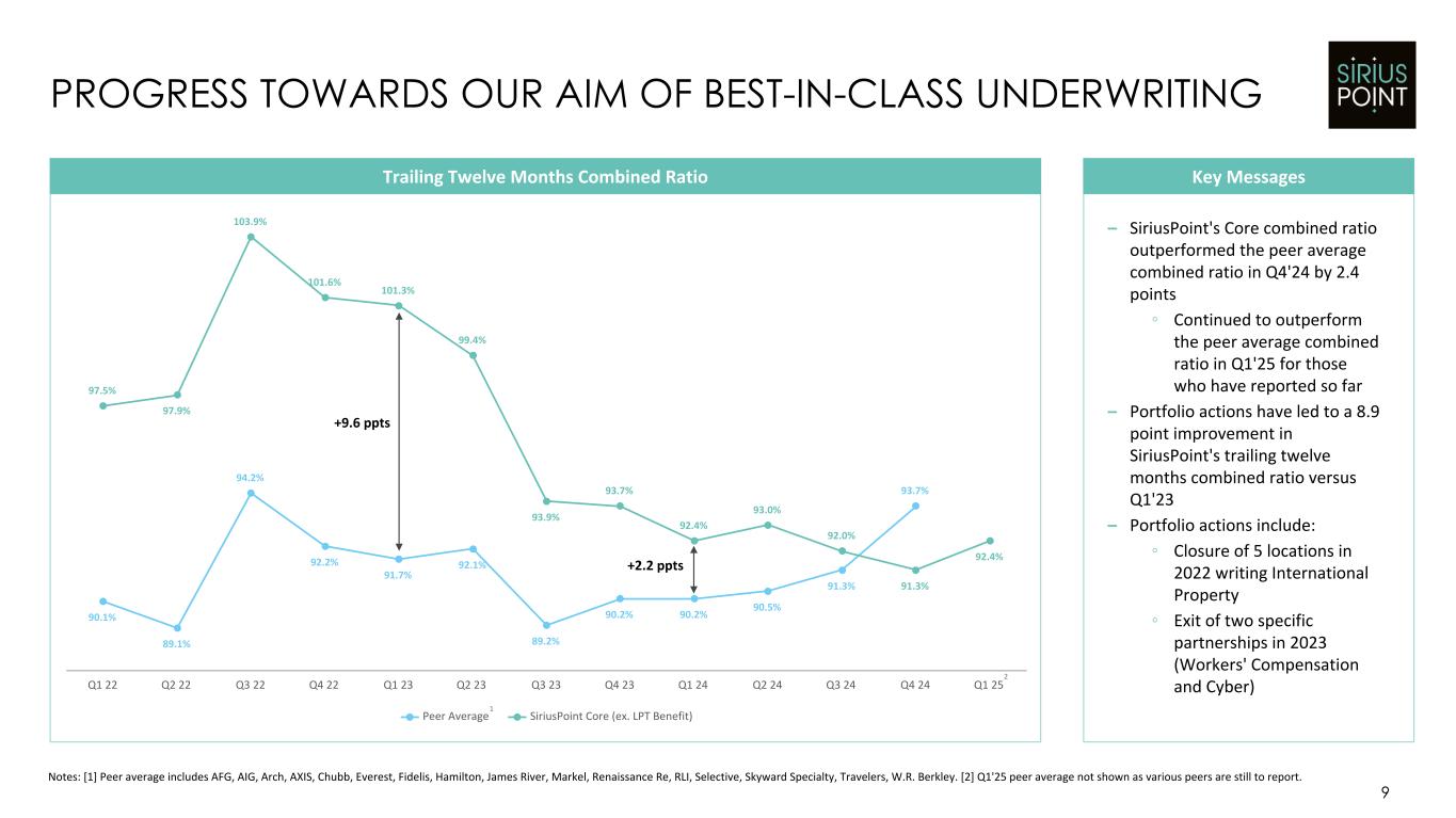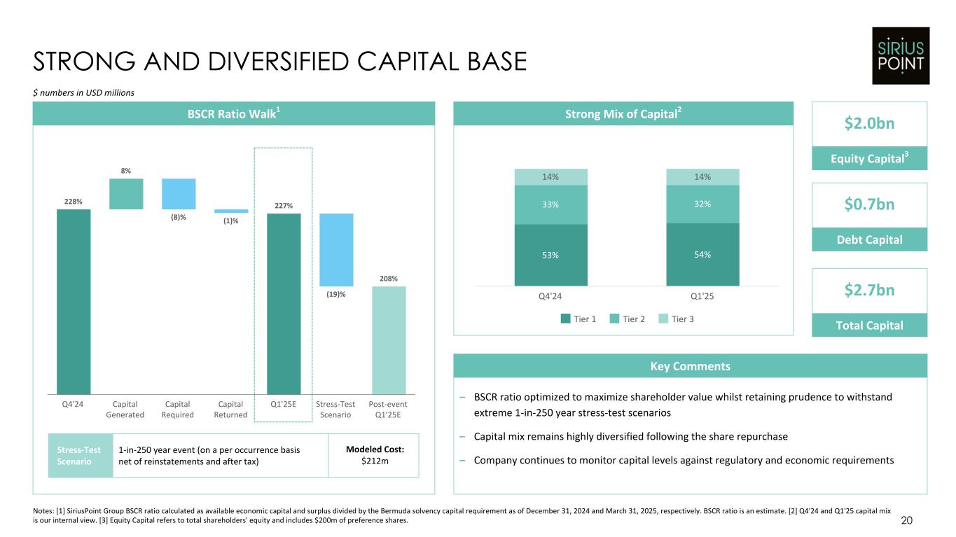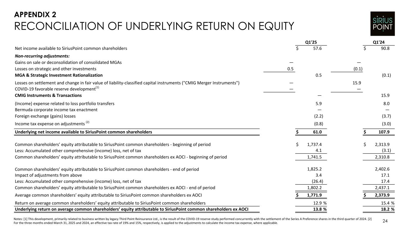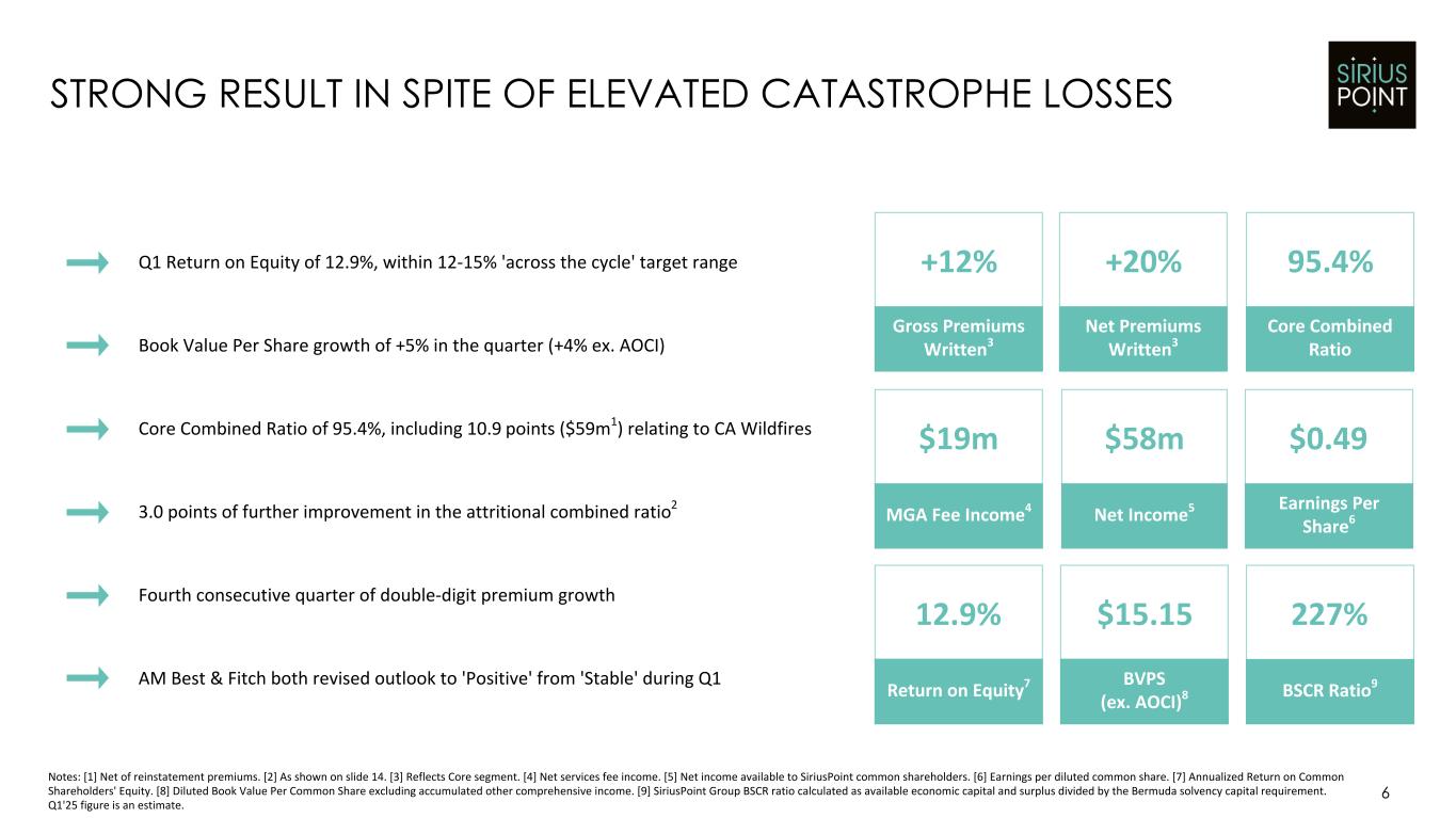 2025年5月5日、バミューダ、ハミルトン発 - シリウスポイント社(SiriusPoint Ltd., NYSE:SPNT)は本日、2025年3月31日に終了した第1四半期の業績を発表した。(NYSE:SPNT)は本日、2025年3月31日に終了した第1四半期の業績を発表しました。