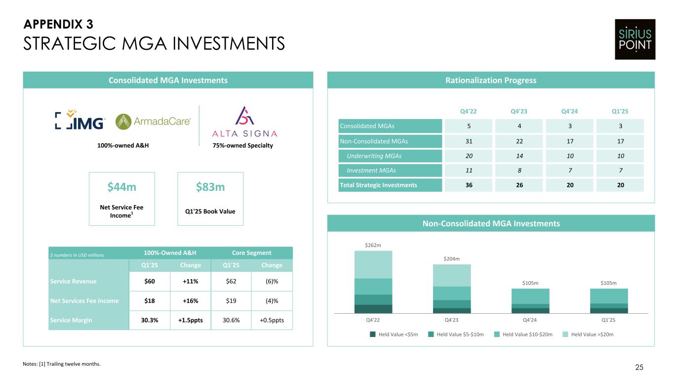 収入保険料は、2024 年 3 月 31 日に終了した 3 ヶ月間の 880.7 百万ドルに対し、2025 年 3 月 31 日に終了した 3 ヶ月間の 989.9 百万ドルとなり、109.2 百万ドル(12.4%)増加しました。正味収入保険料は、2024 年 3 月 31 日に終了した 3 ヶ月間の 5 億 1,780 万ドルに対し、2025 年 3 月 31 日に終了した 3 ヶ月間の 6 億 2,580 万ドルとなり、1 億 800 万ドル(20.9%)増加しました。保険料収入の増加は、主に保険・サービス事業によるもので、これには A&H 事業の成長、その他スペシャリティ事業におけるシュアティの拡大、国際事業における戦略的な有機的成長および新プログラムの継続的成長が含まれます。