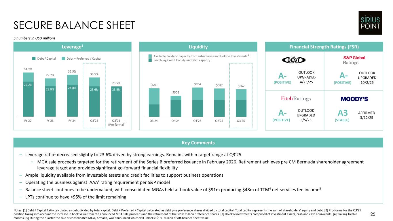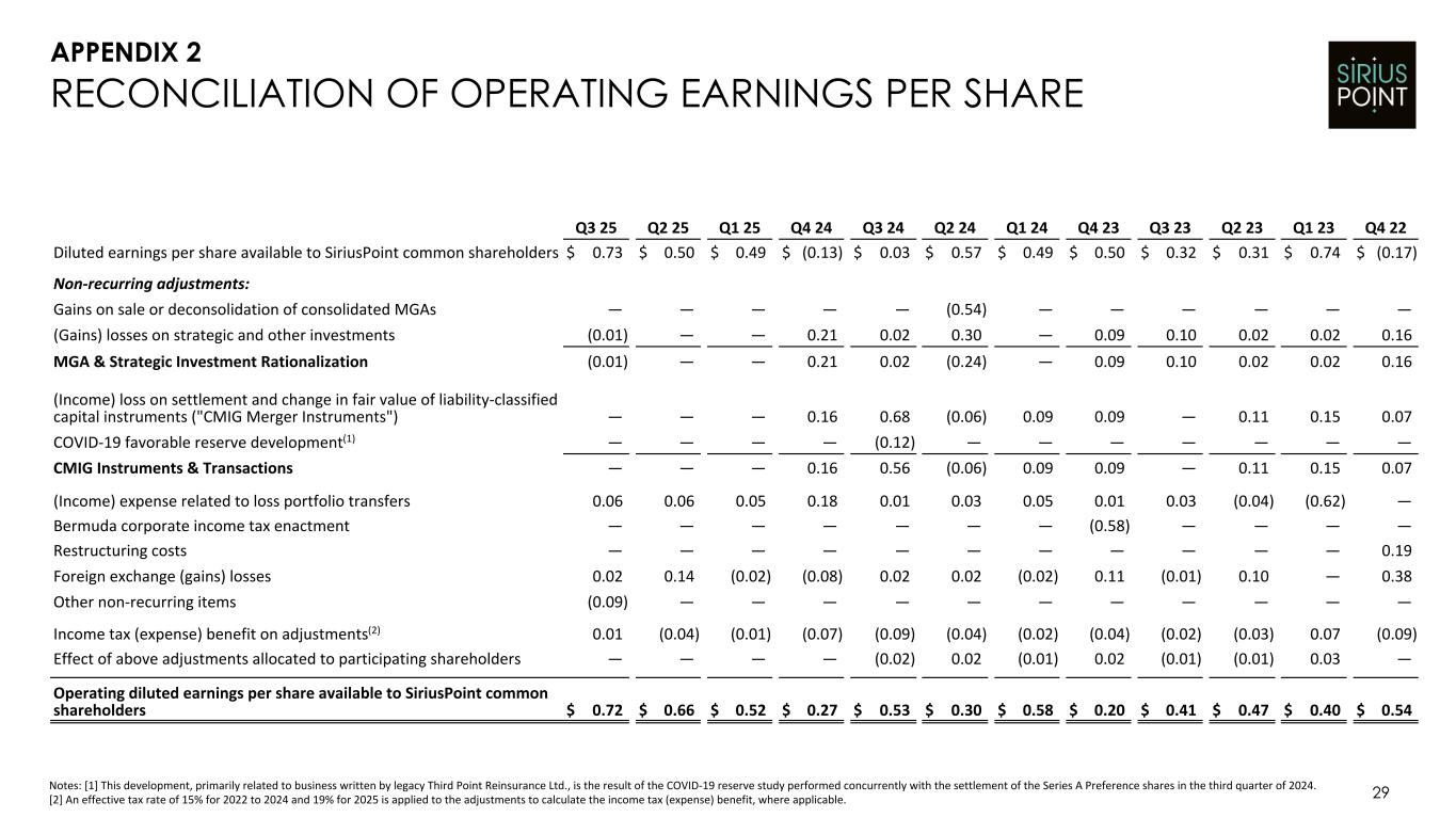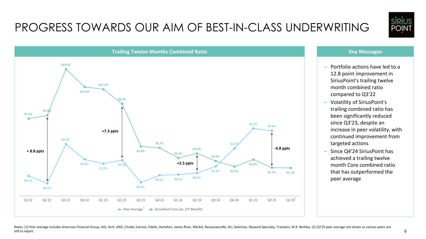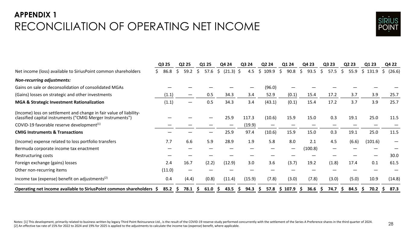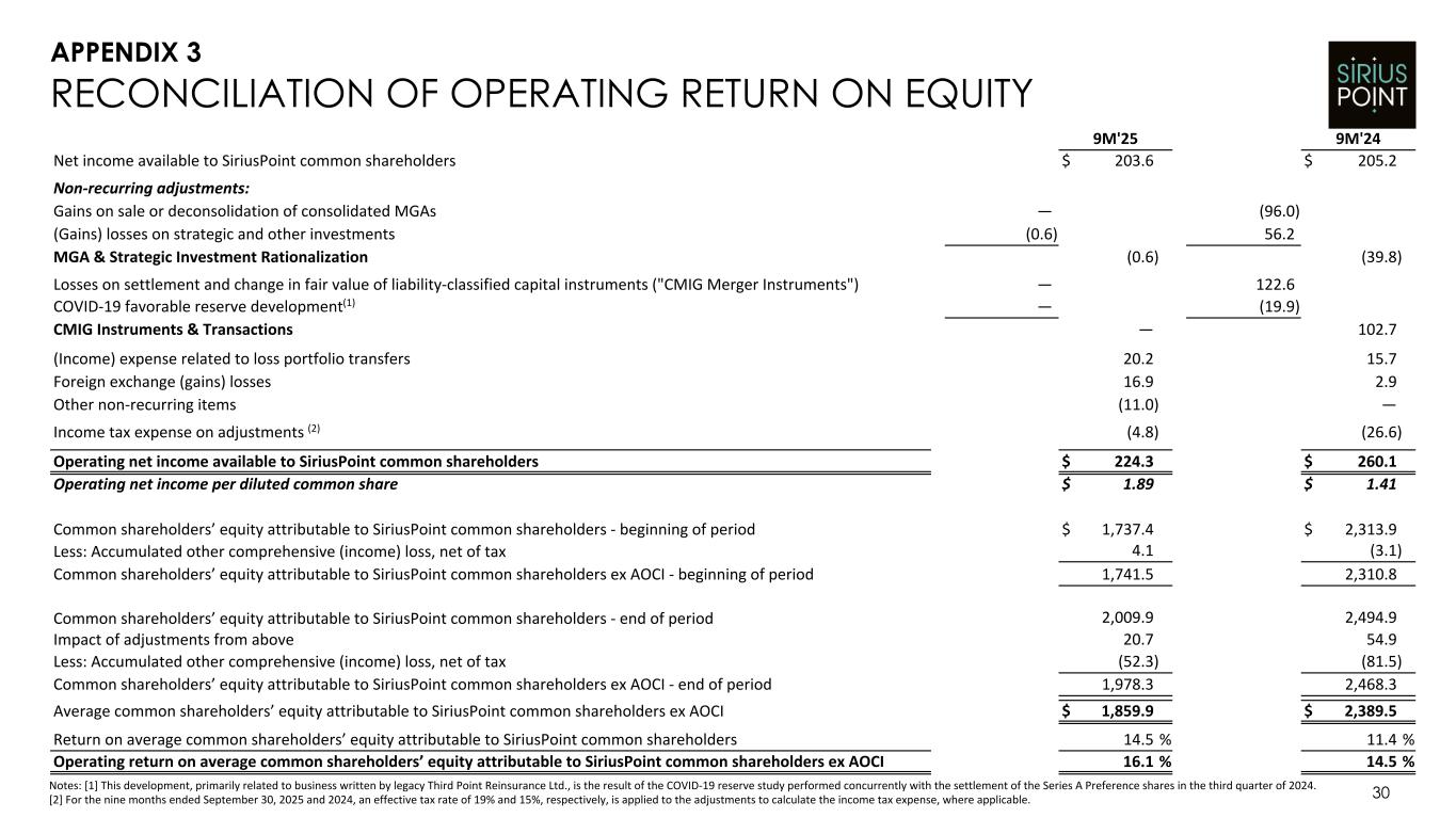 バミューダ諸島ハミルトン、2025 年 10 月 30 日 - シリウスポイント社(SiriusPoint Ltd. 以下「当社」)は本日、2025 年 9 月 30 日をもって終了した第 3 四半期の業績を発表しました。(NYSE:SPNT)は本日、2025年9月30日に終了した第3四半期の業績を発表しました。