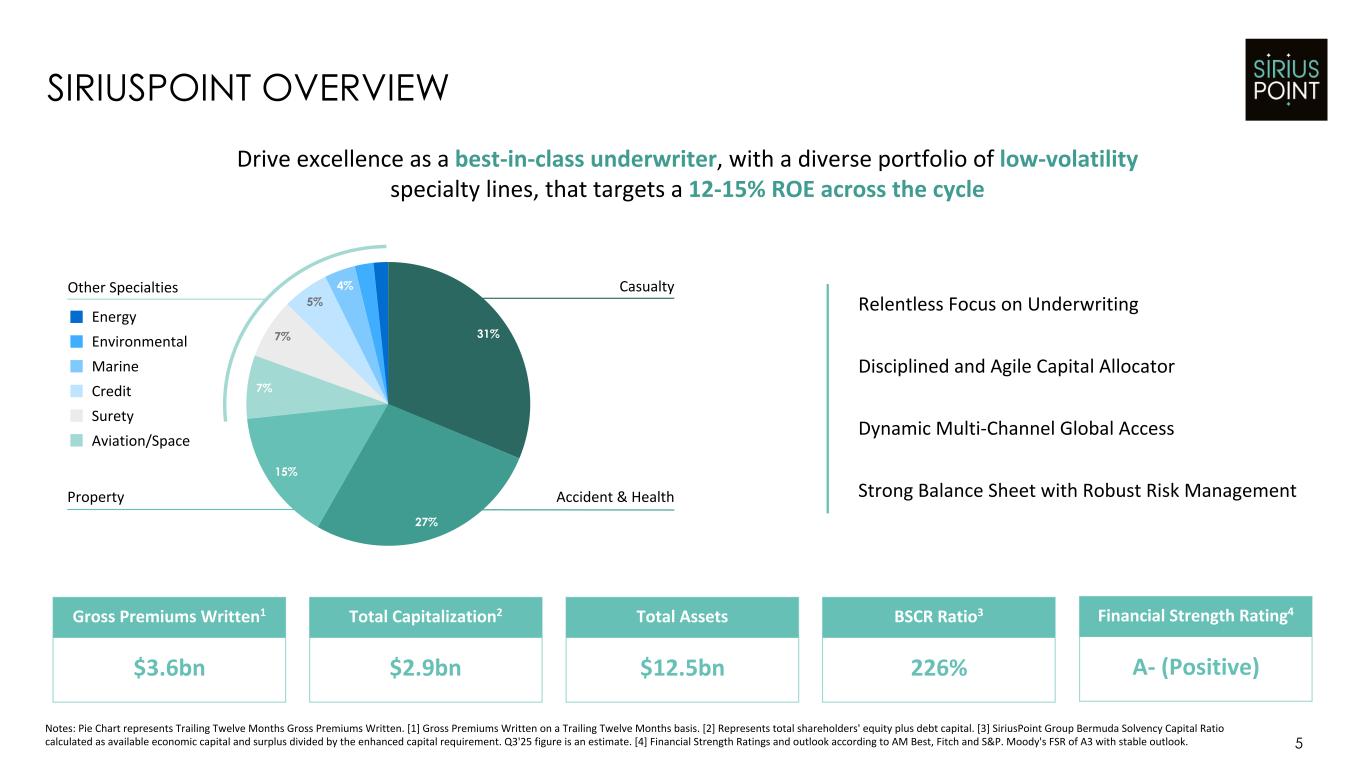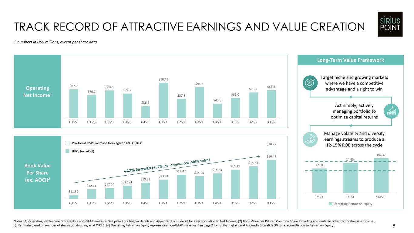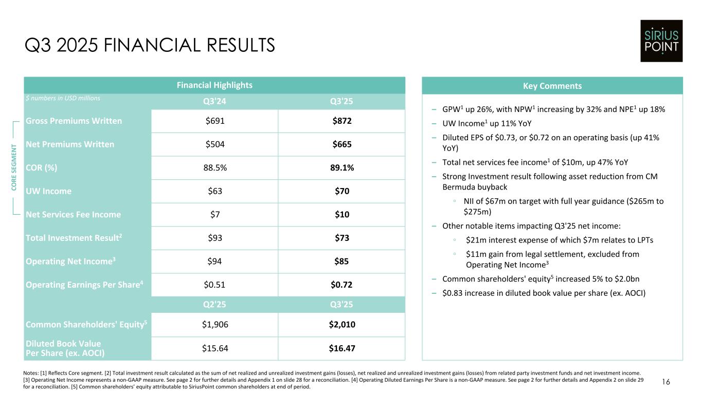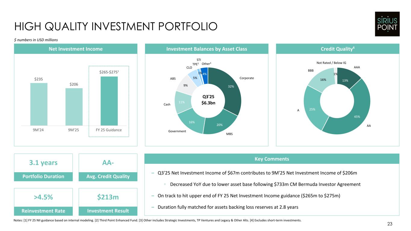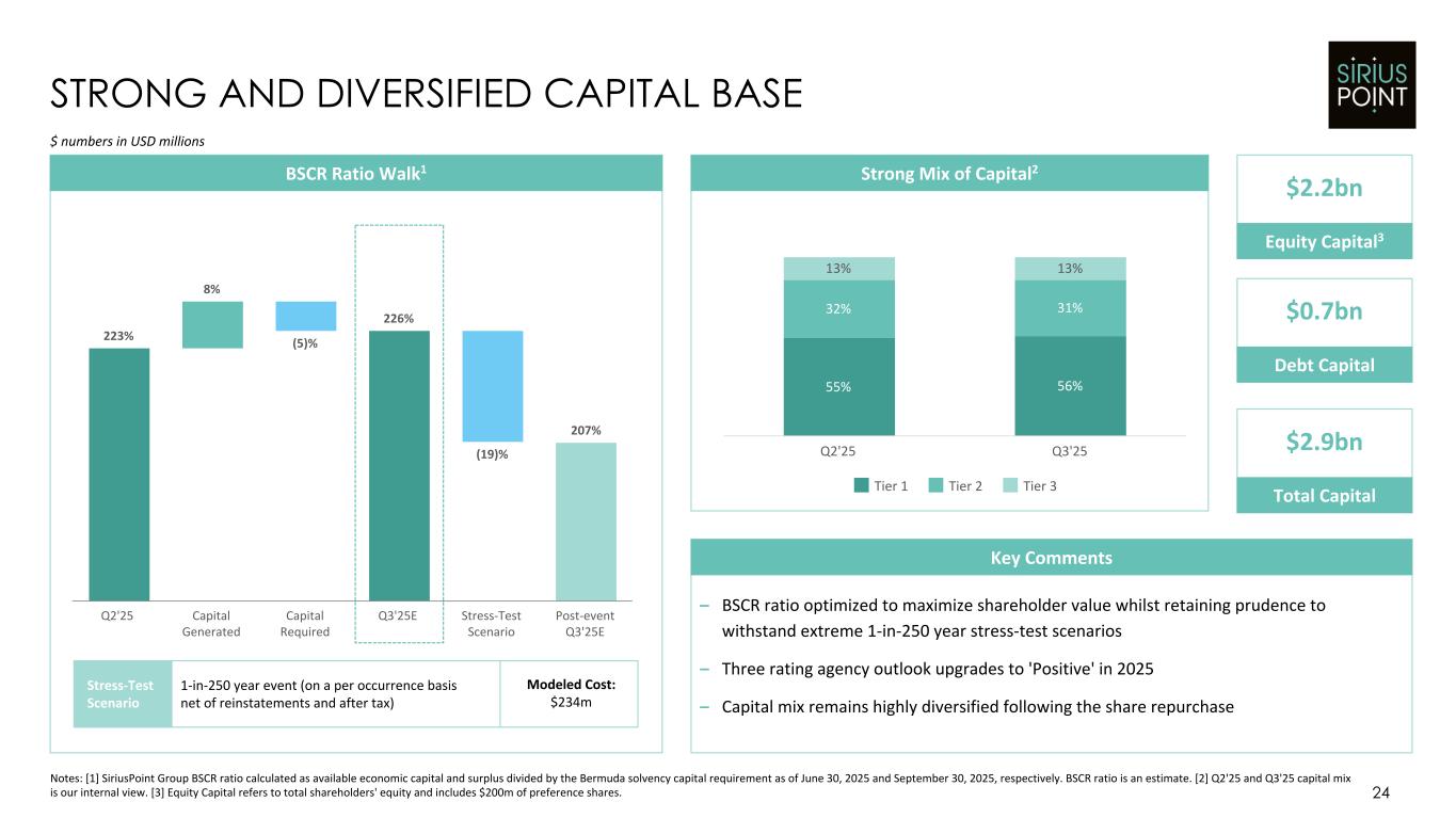 バミューダ諸島ハミルトン、2025 年 10 月 30 日 - シリウスポイント社(SiriusPoint Ltd. 以下「当社」)は本日、2025 年 9 月 30 日をもって終了した第 3 四半期の業績を発表しました。(NYSE:SPNT)は本日、2025年9月30日に終了した第3四半期の業績を発表しました。
