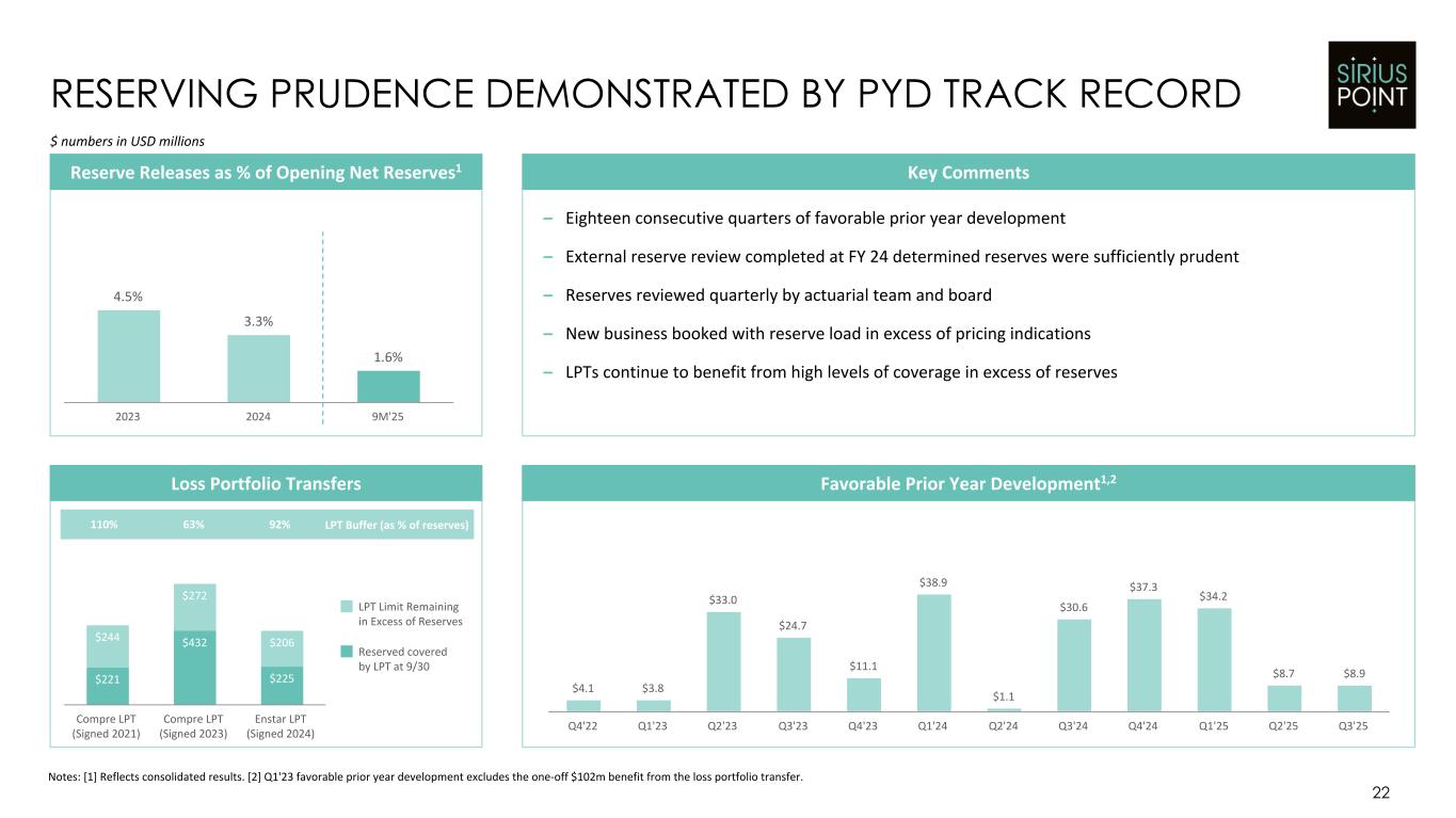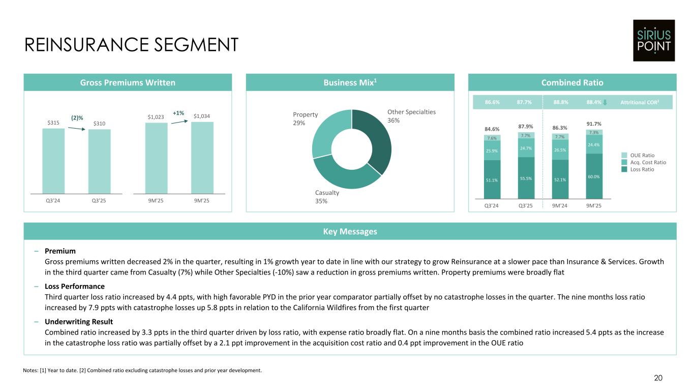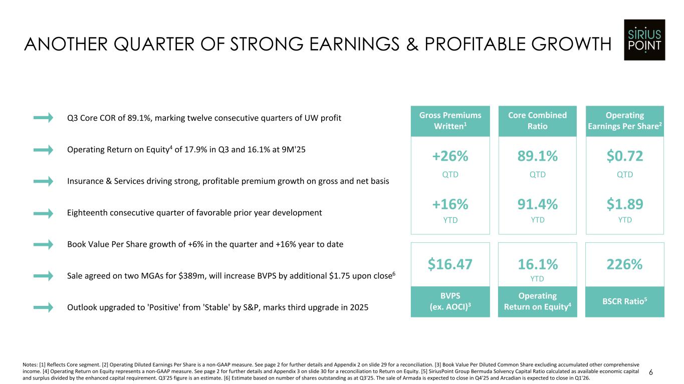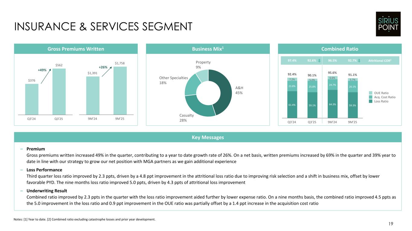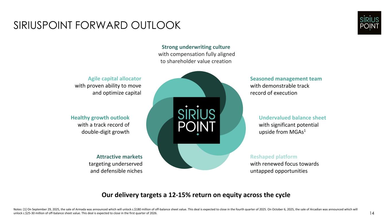 スコット・イーガン最高経営責任者(CEO)は次のように述べた:「第 3 四半期は、シリウス・ポイントにとってまた成功を収めた四半期となった。好調な引受実績、目標とする成長、2 件の MGA 売却の発表、S&P による前向きな見通しのアップグレードなど、誇れることがたくさんあります。