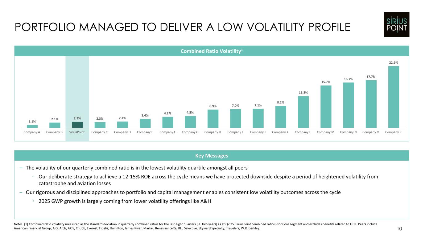 当四半期の営業総資本営業利益率は17.9%と、「全サイクルを通じた」目標範囲である12~15%を大幅に上回る高水準を達成した。さらに重要なことは、上半期にカリフォルニア州の山火事と航空部門からの損失が拡大したにもかかわらず、年初来の営業ROEが16.1%と、依然として目標範囲を上回っていることである。