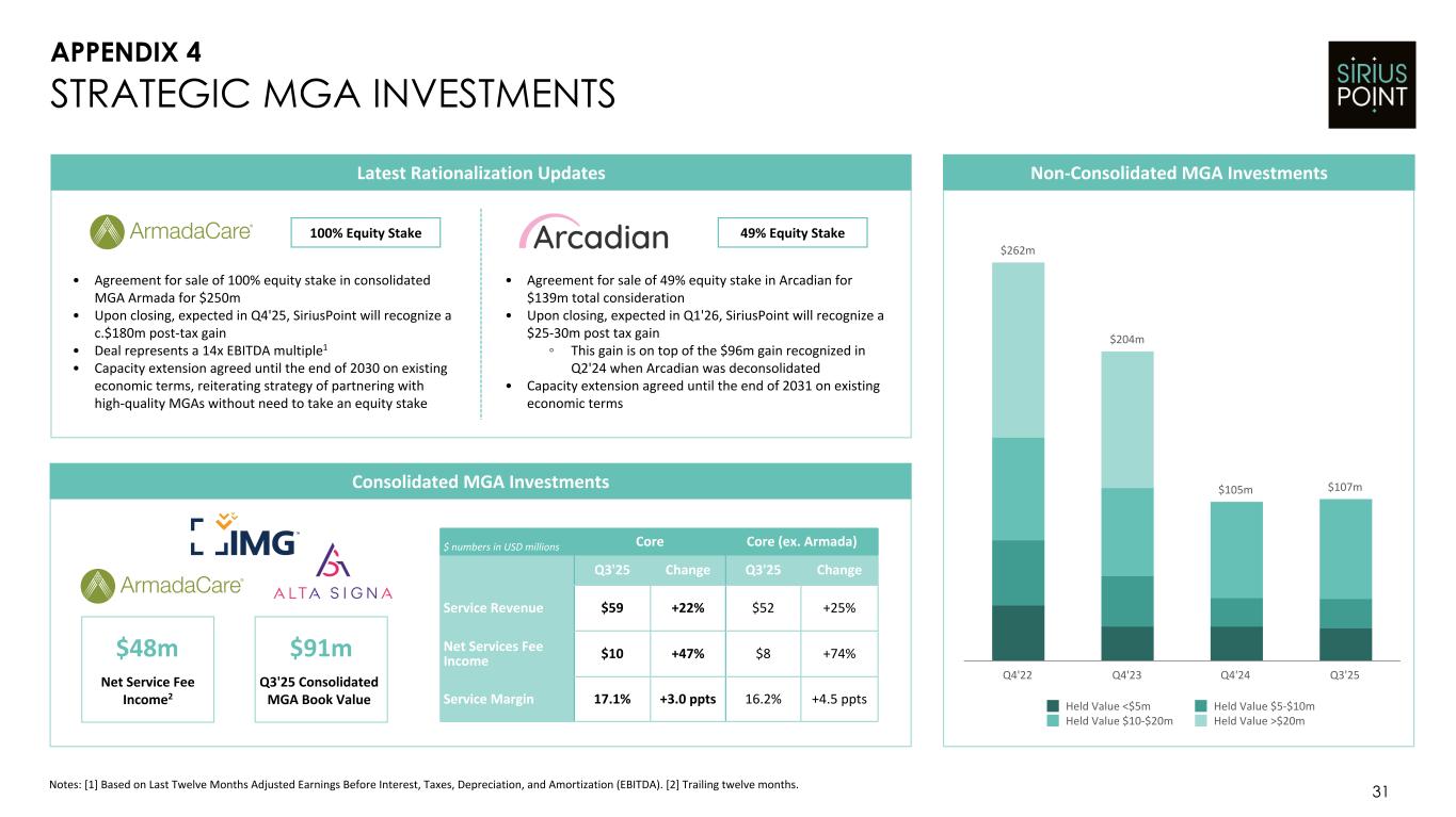 先に発表したMGA投資2件(ArmadaCareとArcadian)の売却により、1株当たり約1.75ドルの株主価値の増加が見込まれるが、これはまだ簿価には含まれていない。