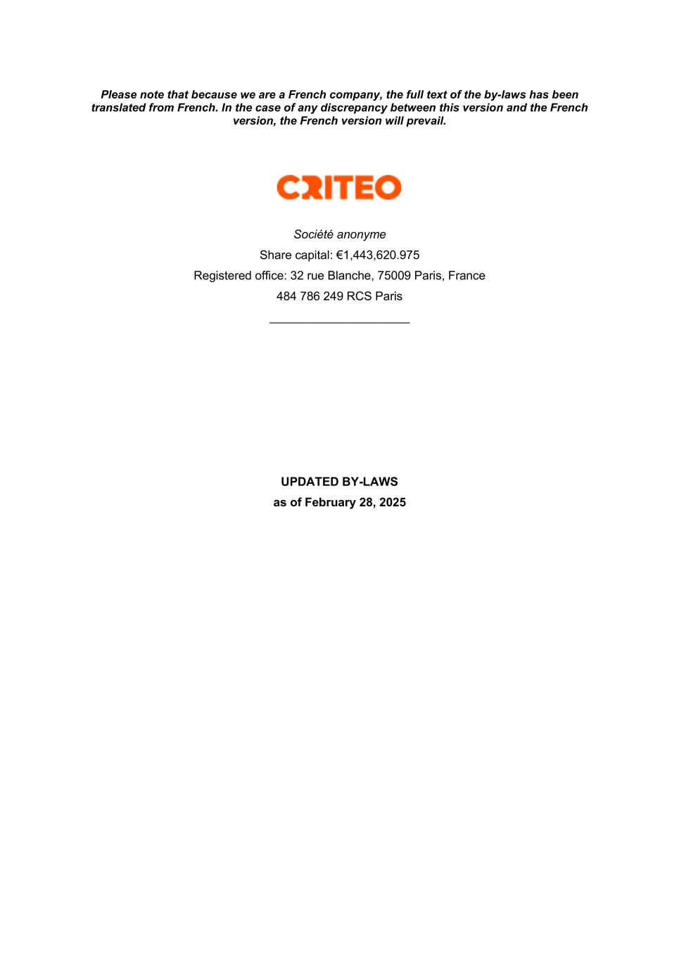 TITLE I LEGAL FORM, NAME, PURPOSES, REGISTERED OFFICE AND TERM OF THE COMPANY ARTICLE 1 ~ LEGAL FORM The Company was incorporated as a société par actions simplifiée (simplified corporation) and subsequently converted into a société anonyme by a decision adopted by the shareholders on March 3, 2006. It is governed by Book II of the Commercial Code (Code de Commerce) and by these by-laws. ARTICLE 2 ~ NAME The Company’s name is: CRITEO In all instruments and documents issued by the Company and intended for third parties, the Company’s name shall always be immediately preceded or followed by the words “société anonyme” or the acronym “S.A.” and by the amount of share capital. ARTICLE 3 ~ PURPOSES The Company’s purposes, directly or indirectly, both in France and abroad, are: - Providing IT services and software, acting as a communication agency, providing consulting services to companies and engaging in distance sales; - Taking equity stakes or acquiring interests in all commercial, industrial, financial, real or personal property companies and enterprises by creating new companies, making contributions, subscribing for or purchasing securities or corporate rights, carrying out corporate mergers and entering into alliances or consortia, whether by taking equity stakes or otherwise; - Managing, administering and disposing of said equity stakes, including providing consulting services in the fields of administration and management, in particular commercial, financial and administrative administration and management; and - More broadly, engaging in all financial, commercial, industrial and personal or real property operations that may be directly or indirectly related to the purposes above or any similar or connected purposes that may promote the Company’s expansion or development in France and abroad. ARTICLE 4 ~ REGISTERED OFFICE The Company’s registered office is located at: 32 rue Blanche, 75009 Paris. The registered office may be transferred to any other location in France by a decision of the Board of Directors, provided such decision is ratified by the next ordinary general shareholders’ meeting, and anywhere else by a decision adopted by an extraordinary general shareholders’ meeting. If a transfer is decided by the Board of Directors, the Board of Directors is authorized to amend the by-laws and perform the publication and filing formalities required as a result, provided it is stated that the transfer is subject to the aforementioned ratification.