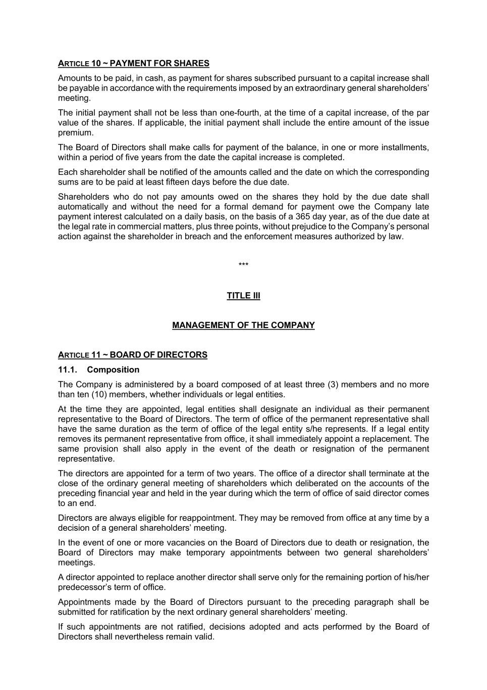 ARTICLE 10 ~ PAYMENT FOR SHARES Amounts to be paid, in cash, as payment for shares subscribed pursuant to a capital increase shall be payable in accordance with the requirements imposed by an extraordinary general shareholders’ meeting. The initial payment shall not be less than one-fourth, at the time of a capital increase, of the par value of the shares. If applicable, the initial payment shall include the entire amount of the issue premium. The Board of Directors shall make calls for payment of the balance, in one or more installments, within a period of five years from the date the capital increase is completed. Each shareholder shall be notified of the amounts called and the date on which the corresponding sums are to be paid at least fifteen days before the due date. Shareholders who do not pay amounts owed on the shares they hold by the due date shall automatically and without the need for a formal demand for payment owe the Company late payment interest calculated on a daily basis, on the basis of a 365 day year, as of the due date at the legal rate in commercial matters, plus three points, without prejudice to the Company’s personal action against the shareholder in breach and the enforcement measures authorized by law. *** TITLE III MANAGEMENT OF THE COMPANY ARTICLE 11 ~ BOARD OF DIRECTORS 11.1. Composition The Company is administered by a board composed of at least three (3) members and no more than ten (10) members, whether individuals or legal entities. At the time they are appointed, legal entities shall designate an individual as their permanent representative to the Board of Directors. The term of office of the permanent representative shall have the same duration as the term of office of the legal entity s/he represents. If a legal entity removes its permanent representative from office, it shall immediately appoint a replacement. The same provision shall also apply in the event of the death or resignation of the permanent representative. The directors are appointed for a term of two years. The office of a director shall terminate at the close of the ordinary general meeting of shareholders which deliberated on the accounts of the preceding financial year and held in the year during which the term of office of said director comes to an end. Directors are always eligible for reappointment. They may be removed from office at any time by a decision of a general shareholders’ meeting. In the event of one or more vacancies on the Board of Directors due to death or resignation, the Board of Directors may make temporary appointments between two general shareholders’ meetings. A director appointed to replace another director shall serve only for the remaining portion of his/her predecessor’s term of office. Appointments made by the Board of Directors pursuant to the preceding paragraph shall be submitted for ratification by the next ordinary general shareholders’ meeting. If such appointments are not ratified, decisions adopted and acts performed by the Board of Directors shall nevertheless remain valid.