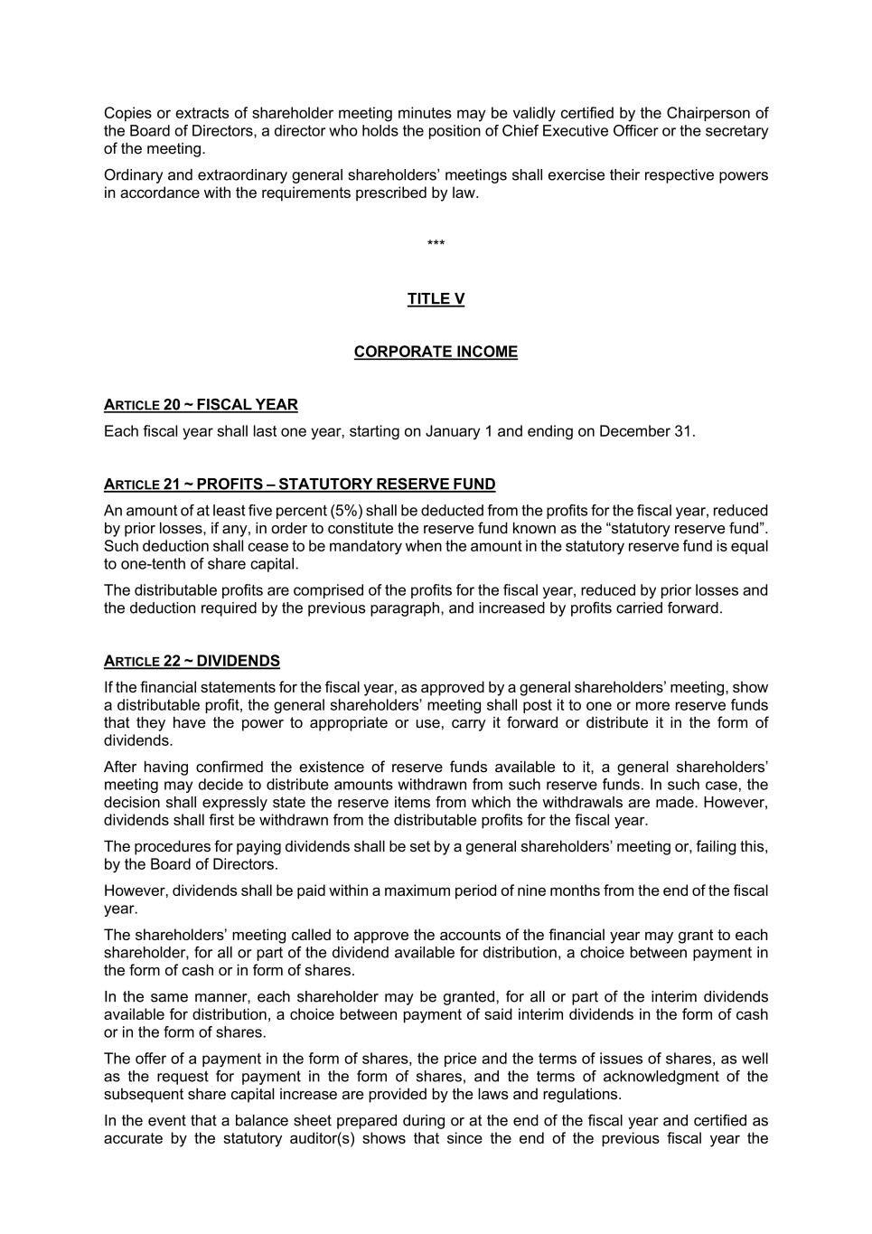 Copies or extracts of shareholder meeting minutes may be validly certified by the Chairperson of the Board of Directors, a director who holds the position of Chief Executive Officer or the secretary of the meeting. Ordinary and extraordinary general shareholders’ meetings shall exercise their respective powers in accordance with the requirements prescribed by law. *** TITLE V CORPORATE INCOME ARTICLE 20 ~ FISCAL YEAR Each fiscal year shall last one year, starting on January 1 and ending on December 31. ARTICLE 21 ~ PROFITS – STATUTORY RESERVE FUND An amount of at least five percent (5%) shall be deducted from the profits for the fiscal year, reduced by prior losses, if any, in order to constitute the reserve fund known as the “statutory reserve fund”. Such deduction shall cease to be mandatory when the amount in the statutory reserve fund is equal to one-tenth of share capital. The distributable profits are comprised of the profits for the fiscal year, reduced by prior losses and the deduction required by the previous paragraph, and increased by profits carried forward. ARTICLE 22 ~ DIVIDENDS If the financial statements for the fiscal year, as approved by a general shareholders’ meeting, show a distributable profit, the general shareholders’ meeting shall post it to one or more reserve funds that they have the power to appropriate or use, carry it forward or distribute it in the form of dividends. After having confirmed the existence of reserve funds available to it, a general shareholders’ meeting may decide to distribute amounts withdrawn from such reserve funds. In such case, the decision shall expressly state the reserve items from which the withdrawals are made. However, dividends shall first be withdrawn from the distributable profits for the fiscal year. The procedures for paying dividends shall be set by a general shareholders’ meeting or, failing this, by the Board of Directors. However, dividends shall be paid within a maximum period of nine months from the end of the fiscal year. The shareholders’ meeting called to approve the accounts of the financial year may grant to each shareholder, for all or part of the dividend available for distribution, a choice between payment in the form of cash or in form of shares. In the same manner, each shareholder may be granted, for all or part of the interim dividends available for distribution, a choice between payment of said interim dividends in the form of cash or in the form of shares. The offer of a payment in the form of shares, the price and the terms of issues of shares, as well as the request for payment in the form of shares, and the terms of acknowledgment of the subsequent share capital increase are provided by the laws and regulations. In the event that a balance sheet prepared during or at the end of the fiscal year and certified as accurate by the statutory auditor(s) shows that since the end of the previous fiscal year the