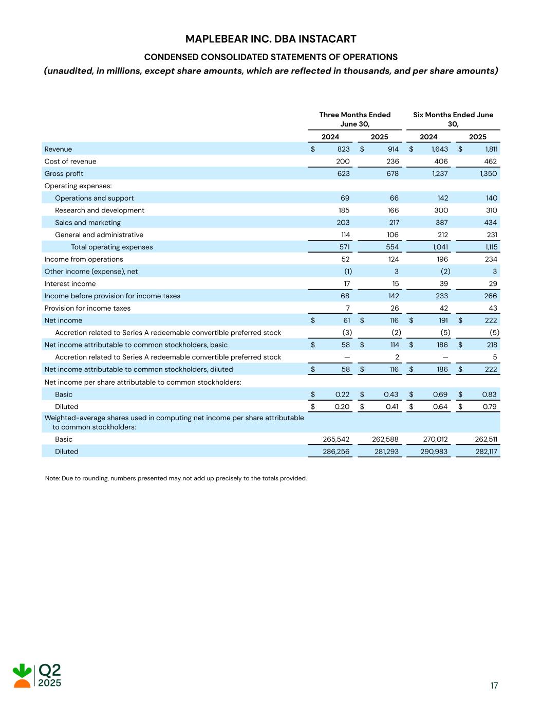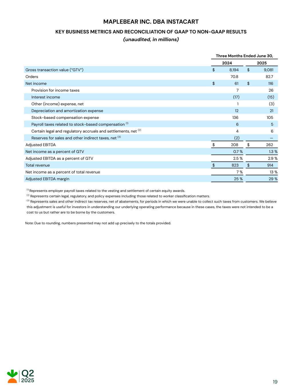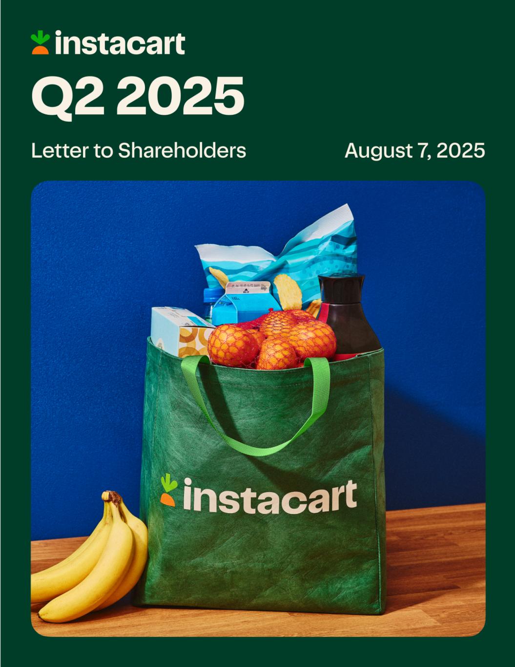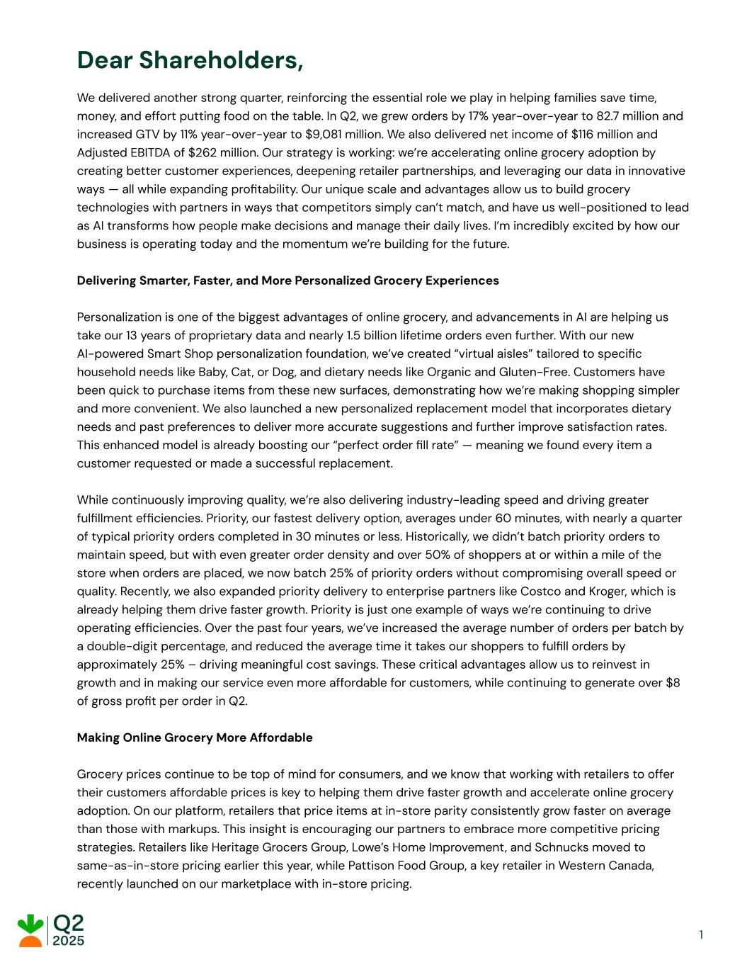 Dear Shareholders, We delivered another strong quarter, reinforcing the essential role we play in helping families save time, money, and effort putting food on the table. In Q2, we grew orders by 17% year-over-year to 82.7 million and increased GTV by 11% year-over-year to $9,081 million. We also delivered net income of $116 million and Adjusted EBITDA of $262 million. Our strategy is working: we’re accelerating online grocery adoption by creating better customer experiences, deepening retailer partnerships, and leveraging our data in innovative ways — all while expanding profitability. Our unique scale and advantages allow us to build grocery technologies with partners in ways that competitors simply can’t match, and have us well-positioned to lead as AI transforms how people make decisions and manage their daily lives. I’m incredibly excited by how our business is operating today and the momentum we’re building for the future. Delivering Smarter, Faster, and More Personalized Grocery Experiences Personalization is one of the biggest advantages of online grocery, and advancements in AI are helping us take our 13 years of proprietary data and nearly 1.5 billion lifetime orders even further. With our new AI-powered Smart Shop personalization foundation, we’ve created “virtual aisles” tailored to specific household needs like Baby, Cat, or Dog, and dietary needs like Organic and Gluten-Free. Customers have been quick to purchase items from these new surfaces, demonstrating how we’re making shopping simpler and more convenient. We also launched a new personalized replacement model that incorporates dietary needs and past preferences to deliver more accurate suggestions and further improve satisfaction rates. This enhanced model is already boosting our “perfect order fill rate” — meaning we found every item a customer requested or made a successful replacement. While continuously improving quality, we’re also delivering industry-leading speed and driving greater fulfillment efficiencies. Priority, our fastest delivery option, averages under 60 minutes, with nearly a quarter of typical priority orders completed in 30 minutes or less. Historically, we didn’t batch priority orders to maintain speed, but with even greater order density and over 50% of shoppers at or within a mile of the store when orders are placed, we now batch 25% of priority orders without compromising overall speed or quality. Recently, we also expanded priority delivery to enterprise partners like Costco and Kroger, which is already helping them drive faster growth. Priority is just one example of ways we’re continuing to drive operating efficiencies. Over the past four years, we’ve increased the average number of orders per batch by a double-digit percentage, and reduced the average time it takes our shoppers to fulfill orders by approximately 25% – driving meaningful cost savings. These critical advantages allow us to reinvest in growth and in making our service even more affordable for customers, while continuing to generate over $8 of gross profit per order in Q2. Making Online Grocery More Affordable Grocery prices continue to be top of mind for consumers, and we know that working with retailers to offer their customers affordable prices is key to helping them drive faster growth and accelerate online grocery adoption. On our platform, retailers that price items at in-store parity consistently grow faster on average than those with markups. This insight is encouraging our partners to embrace more competitive pricing strategies. Retailers like Heritage Grocers Group, Lowe’s Home Improvement, and Schnucks moved to same-as-in-store pricing earlier this year, while Pattison Food Group, a key retailer in Western Canada, recently launched on our marketplace with in-store pricing. 1