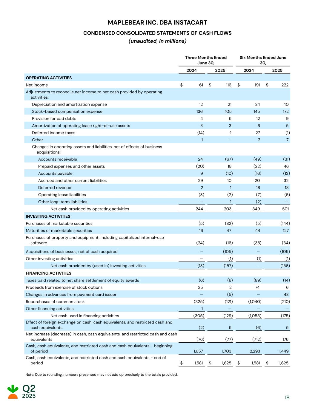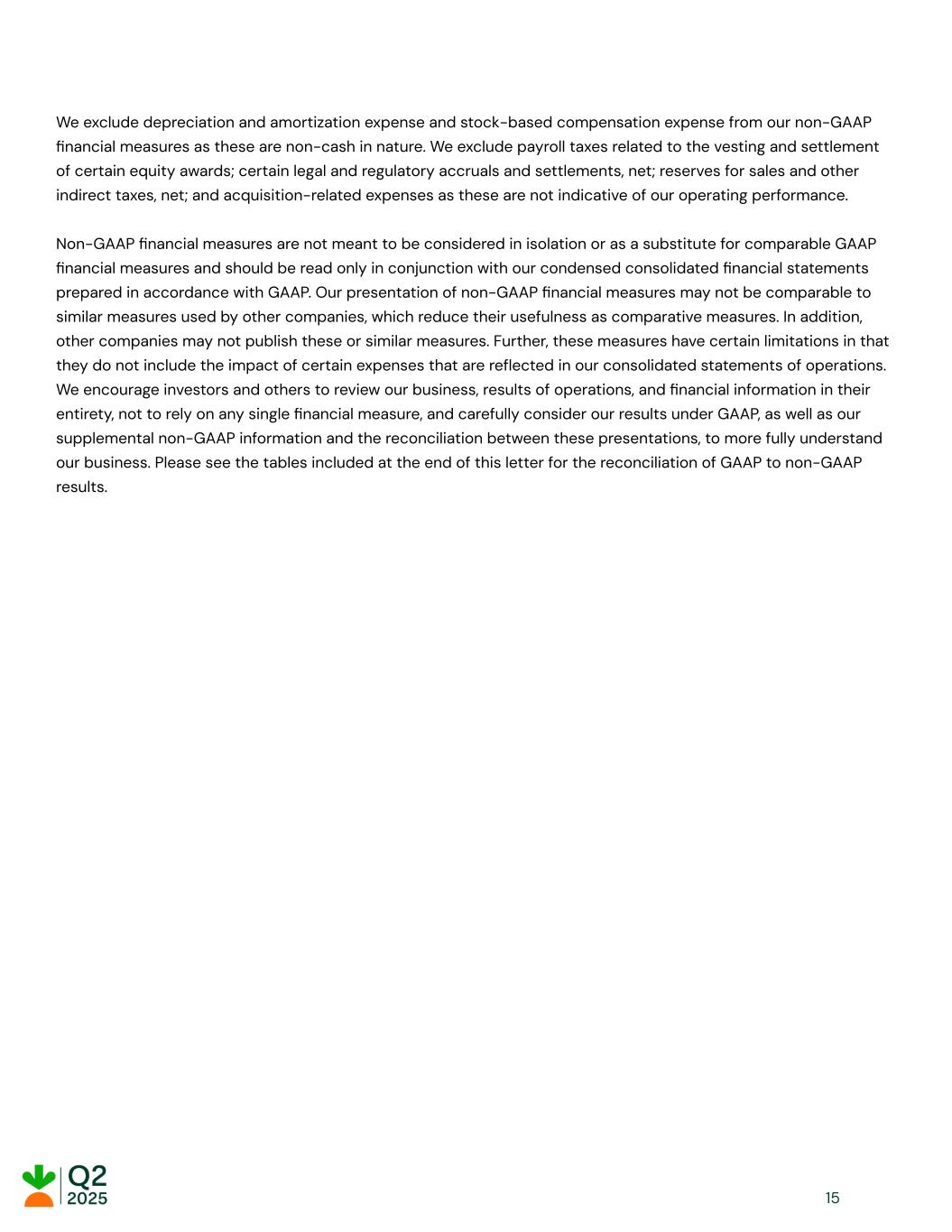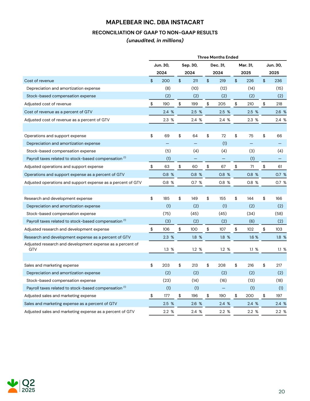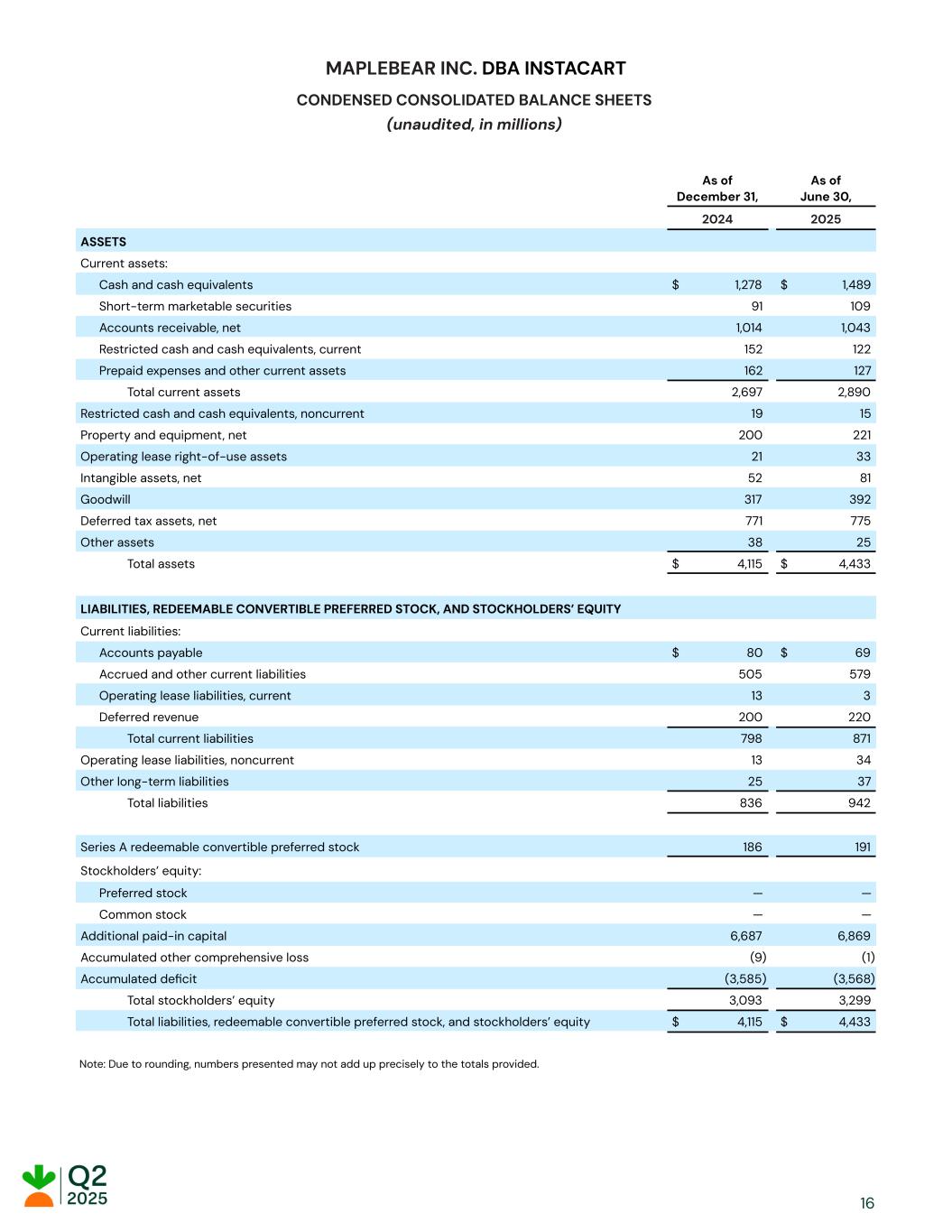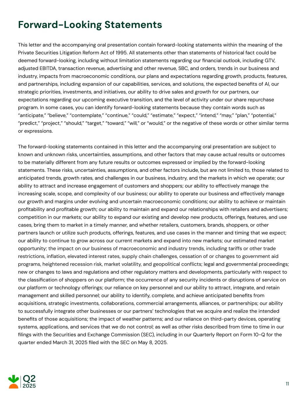 Dear Shareholders, We delivered another strong quarter, reinforcing the essential role we play in helping families save time, money, and effort putting food on the table. In Q2, we grew orders by 17% year-over-year to 82.7 million and increased GTV by 11% year-over-year to $9,081 million. We also delivered net income of $116 million and Adjusted EBITDA of $262 million. Our strategy is working: we’re accelerating online grocery adoption by creating better customer experiences, deepening retailer partnerships, and leveraging our data in innovative ways — all while expanding profitability. Our unique scale and advantages allow us to build grocery technologies with partners in ways that competitors simply can’t match, and have us well-positioned to lead as AI transforms how people make decisions and manage their daily lives. I’m incredibly excited by how our business is operating today and the momentum we’re building for the future. Delivering Smarter, Faster, and More Personalized Grocery Experiences Personalization is one of the biggest advantages of online grocery, and advancements in AI are helping us take our 13 years of proprietary data and nearly 1.5 billion lifetime orders even further. With our new AI-powered Smart Shop personalization foundation, we’ve created “virtual aisles” tailored to specific household needs like Baby, Cat, or Dog, and dietary needs like Organic and Gluten-Free. Customers have been quick to purchase items from these new surfaces, demonstrating how we’re making shopping simpler and more convenient. We also launched a new personalized replacement model that incorporates dietary needs and past preferences to deliver more accurate suggestions and further improve satisfaction rates. This enhanced model is already boosting our “perfect order fill rate” — meaning we found every item a customer requested or made a successful replacement. While continuously improving quality, we’re also delivering industry-leading speed and driving greater fulfillment efficiencies. Priority, our fastest delivery option, averages under 60 minutes, with nearly a quarter of typical priority orders completed in 30 minutes or less. Historically, we didn’t batch priority orders to maintain speed, but with even greater order density and over 50% of shoppers at or within a mile of the store when orders are placed, we now batch 25% of priority orders without compromising overall speed or quality. Recently, we also expanded priority delivery to enterprise partners like Costco and Kroger, which is already helping them drive faster growth. Priority is just one example of ways we’re continuing to drive operating efficiencies. Over the past four years, we’ve increased the average number of orders per batch by a double-digit percentage, and reduced the average time it takes our shoppers to fulfill orders by approximately 25% – driving meaningful cost savings. These critical advantages allow us to reinvest in growth and in making our service even more affordable for customers, while continuing to generate over $8 of gross profit per order in Q2. Making Online Grocery More Affordable Grocery prices continue to be top of mind for consumers, and we know that working with retailers to offer their customers affordable prices is key to helping them drive faster growth and accelerate online grocery adoption. On our platform, retailers that price items at in-store parity consistently grow faster on average than those with markups. This insight is encouraging our partners to embrace more competitive pricing strategies. Retailers like Heritage Grocers Group, Lowe’s Home Improvement, and Schnucks moved to same-as-in-store pricing earlier this year, while Pattison Food Group, a key retailer in Western Canada, recently launched on our marketplace with in-store pricing. 1
