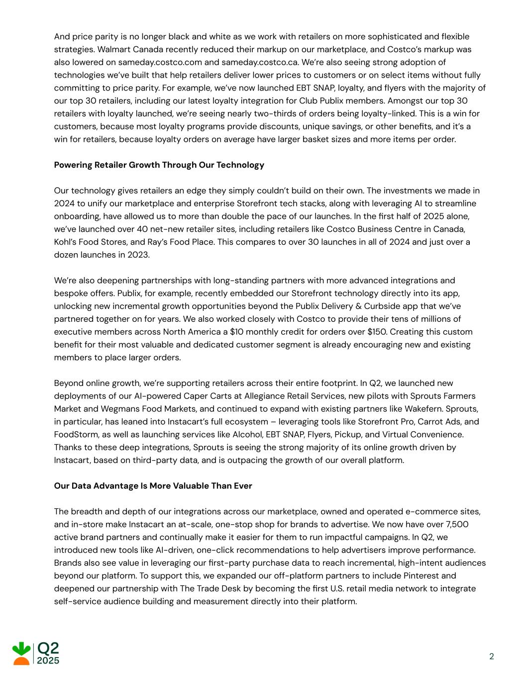 And price parity is no longer black and white as we work with retailers on more sophisticated and flexible strategies. Walmart Canada recently reduced their markup on our marketplace, and Costco’s markup was also lowered on sameday.costco.com and sameday.costco.ca. We’re also seeing strong adoption of technologies we’ve built that help retailers deliver lower prices to customers or on select items without fully committing to price parity. For example, we’ve now launched EBT SNAP, loyalty, and flyers with the majority of our top 30 retailers, including our latest loyalty integration for Club Publix members. Amongst our top 30 retailers with loyalty launched, we’re seeing nearly two-thirds of orders being loyalty-linked. This is a win for customers, because most loyalty programs provide discounts, unique savings, or other benefits, and it’s a win for retailers, because loyalty orders on average have larger basket sizes and more items per order. Powering Retailer Growth Through Our Technology Our technology gives retailers an edge they simply couldn’t build on their own. The investments we made in 2024 to unify our marketplace and enterprise Storefront tech stacks, along with leveraging AI to streamline onboarding, have allowed us to more than double the pace of our launches. In the first half of 2025 alone, we’ve launched over 40 net-new retailer sites, including retailers like Costco Business Centre in Canada, Kohl’s Food Stores, and Ray’s Food Place. This compares to over 30 launches in all of 2024 and just over a dozen launches in 2023. We’re also deepening partnerships with long-standing partners with more advanced integrations and bespoke offers. Publix, for example, recently embedded our Storefront technology directly into its app, unlocking new incremental growth opportunities beyond the Publix Delivery & Curbside app that we’ve partnered together on for years. We also worked closely with Costco to provide their tens of millions of executive members across North America a $10 monthly credit for orders over $150. Creating this custom benefit for their most valuable and dedicated customer segment is already encouraging new and existing members to place larger orders. Beyond online growth, we’re supporting retailers across their entire footprint. In Q2, we launched new deployments of our AI-powered Caper Carts at Allegiance Retail Services, new pilots with Sprouts Farmers Market and Wegmans Food Markets, and continued to expand with existing partners like Wakefern. Sprouts, in particular, has leaned into Instacart’s full ecosystem – leveraging tools like Storefront Pro, Carrot Ads, and FoodStorm, as well as launching services like Alcohol, EBT SNAP, Flyers, Pickup, and Virtual Convenience. Thanks to these deep integrations, Sprouts is seeing the strong majority of its online growth driven by Instacart, based on third-party data, and is outpacing the growth of our overall platform. Our Data Advantage Is More Valuable Than Ever The breadth and depth of our integrations across our marketplace, owned and operated e-commerce sites, and in-store make Instacart an at-scale, one-stop shop for brands to advertise. We now have over 7,500 active brand partners and continually make it easier for them to run impactful campaigns. In Q2, we introduced new tools like AI-driven, one-click recommendations to help advertisers improve performance. Brands also see value in leveraging our first-party purchase data to reach incremental, high-intent audiences beyond our platform. To support this, we expanded our off-platform partners to include Pinterest and deepened our partnership with The Trade Desk by becoming the first U.S. retail media network to integrate self-service audience building and measurement directly into their platform. 2