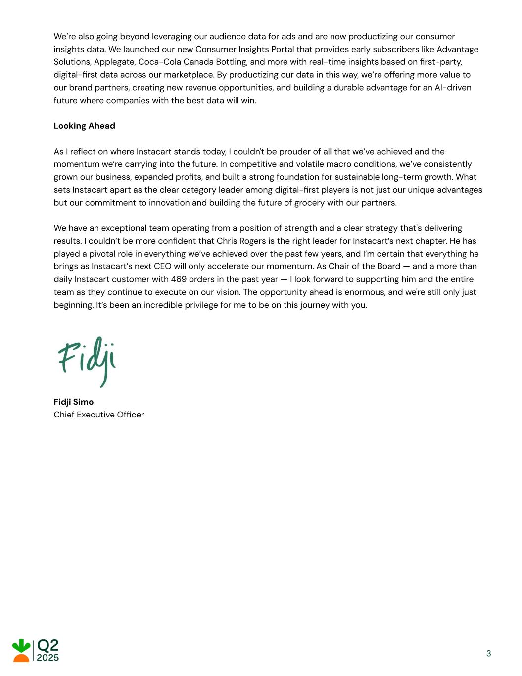We’re also going beyond leveraging our audience data for ads and are now productizing our consumer insights data. We launched our new Consumer Insights Portal that provides early subscribers like Advantage Solutions, Applegate, Coca-Cola Canada Bottling, and more with real-time insights based on first-party, digital-first data across our marketplace. By productizing our data in this way, we’re offering more value to our brand partners, creating new revenue opportunities, and building a durable advantage for an AI-driven future where companies with the best data will win. Looking Ahead As I reflect on where Instacart stands today, I couldn't be prouder of all that we’ve achieved and the momentum we’re carrying into the future. In competitive and volatile macro conditions, we’ve consistently grown our business, expanded profits, and built a strong foundation for sustainable long-term growth. What sets Instacart apart as the clear category leader among digital-first players is not just our unique advantages but our commitment to innovation and building the future of grocery with our partners. We have an exceptional team operating from a position of strength and a clear strategy that's delivering results. I couldn’t be more confident that Chris Rogers is the right leader for Instacart’s next chapter. He has played a pivotal role in everything we’ve achieved over the past few years, and I’m certain that everything he brings as Instacart’s next CEO will only accelerate our momentum. As Chair of the Board — and a more than daily Instacart customer with 469 orders in the past year — I look forward to supporting him and the entire team as they continue to execute on our vision. The opportunity ahead is enormous, and we're still only just beginning. It’s been an incredible privilege for me to be on this journey with you. Fidji Simo Chief Executive Officer 3