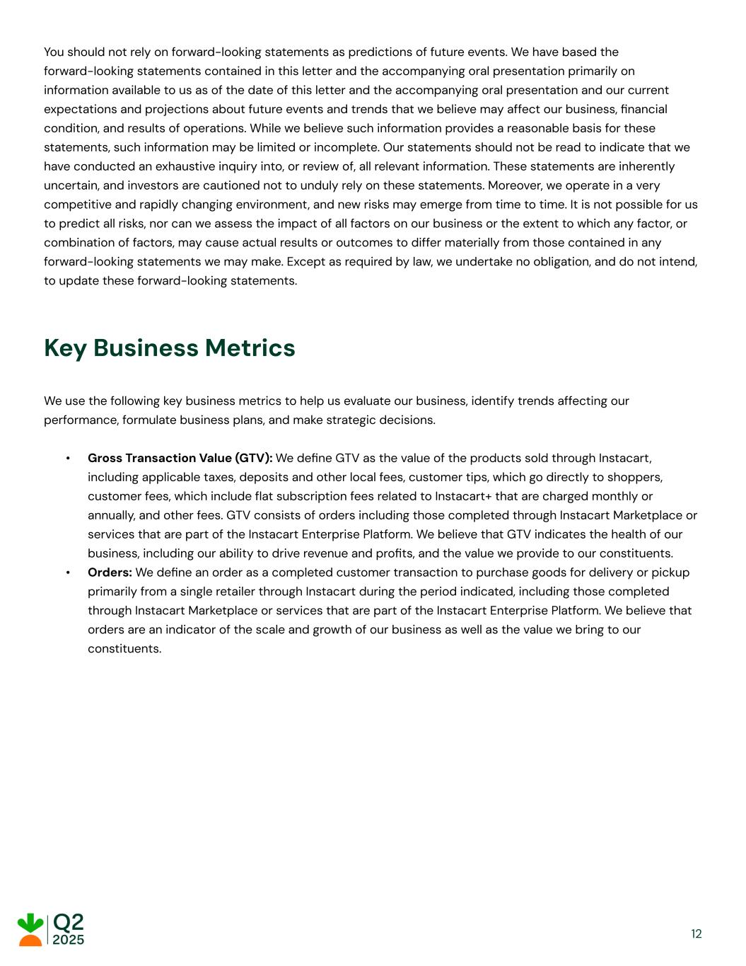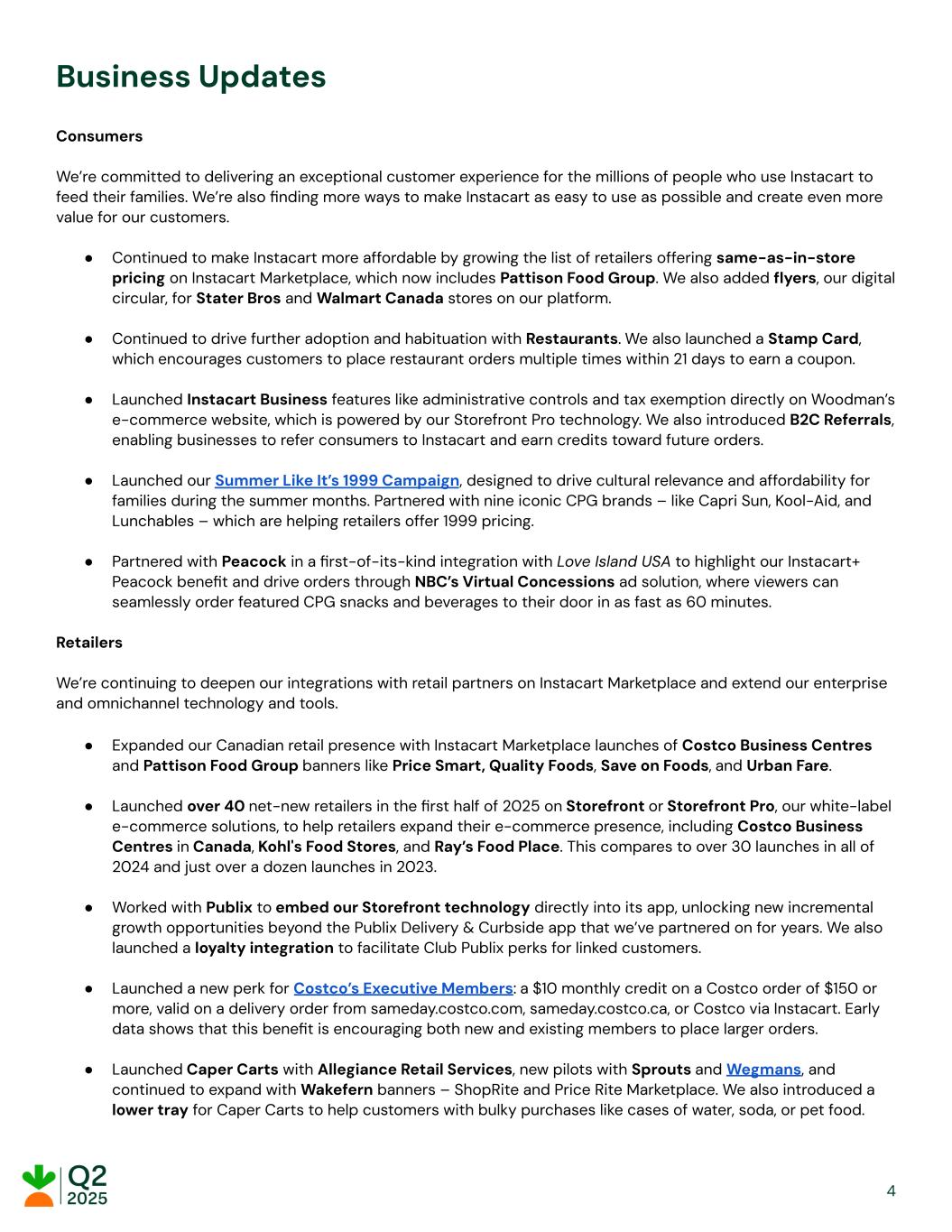 Business Updates Consumers We’re committed to delivering an exceptional customer experience for the millions of people who use Instacart to feed their families. We’re also finding more ways to make Instacart as easy to use as possible and create even more value for our customers. ● Continued to make Instacart more affordable by growing the list of retailers offering same-as-in-store pricing on Instacart Marketplace, which now includes Pattison Food Group. We also added flyers, our digital circular, for Stater Bros and Walmart Canada stores on our platform. ● Continued to drive further adoption and habituation with Restaurants. We also launched a Stamp Card, which encourages customers to place restaurant orders multiple times within 21 days to earn a coupon. ● Launched Instacart Business features like administrative controls and tax exemption directly on Woodman’s e-commerce website, which is powered by our Storefront Pro technology. We also introduced B2C Referrals, enabling businesses to refer consumers to Instacart and earn credits toward future orders. ● Launched our Summer Like It’s 1999 Campaign, designed to drive cultural relevance and affordability for families during the summer months. Partnered with nine iconic CPG brands – like Capri Sun, Kool-Aid, and Lunchables – which are helping retailers offer 1999 pricing. ● Partnered with Peacock in a first-of-its-kind integration with Love Island USA to highlight our Instacart+ Peacock benefit and drive orders through NBC’s Virtual Concessions ad solution, where viewers can seamlessly order featured CPG snacks and beverages to their door in as fast as 60 minutes. Retailers We’re continuing to deepen our integrations with retail partners on Instacart Marketplace and extend our enterprise and omnichannel technology and tools. ● Expanded our Canadian retail presence with Instacart Marketplace launches of Costco Business Centres and Pattison Food Group banners like Price Smart, Quality Foods, Save on Foods, and Urban Fare. ● Launched over 40 net-new retailers in the first half of 2025 on Storefront or Storefront Pro, our white-label e-commerce solutions, to help retailers expand their e-commerce presence, including Costco Business Centres in Canada, Kohl's Food Stores, and Ray’s Food Place. This compares to over 30 launches in all of 2024 and just over a dozen launches in 2023. ● Worked with Publix to embed our Storefront technology directly into its app, unlocking new incremental growth opportunities beyond the Publix Delivery & Curbside app that we’ve partnered on for years. We also launched a loyalty integration to facilitate Club Publix perks for linked customers. ● Launched a new perk for Costco’s Executive Members: a $10 monthly credit on a Costco order of $150 or more, valid on a delivery order from sameday.costco.com, sameday.costco.ca, or Costco via Instacart. Early data shows that this benefit is encouraging both new and existing members to place larger orders. ● Launched Caper Carts with Allegiance Retail Services, new pilots with Sprouts and Wegmans, and continued to expand with Wakefern banners – ShopRite and Price Rite Marketplace. We also introduced a lower tray for Caper Carts to help customers with bulky purchases like cases of water, soda, or pet food. 4