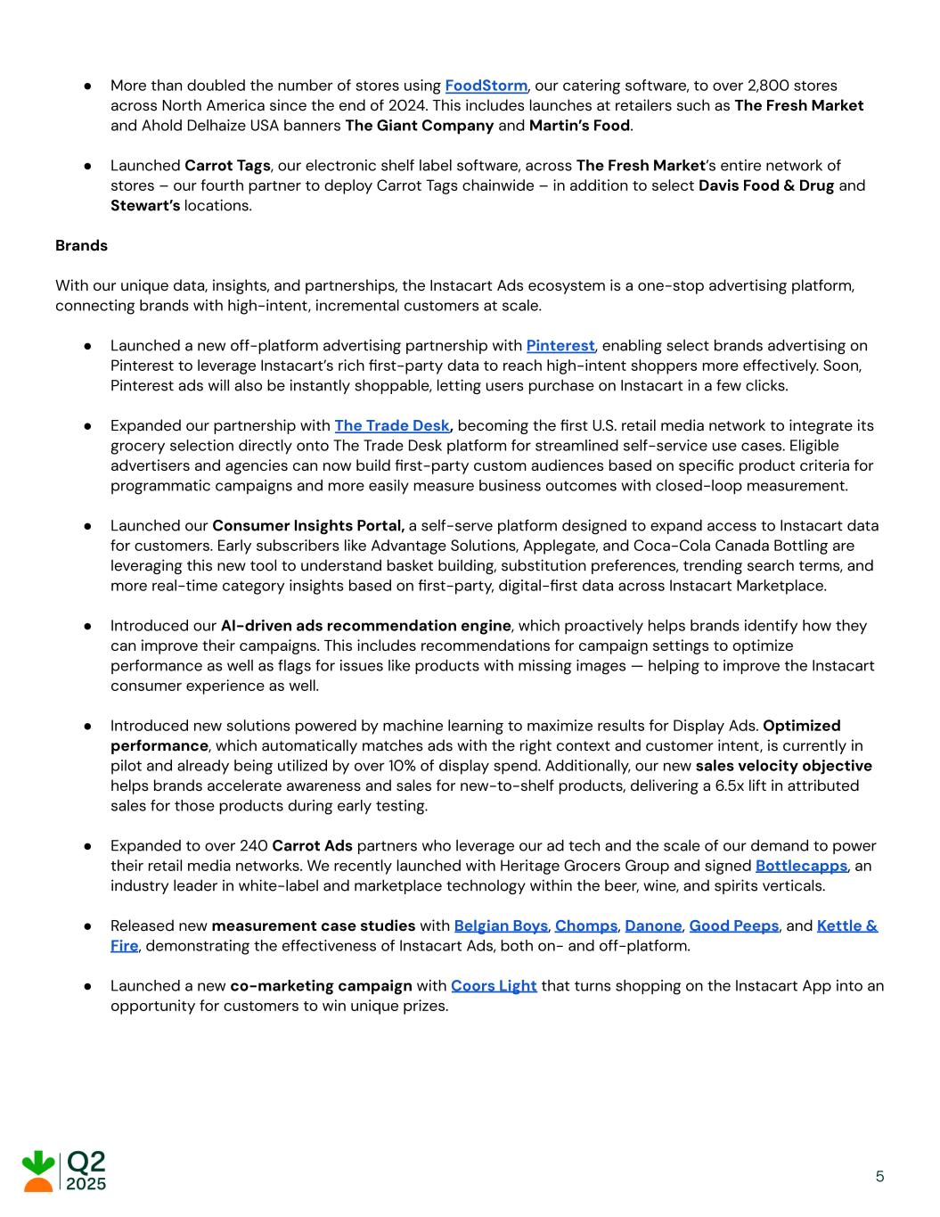 ● More than doubled the number of stores using FoodStorm, our catering software, to over 2,800 stores across North America since the end of 2024. This includes launches at retailers such as The Fresh Market and Ahold Delhaize USA banners The Giant Company and Martin’s Food. ● Launched Carrot Tags, our electronic shelf label software, across The Fresh Market’s entire network of stores – our fourth partner to deploy Carrot Tags chainwide – in addition to select Davis Food & Drug and Stewart’s locations. Brands With our unique data, insights, and partnerships, the Instacart Ads ecosystem is a one-stop advertising platform, connecting brands with high-intent, incremental customers at scale. ● Launched a new off-platform advertising partnership with Pinterest, enabling select brands advertising on Pinterest to leverage Instacart’s rich first-party data to reach high-intent shoppers more effectively. Soon, Pinterest ads will also be instantly shoppable, letting users purchase on Instacart in a few clicks. ● Expanded our partnership with The Trade Desk, becoming the first U.S. retail media network to integrate its grocery selection directly onto The Trade Desk platform for streamlined self-service use cases. Eligible advertisers and agencies can now build first-party custom audiences based on specific product criteria for programmatic campaigns and more easily measure business outcomes with closed-loop measurement. ● Launched our Consumer Insights Portal, a self-serve platform designed to expand access to Instacart data for customers. Early subscribers like Advantage Solutions, Applegate, and Coca-Cola Canada Bottling are leveraging this new tool to understand basket building, substitution preferences, trending search terms, and more real-time category insights based on first-party, digital-first data across Instacart Marketplace. ● Introduced our AI-driven ads recommendation engine, which proactively helps brands identify how they can improve their campaigns. This includes recommendations for campaign settings to optimize performance as well as flags for issues like products with missing images — helping to improve the Instacart consumer experience as well. ● Introduced new solutions powered by machine learning to maximize results for Display Ads. Optimized performance, which automatically matches ads with the right context and customer intent, is currently in pilot and already being utilized by over 10% of display spend. Additionally, our new sales velocity objective helps brands accelerate awareness and sales for new-to-shelf products, delivering a 6.5x lift in attributed sales for those products during early testing. ● Expanded to over 240 Carrot Ads partners who leverage our ad tech and the scale of our demand to power their retail media networks. We recently launched with Heritage Grocers Group and signed Bottlecapps, an industry leader in white-label and marketplace technology within the beer, wine, and spirits verticals. ● Released new measurement case studies with Belgian Boys, Chomps, Danone, Good Peeps, and Kettle & Fire, demonstrating the effectiveness of Instacart Ads, both on- and off-platform. ● Launched a new co-marketing campaign with Coors Light that turns shopping on the Instacart App into an opportunity for customers to win unique prizes. 5