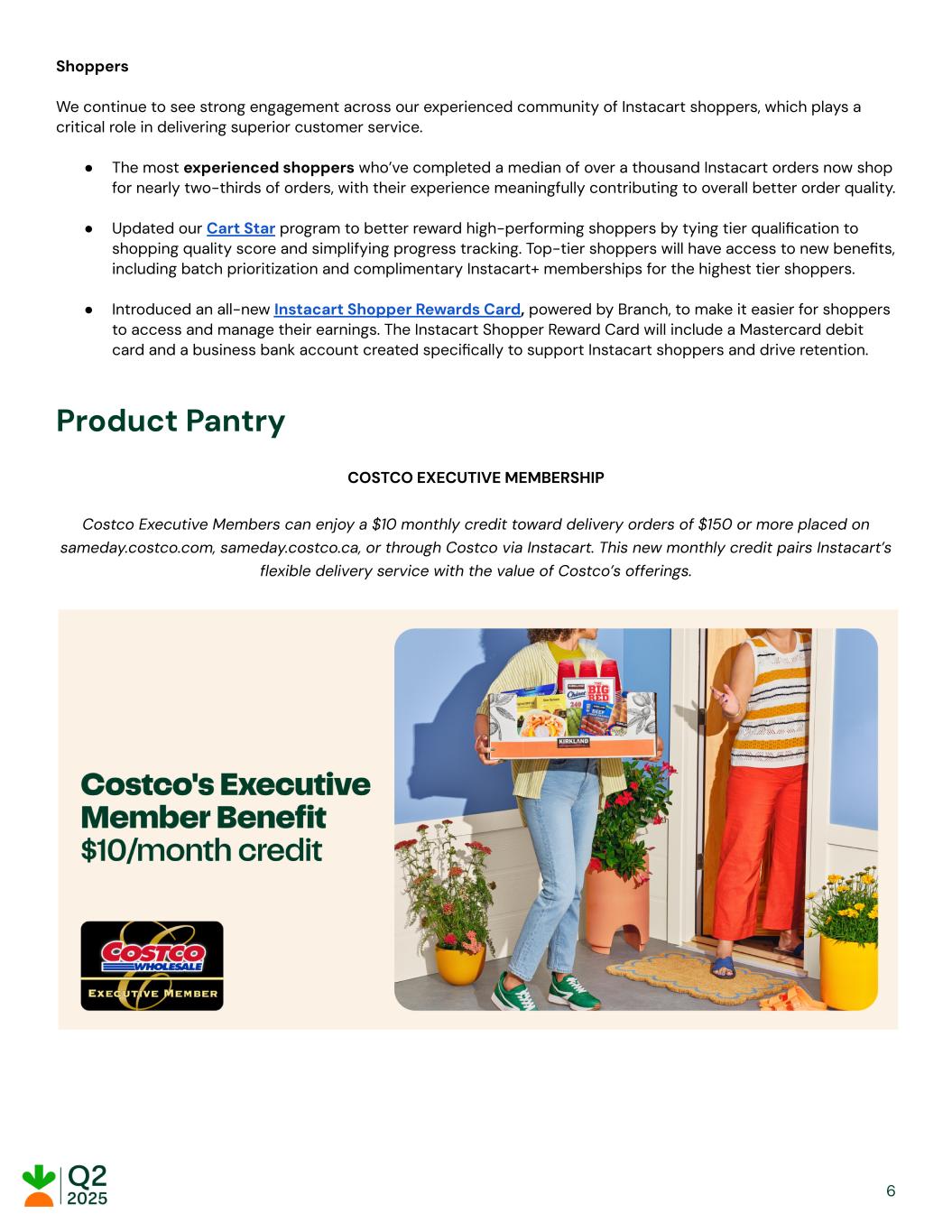 Shoppers We continue to see strong engagement across our experienced community of Instacart shoppers, which plays a critical role in delivering superior customer service. ● The most experienced shoppers who’ve completed a median of over a thousand Instacart orders now shop for nearly two-thirds of orders, with their experience meaningfully contributing to overall better order quality. ● Updated our Cart Star program to better reward high-performing shoppers by tying tier qualification to shopping quality score and simplifying progress tracking. Top-tier shoppers will have access to new benefits, including batch prioritization and complimentary Instacart+ memberships for the highest tier shoppers. ● Introduced an all-new Instacart Shopper Rewards Card, powered by Branch, to make it easier for shoppers to access and manage their earnings. The Instacart Shopper Reward Card will include a Mastercard debit card and a business bank account created specifically to support Instacart shoppers and drive retention. Product Pantry COSTCO EXECUTIVE MEMBERSHIP Costco Executive Members can enjoy a $10 monthly credit toward delivery orders of $150 or more placed on sameday.costco.com, sameday.costco.ca, or through Costco via Instacart. This new monthly credit pairs Instacart’s flexible delivery service with the value of Costco’s offerings. 6