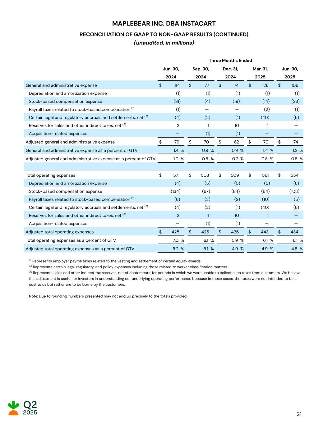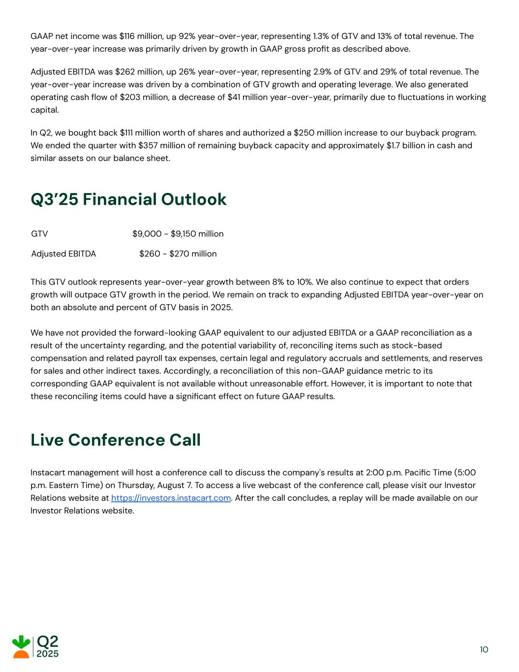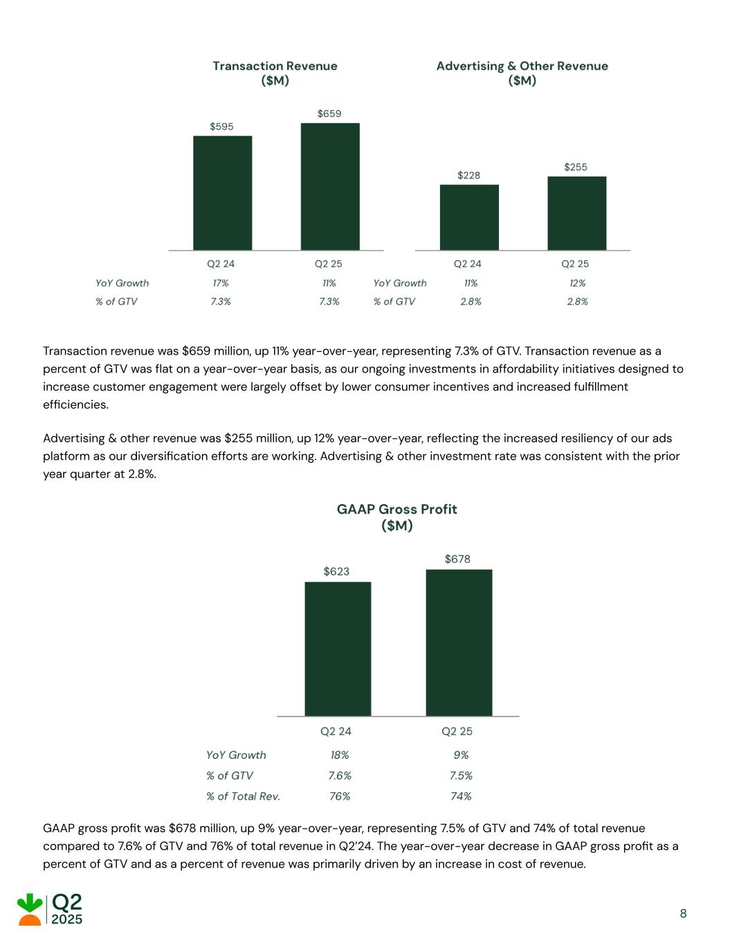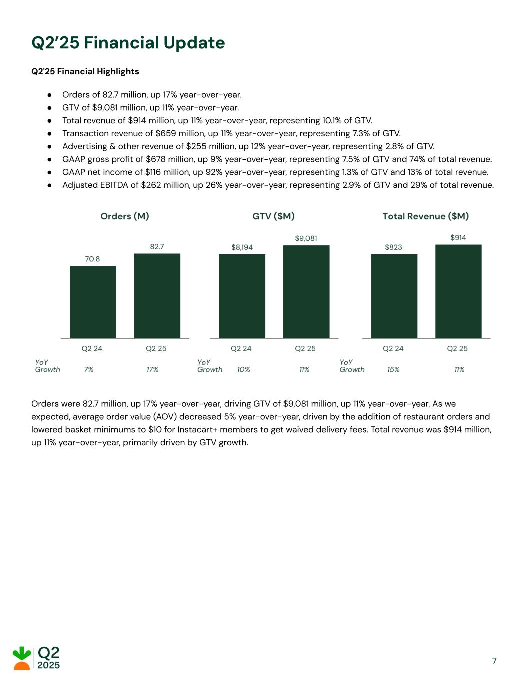 Q2’25 Financial Update Q2'25 Financial Highlights ● Orders of 82.7 million, up 17% year-over-year. ● GTV of $9,081 million, up 11% year-over-year. ● Total revenue of $914 million, up 11% year-over-year, representing 10.1% of GTV. ● Transaction revenue of $659 million, up 11% year-over-year, representing 7.3% of GTV. ● Advertising & other revenue of $255 million, up 12% year-over-year, representing 2.8% of GTV. ● GAAP gross profit of $678 million, up 9% year-over-year, representing 7.5% of GTV and 74% of total revenue. ● GAAP net income of $116 million, up 92% year-over-year, representing 1.3% of GTV and 13% of total revenue. ● Adjusted EBITDA of $262 million, up 26% year-over-year, representing 2.9% of GTV and 29% of total revenue. Orders were 82.7 million, up 17% year-over-year, driving GTV of $9,081 million, up 11% year-over-year. As we expected, average order value (AOV) decreased 5% year-over-year, driven by the addition of restaurant orders and lowered basket minimums to $10 for Instacart+ members to get waived delivery fees. Total revenue was $914 million, up 11% year-over-year, primarily driven by GTV growth. 7