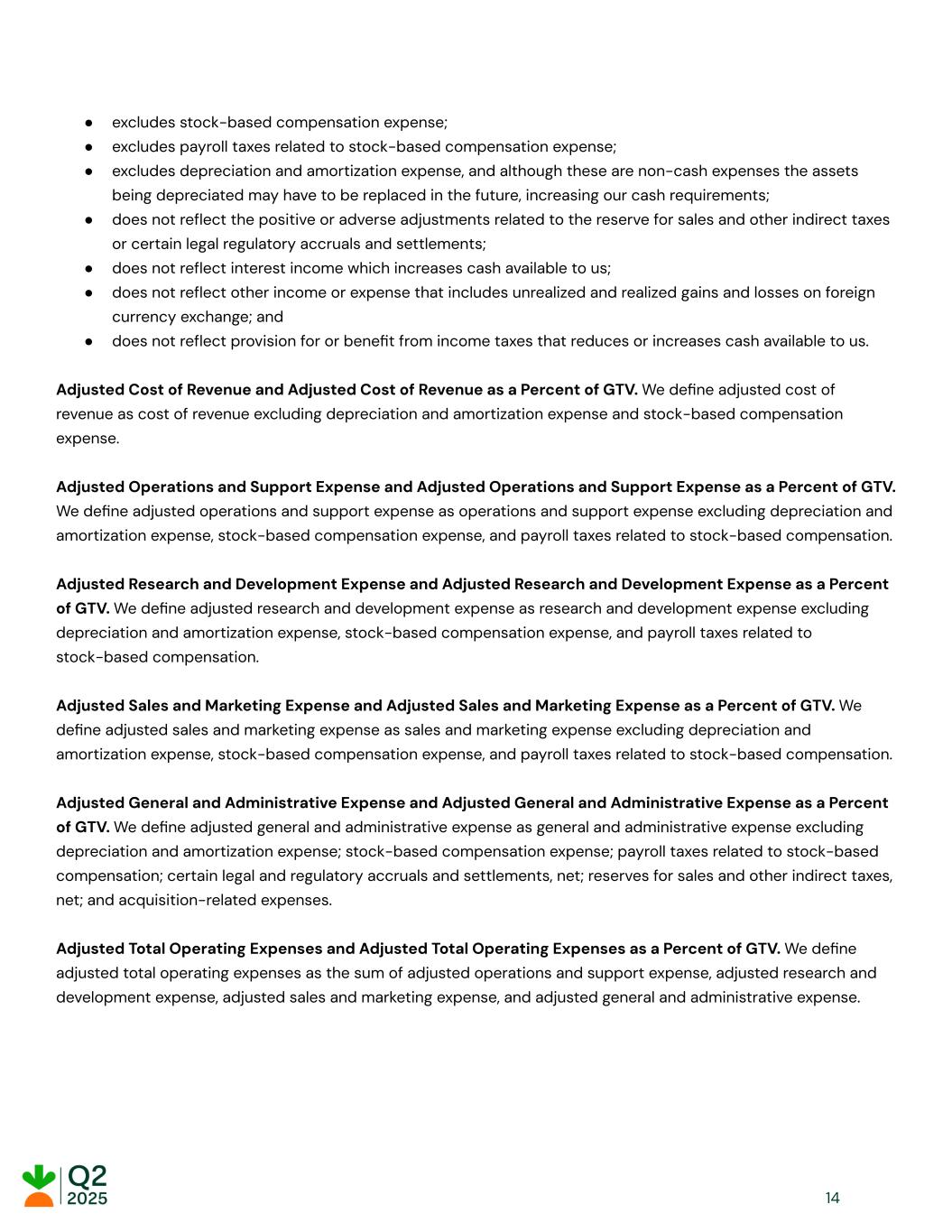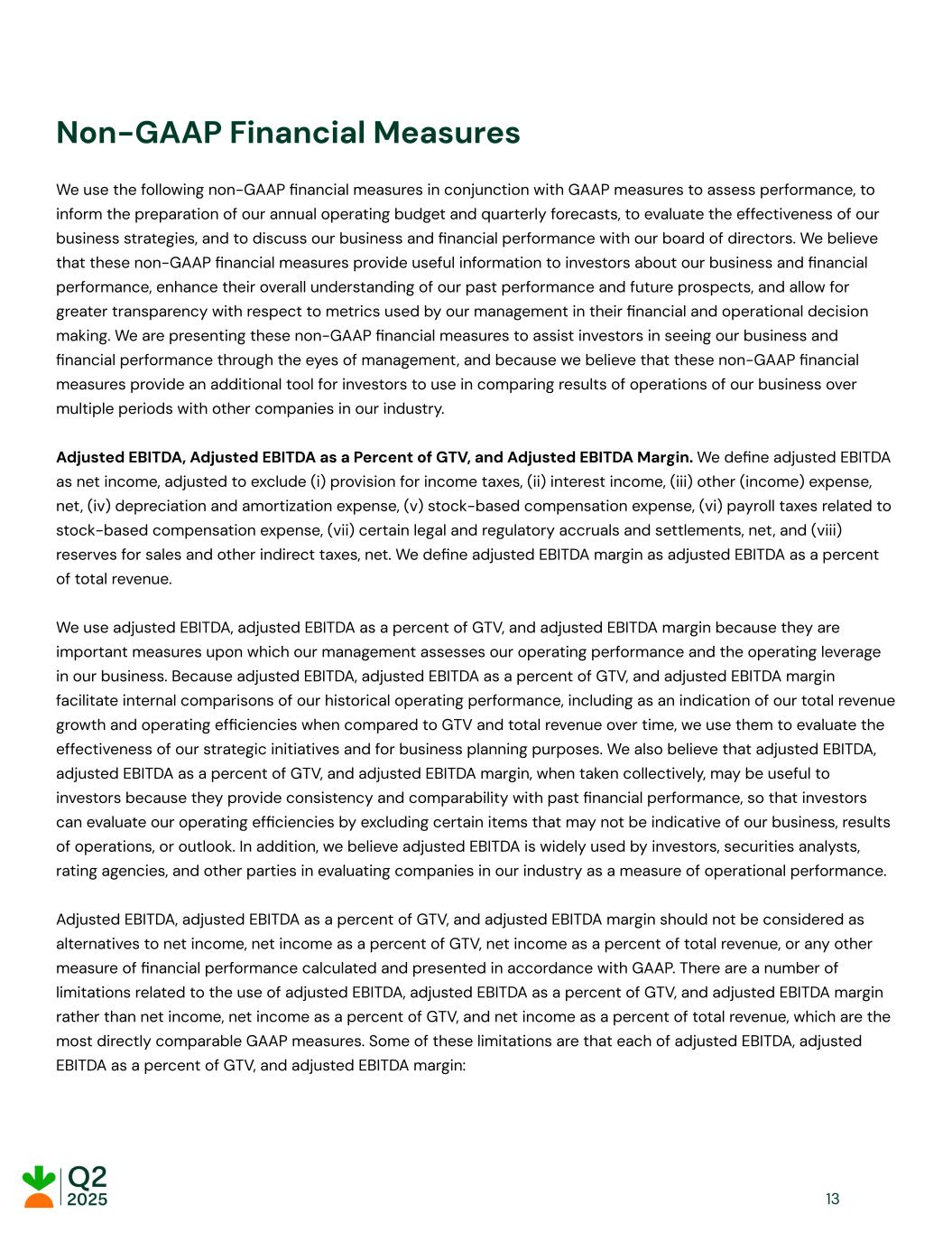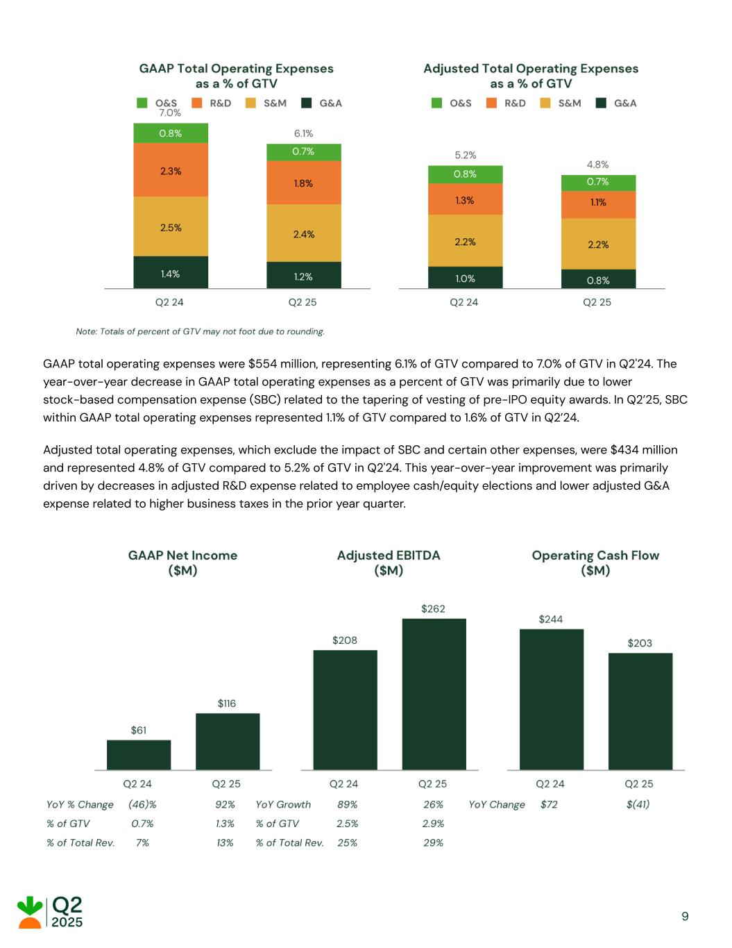 GAAP total operating expenses were $554 million, representing 6.1% of GTV compared to 7.0% of GTV in Q2'24. The year-over-year decrease in GAAP total operating expenses as a percent of GTV was primarily due to lower stock-based compensation expense (SBC) related to the tapering of vesting of pre-IPO equity awards. In Q2’25, SBC within GAAP total operating expenses represented 1.1% of GTV compared to 1.6% of GTV in Q2’24. Adjusted total operating expenses, which exclude the impact of SBC and certain other expenses, were $434 million and represented 4.8% of GTV compared to 5.2% of GTV in Q2'24. This year-over-year improvement was primarily driven by decreases in adjusted R&D expense related to employee cash/equity elections and lower adjusted G&A expense related to higher business taxes in the prior year quarter. 9