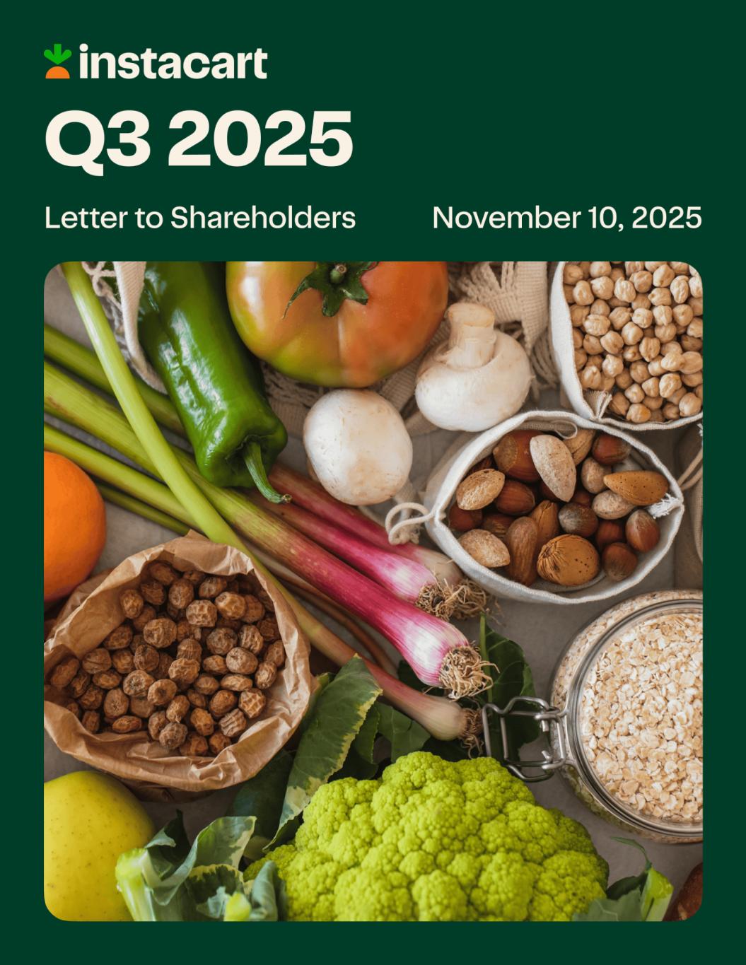 Dear Shareholders, This is my first letter to you as CEO of Instacart — and I couldn’t be more energized about where we’re headed. Over the past six years, I’ve had the privilege of helping build many of the capabilities and partnerships that make Instacart distinct. We’re so much more than a marketplace. Instacart is the leading technology and enablement partner for the grocery industry — helping consumers save time, retailers run their businesses, and brands connect with customers. In a trillion-dollar industry ripe for innovation – we power how groceries get discovered, bought, and delivered — and we’re just getting started. Our foundation is strong, our momentum is growing, and I’m confident we have all the right ingredients to accelerate into our next chapter. In Q3, we delivered another strong quarter: orders grew 14% year-over-year, GTV increased 10%, and both net income and Adjusted EBITDA expanded. Our strategy to accelerate online grocery adoption is working. We’re deepening customer and retailer relationships, expanding our ads ecosystem, and launching innovative AI-powered tools across all aspects of our business — all while driving profitable growth. Winning in grocery means nailing the fundamentals — selection, quality, convenience, and affordability. Fresh food is the hardest part of online grocery, and it’s where Instacart shines. Our deep retailer network, data from over 1.5 billion lifetime orders, and our experienced shopper network ensures we deliver the same freshness and care customers expect from the grocers they’ve trusted for generations. And we deliver fast. 75% of our delivery orders are on demand meaning they are on median delivered in 90 minutes or less, and approximately 25% of typical priority orders are delivered in less than 30 minutes. That combination of selection, quality, speed, and reliability builds trust — and when customers trust us with their perishables, they shop more often, spend more per order, and stay longer. Affordability is key to accelerating online grocery adoption. We’re helping retailers see how offering the same prices online and in-store drives both growth and loyalty. The results are clear: over the past year, retailers offering same-as-in-store pricing have on average grown more than 10 percentage points faster than those that haven’t — and they retain customers better on our platform. In recent months, more retailers are taking action. Pattison Food Group banners – including Buy Low Foods, Nesters Market, and Save-on-Foods – are now live on our marketplace at price parity, along with Best Buy and regional grocers like Choices Market and Jerry’s. Several national and regional grocers have also launched price parity pilots in markets including Chicago, Dallas, Nashville, Tampa, and Tucson. And we’re making these savings easier for customers to find — through improved merchandising and tools like Flyers and Loyalty that help retailers deliver even more value directly to customers. We’re also extending the power of our marketplace to retailers through our enterprise solutions — taking what we’ve built and putting it directly in their hands, at a scale no one else can match. Our enterprise offerings — including Storefront technologies, Fulfillment Services, Carrot Ads, Caper Carts, FoodStorm, Carrot Tags, and more — help retailers compete and grow online and in-store. And because we’re not a retailer ourselves, our success is fully aligned with theirs. When our partners grow, we grow. 1