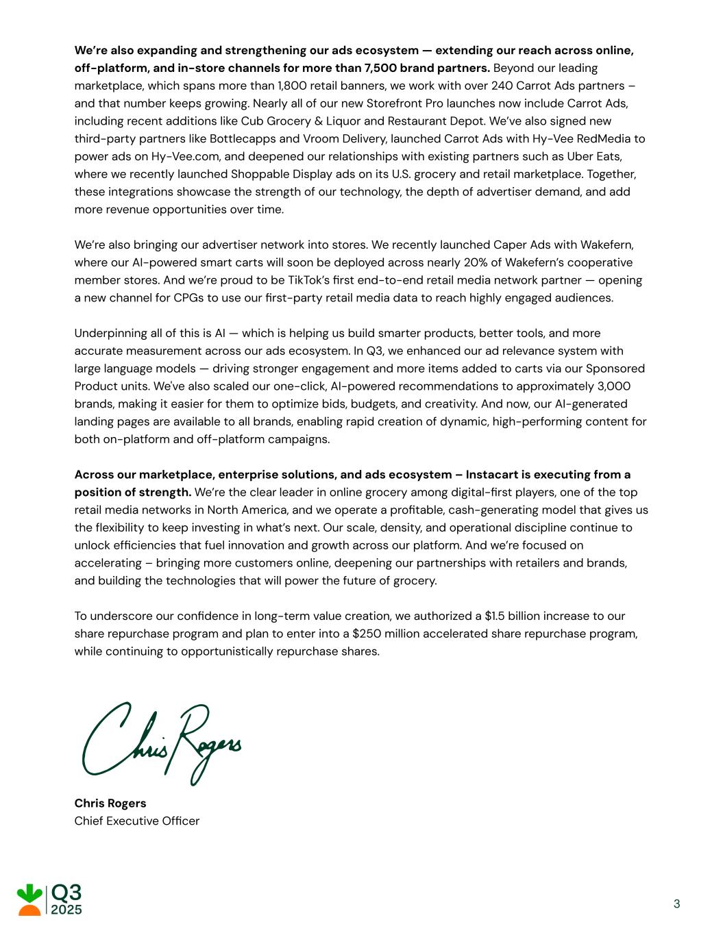 We’re also expanding and strengthening our ads ecosystem — extending our reach across online, off-platform, and in-store channels for more than 7,500 brand partners. Beyond our leading marketplace, which spans more than 1,800 retail banners, we work with over 240 Carrot Ads partners – and that number keeps growing. Nearly all of our new Storefront Pro launches now include Carrot Ads, including recent additions like Cub Grocery & Liquor and Restaurant Depot. We’ve also signed new third-party partners like Bottlecapps and Vroom Delivery, launched Carrot Ads with Hy-Vee RedMedia to power ads on Hy-Vee.com, and deepened our relationships with existing partners such as Uber Eats, where we recently launched Shoppable Display ads on its U.S. grocery and retail marketplace. Together, these integrations showcase the strength of our technology, the depth of advertiser demand, and add more revenue opportunities over time. We’re also bringing our advertiser network into stores. We recently launched Caper Ads with Wakefern, where our AI-powered smart carts will soon be deployed across nearly 20% of Wakefern’s cooperative member stores. And we’re proud to be TikTok’s first end-to-end retail media network partner — opening a new channel for CPGs to use our first-party retail media data to reach highly engaged audiences. Underpinning all of this is AI — which is helping us build smarter products, better tools, and more accurate measurement across our ads ecosystem. In Q3, we enhanced our ad relevance system with large language models — driving stronger engagement and more items added to carts via our Sponsored Product units. We've also scaled our one-click, AI-powered recommendations to approximately 3,000 brands, making it easier for them to optimize bids, budgets, and creativity. And now, our AI-generated landing pages are available to all brands, enabling rapid creation of dynamic, high-performing content for both on-platform and off-platform campaigns. Across our marketplace, enterprise solutions, and ads ecosystem – Instacart is executing from a position of strength. We’re the clear leader in online grocery among digital-first players, one of the top retail media networks in North America, and we operate a profitable, cash-generating model that gives us the flexibility to keep investing in what’s next. Our scale, density, and operational discipline continue to unlock efficiencies that fuel innovation and growth across our platform. And we’re focused on accelerating – bringing more customers online, deepening our partnerships with retailers and brands, and building the technologies that will power the future of grocery. To underscore our confidence in long-term value creation, we authorized a $1.5 billion increase to our share repurchase program and plan to enter into a $250 million accelerated share repurchase program, while continuing to opportunistically repurchase shares. Chris Rogers Chief Executive Officer 3