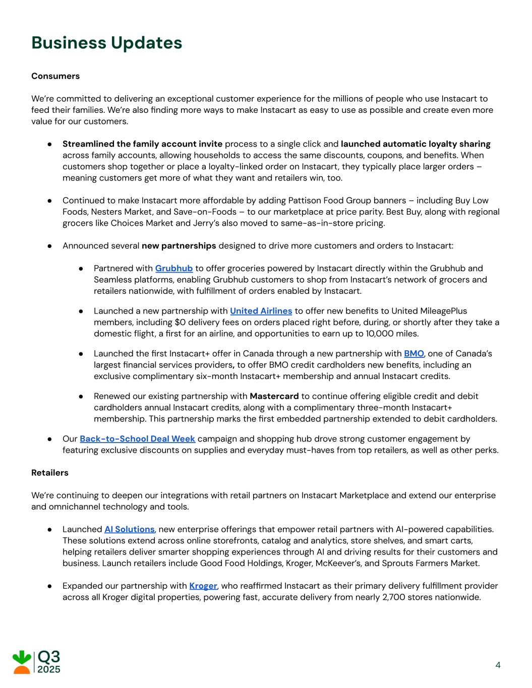 Business Updates Consumers We’re committed to delivering an exceptional customer experience for the millions of people who use Instacart to feed their families. We’re also finding more ways to make Instacart as easy to use as possible and create even more value for our customers. ● Streamlined the family account invite process to a single click and launched automatic loyalty sharing across family accounts, allowing households to access the same discounts, coupons, and benefits. When customers shop together or place a loyalty-linked order on Instacart, they typically place larger orders – meaning customers get more of what they want and retailers win, too. ● Continued to make Instacart more affordable by adding Pattison Food Group banners – including Buy Low Foods, Nesters Market, and Save-on-Foods – to our marketplace at price parity. Best Buy, along with regional grocers like Choices Market and Jerry’s also moved to same-as-in-store pricing. ● Announced several new partnerships designed to drive more customers and orders to Instacart: ● Partnered with Grubhub to offer groceries powered by Instacart directly within the Grubhub and Seamless platforms, enabling Grubhub customers to shop from Instacart’s network of grocers and retailers nationwide, with fulfillment of orders enabled by Instacart. ● Launched a new partnership with United Airlines to offer new benefits to United MileagePlus members, including $0 delivery fees on orders placed right before, during, or shortly after they take a domestic flight, a first for an airline, and opportunities to earn up to 10,000 miles. ● Launched the first Instacart+ offer in Canada through a new partnership with BMO, one of Canada’s largest financial services providers, to offer BMO credit cardholders new benefits, including an exclusive complimentary six-month Instacart+ membership and annual Instacart credits. ● Renewed our existing partnership with Mastercard to continue offering eligible credit and debit cardholders annual Instacart credits, along with a complimentary three-month Instacart+ membership. This partnership marks the first embedded partnership extended to debit cardholders. ● Our Back-to-School Deal Week campaign and shopping hub drove strong customer engagement by featuring exclusive discounts on supplies and everyday must-haves from top retailers, as well as other perks. Retailers We’re continuing to deepen our integrations with retail partners on Instacart Marketplace and extend our enterprise and omnichannel technology and tools. ● Launched AI Solutions, new enterprise offerings that empower retail partners with AI-powered capabilities. These solutions extend across online storefronts, catalog and analytics, store shelves, and smart carts, helping retailers deliver smarter shopping experiences through AI and driving results for their customers and business. Launch retailers include Good Food Holdings, Kroger, McKeever’s, and Sprouts Farmers Market. ● Expanded our partnership with Kroger, who reaffirmed Instacart as their primary delivery fulfillment provider across all Kroger digital properties, powering fast, accurate delivery from nearly 2,700 stores nationwide. 4