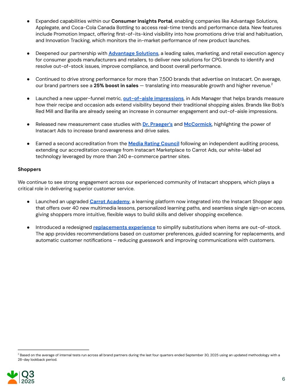 ● Expanded capabilities within our Consumer Insights Portal, enabling companies like Advantage Solutions, Applegate, and Coca-Cola Canada Bottling to access real-time trends and performance data. New features include Promotion Impact, offering first-of-its-kind visibility into how promotions drive trial and habituation, and Innovation Tracking, which monitors the in-market performance of new product launches. ● Deepened our partnership with Advantage Solutions, a leading sales, marketing, and retail execution agency for consumer goods manufacturers and retailers, to deliver new solutions for CPG brands to identify and resolve out-of-stock issues, improve compliance, and boost overall performance. ● Continued to drive strong performance for more than 7,500 brands that advertise on Instacart. On average, our brand partners see a 25% boost in sales — translating into measurable growth and higher revenue.2 ● Launched a new upper-funnel metric, out-of-aisle impressions, in Ads Manager that helps brands measure how their recipe and occasion ads extend visibility beyond their traditional shopping aisles. Brands like Bob’s Red Mill and Barilla are already seeing an increase in consumer engagement and out-of-aisle impressions. ● Released new measurement case studies with Dr. Praeger’s and McCormick, highlighting the power of Instacart Ads to increase brand awareness and drive sales. ● Earned a second accreditation from the Media Rating Council following an independent auditing process, extending our accreditation coverage from Instacart Marketplace to Carrot Ads, our white-label ad technology leveraged by more than 240 e-commerce partner sites. Shoppers We continue to see strong engagement across our experienced community of Instacart shoppers, which plays a critical role in delivering superior customer service. ● Launched an upgraded Carrot Academy, a learning platform now integrated into the Instacart Shopper app that offers over 40 new multimedia lessons, personalized learning paths, and seamless single sign-on access, giving shoppers more intuitive, flexible ways to build skills and deliver shopping excellence. ● Introduced a redesigned replacements experience to simplify substitutions when items are out-of-stock. The app provides recommendations based on customer preferences, guided scanning for replacements, and automatic customer notifications – reducing guesswork and improving communications with customers. 2 Based on the average of internal tests run across all brand partners during the last four quarters ended September 30, 2025 using an updated methodology with a 28-day lookback period. 6