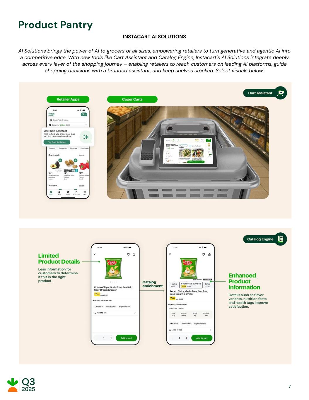 Product Pantry INSTACART AI SOLUTIONS AI Solutions brings the power of AI to grocers of all sizes, empowering retailers to turn generative and agentic AI into a competitive edge. With new tools like Cart Assistant and Catalog Engine, Instacart’s AI Solutions integrate deeply across every layer of the shopping journey – enabling retailers to reach customers on leading AI platforms, guide shopping decisions with a branded assistant, and keep shelves stocked. Select visuals below: 7