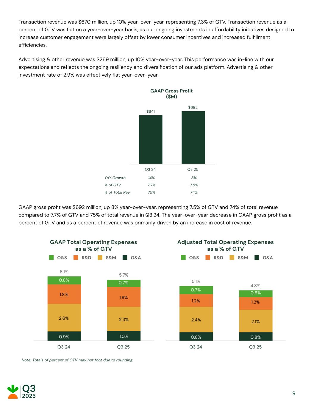 That alignment is paying off. Our Storefront technologies now power more than 350 grocers’ e-commerce sites – and it’s built to scale, as we expand into new categories and regions. We recently launched Storefront Pro with Cub Grocery & Liquor, a leading Midwest grocer, and signed a new partnership with Merchants Distributors, who collectively represents hundreds of local independent grocers. We also rolled out Storefront Pro for Restaurant Depot, one of the biggest wholesalers serving independent restaurants, and introduced Instacart Business features within Storefront and Storefront Pro to help grocers manage complex ordering needs. We also see an exciting international opportunity ahead. Building on our acquisition of Wynshop – which powers storefronts for retailers in Europe and Australia – we’re seeing strong demand and clear product-market fit for our technologies abroad. AI is the newest pillar of our enterprise offerings – and we’re introducing Instacart’s AI solutions at the exact moment retailers need us most. As AI transforms how people shop for groceries and feed their families, our tools bring powerful, practical capabilities to help grocers compete and win — from personalized shopping assistants and smarter catalog insights to real-time shelf intelligence and instant, self-serve analytics. Built for the complexity of grocery and powered by our unique insights, Instacart’s AI Solutions deliver more personalized, connected, and efficient shopping experiences — online and in-stores. We’re partnering with leading retailers like Good Food Holdings, Kroger, McKeever’s, and Sprouts Farmers Market on these solutions and are excited to build on this momentum. Together, the combination of our marketplace scale and enterprise platform make our business stronger and more resilient. Even when retailers participate on other marketplaces, the depth of our integrations and the differentiated value of our enterprise solutions empower us to achieve consistent double-digit annual GTV growth with those retailers on average1. We expect Kroger will be another example of this, especially as they just doubled down on Instacart as their primary delivery fulfillment partner across all Kroger digital properties. Today, more than 80% of our GTV comes from non-exclusive retailers, and among the exclusive GTV that remains, the majority is with retailers who partner with us on at least one enterprise solution. 1 Includes total GTV from both marketplace and enterprise for Instacart's top enterprise retailers that have launched on other marketplace(s) for at least one year. Average line represents the linear regression line of best fit. 2