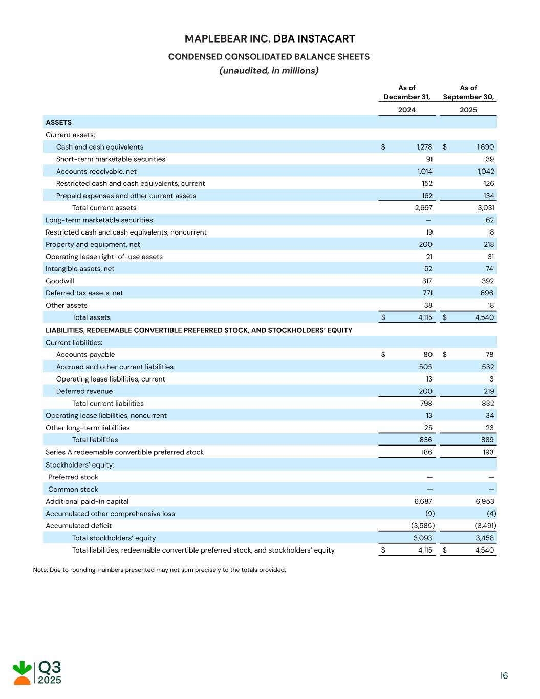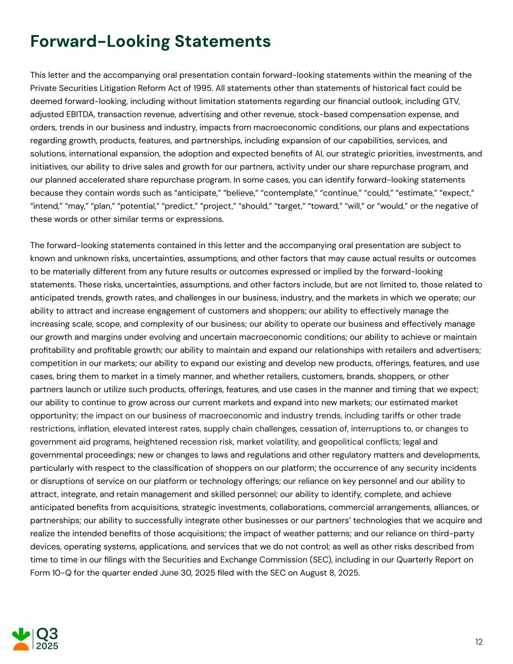● Continued momentum with our e-commerce solutions, including: ● Restaurant Depot, a wholesale supplier that sells primarily to foodservice professionals, launched on Storefront Pro. We also extended Instacart Business capabilities to all Storefront and Storefront Pro retailers, enabling hundreds of retailers to serve business customers directly through their e-commerce sites with features like bulk ordering, multi-user management, and account oversight. ● Launched Cub Grocery & Liquor and Piggly Wiggly Midwest and signed Dierbergs to Storefront Pro, our premier white-label e-commerce experience, to help each retailer expand their e-commerce presence. ● Partnered with Merchants Distributors, LLC (MDI), a leading wholesale grocery distributor, to bring Instacart’s capabilities to hundreds of independent grocers. MDI members can now join the Instacart marketplace, establish an e-commerce site with Storefront Pro, and access Carrot Ads. ● Retailers are continuing to embrace our other in-store technologies, including: ● Continued momentum with Caper Carts, including: ■ Partnered with UK grocer Morrisons to bring Caper Carts to the UK, marking Instacart’s first retail partnership in the country with one of the UK’s largest supermarket chains. Caper Carts will launch at Morrisons in early 2026, with plans to expand across more stores. ■ Launched new Caper Cart omnichannel savings capabilities, including EBT SNAP item eligibility tracking, on-cart loyalty sign-up, omnichannel savings, and improved product recommendations, making it easier for customers to maximize their benefits. ● Completed the launch of FoodStorm, our catering and prepared foods software, at all five Ahold Delhaize USA banners – our largest FoodStorm deployment to date – along with chain wide rollouts at new partners like Cub Grocery & Liquor, Geissler's Supermarket, Harmons Grocery, Price Chopper Kansas City, and Tops Markets. Brands With our unique data, insights, and partnerships, the Instacart Ads ecosystem is a one-stop advertising platform, connecting brands with high-intent, incremental customers at scale. ● Announced Instacart as the first retail media network partner to provide TikTok with native end-to-end self-service retail media capabilities. Brands advertising on TikTok can now leverage Instacart’s first-party data to enhance their campaigns and make their ads instantly shoppable, driving purchases to Instacart. ● Continued momentum with Carrot Ads – we signed Vroom Delivery, an e-commerce platform with a network of 3,500 convenience stores nationwide, launched Carrot Ads with Hy-Vee RedMedia on Hy-Vee.com, and deepened our relationships with existing partners, including Uber Eats, where we recently launched Shoppable Display ads on its U.S grocery and retail marketplace. ● Launched Caper Ads with Wakefern, where our AI-powered smart carts will soon be deployed at nearly 20% of Wakefern’s cooperative member stores. Now, new and existing shoppable display campaigns can seamlessly extend across the Instacart Marketplace and in-store Caper Cart digital screens. 5