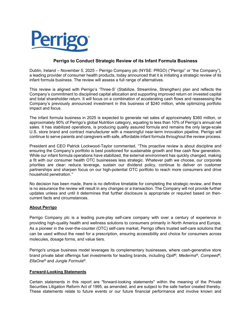 ペリゴ社、2025年第3四半期の継続事業の業績を発表