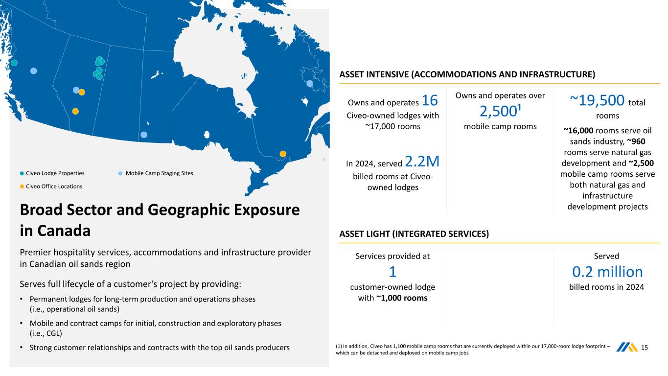 14 Strong Platform for Continued Growth, Supported by Strategic Acquisitions AUSTRALIAN GROWTH STRATEGY Strong cash flow from owned-village business augmented by recent acquisition, funding capital returns and further growth Built critical mass in integrated services business organically after original 2019 acquisition (originally serving seven villages in Western Australia) Continuing geographic expansion into South Australia and Queensland, and eventually into non- natural resource markets 1 2 Civeo Villages Civeo Integrated Services Villages NT QLD SA NSW VIC TAS WA 2 2 2 1 New Civeo Owned Villages