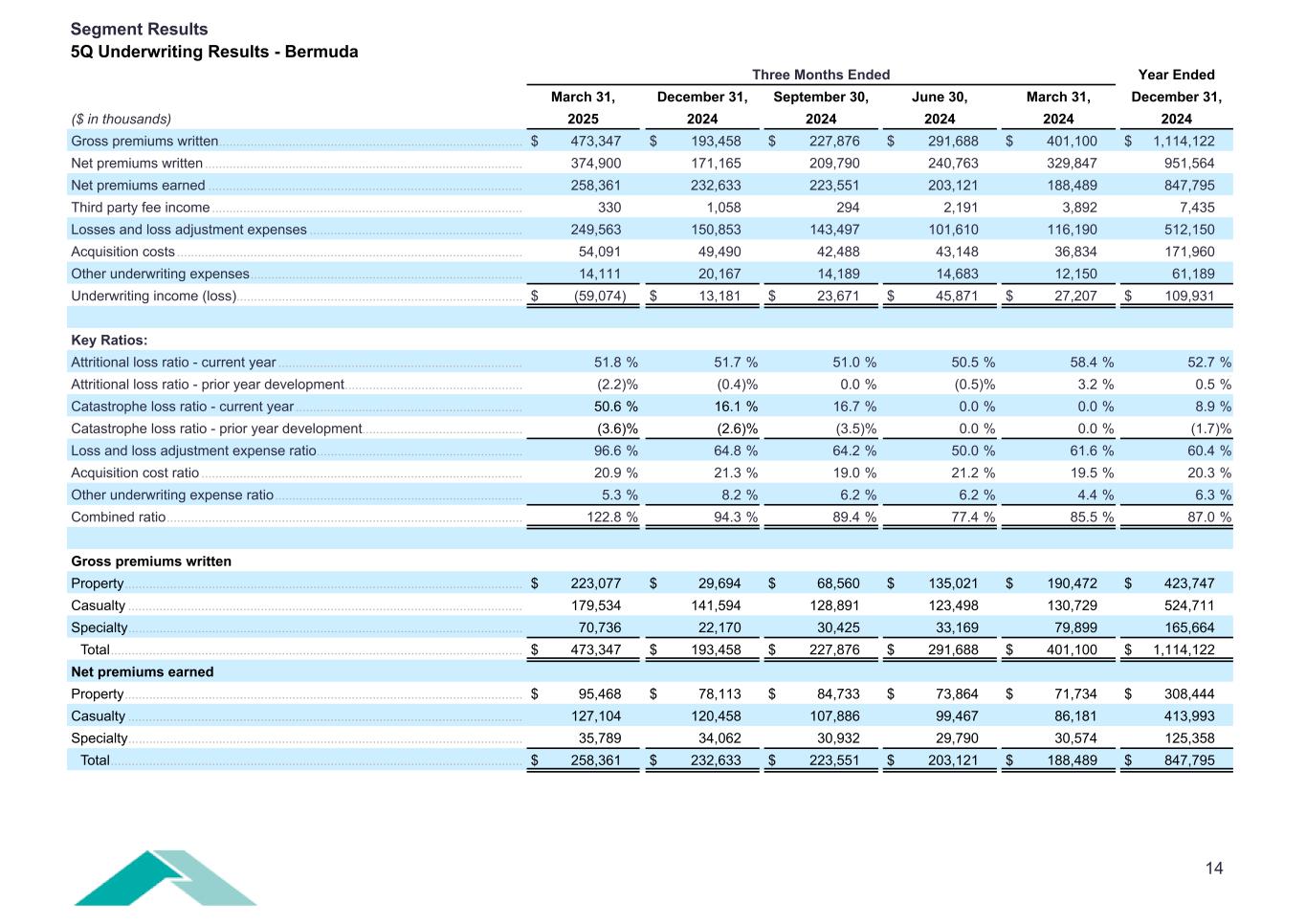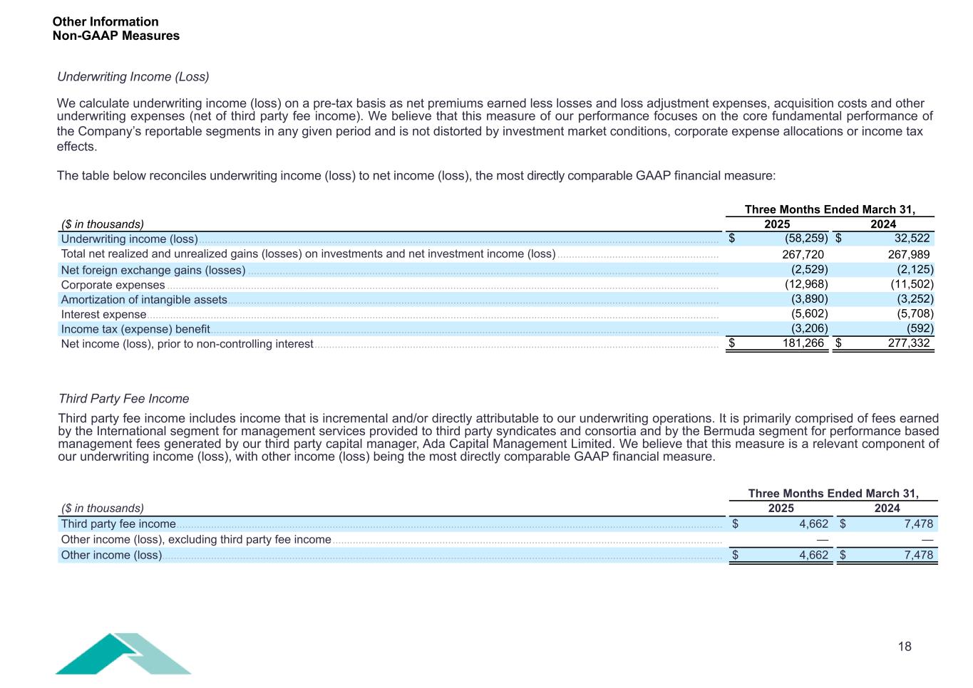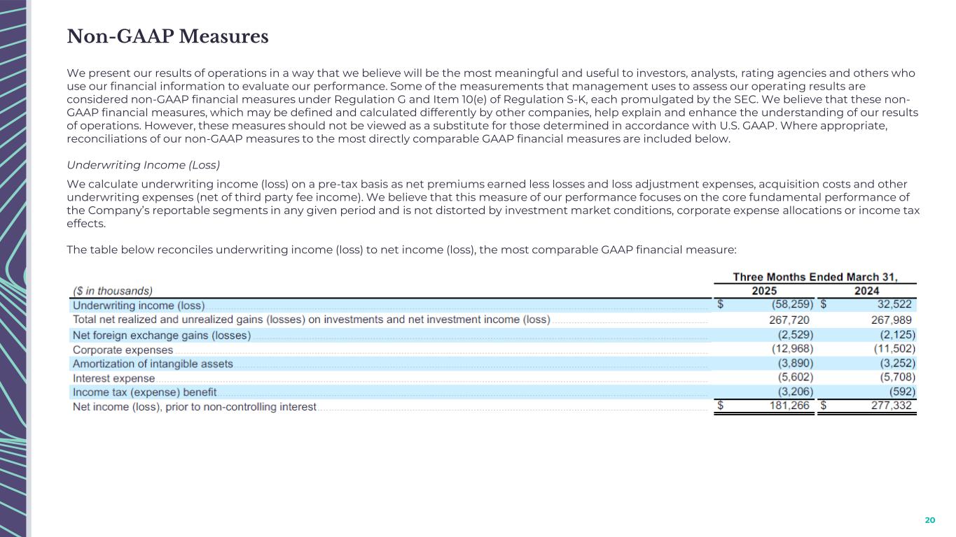 -再保険控除後の損害率(当期)は51.8%。6.6ポイントの減少は、ボルチモア橋の崩落事故の影響を受けた2024年同期と比べ、当四半期に大口損害がなかったことが主因。