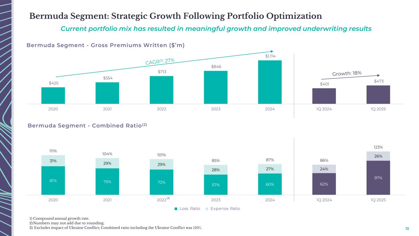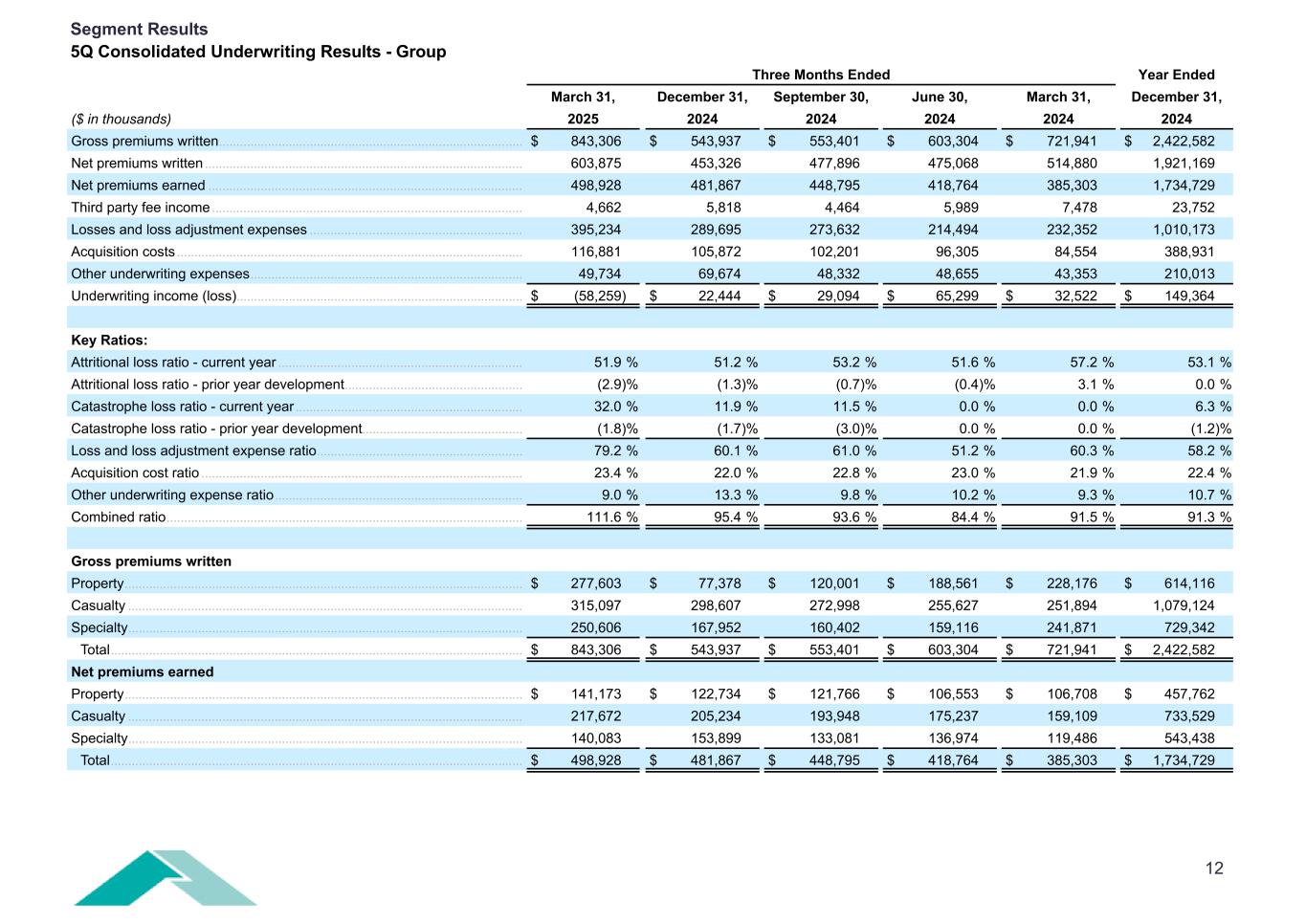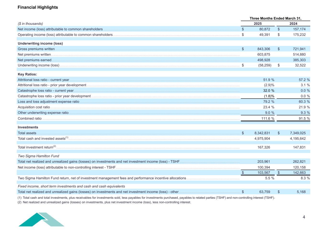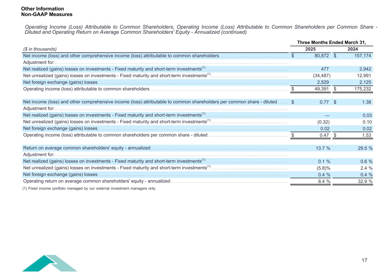 -再保険控除後の損害率(当期)は51.8%。6.6ポイントの減少は、ボルチモア橋の崩落事故の影響を受けた2024年同期と比べ、当四半期に大口損害がなかったことが主因。