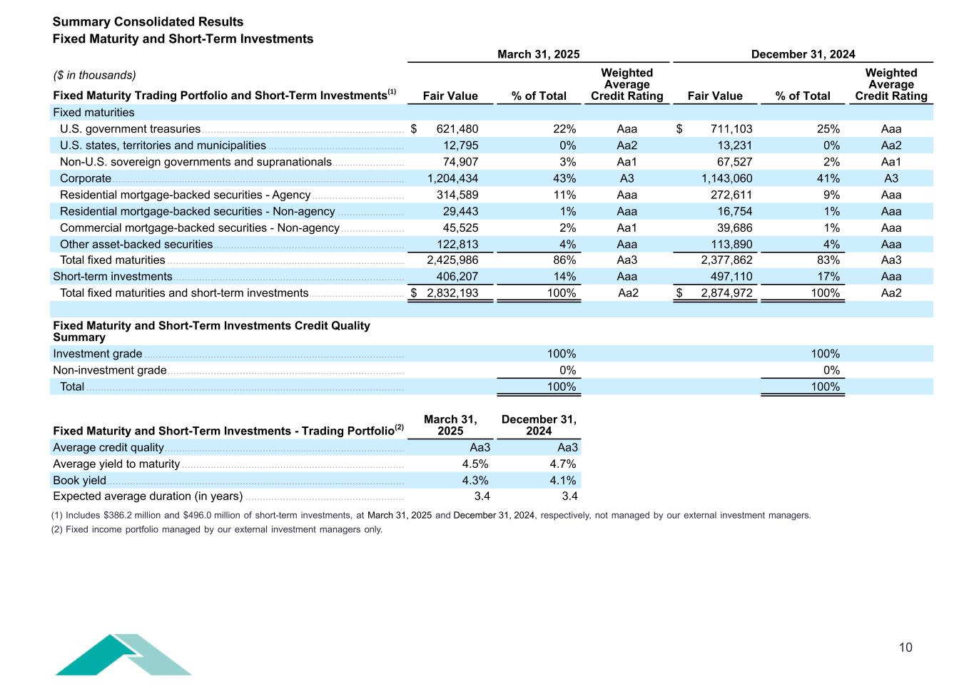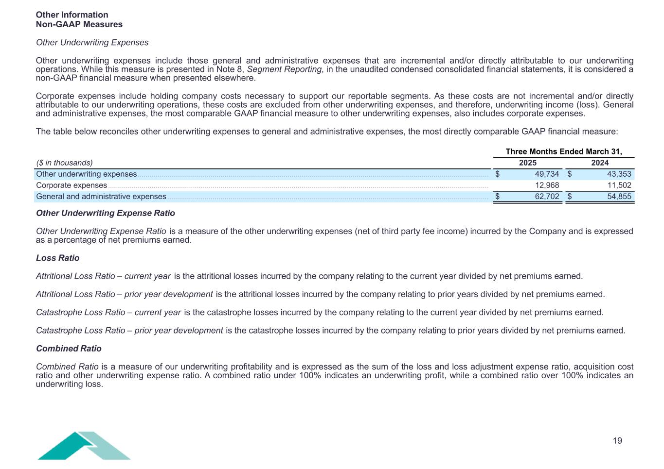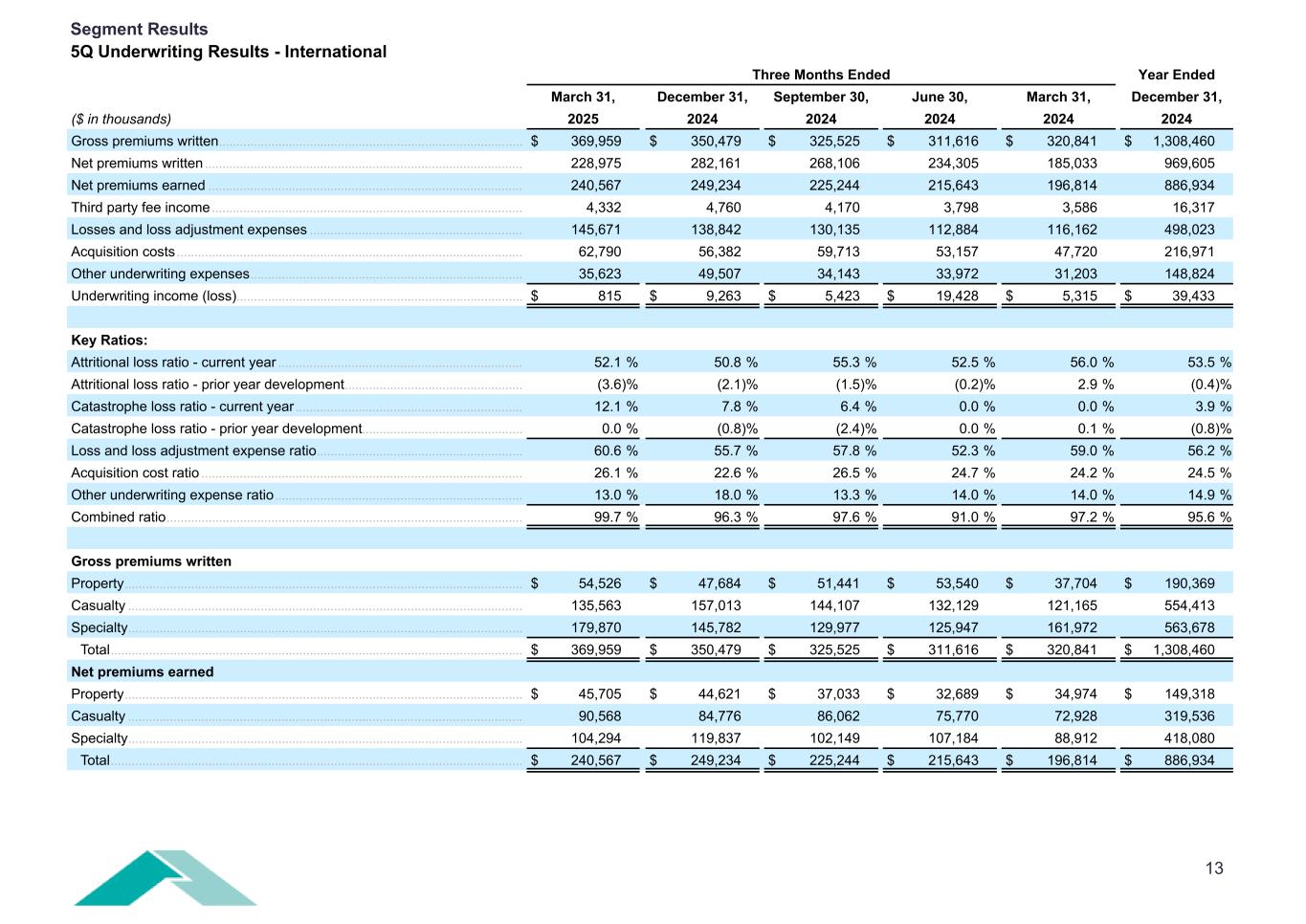 -再保険控除後の損害率(当期)は 51.9%であった。5.3ポイントの低下は、フランシス・スコット・キー・ボルティモア橋崩落事故の影響を受けた2024年同期と比べ、当四半期に大きな損害がなかったことが主な要因である。