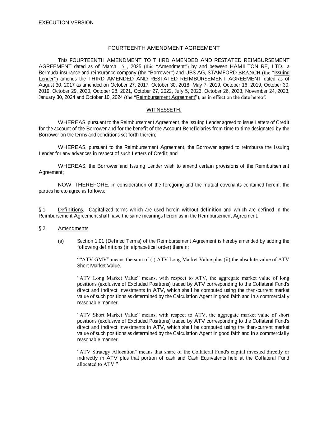 EXECUTION VERSION FOURTEENTH AMENDMENT AGREEMENT This FOURTEENTH AMENDMENT TO THIRD AMENDED AND RESTATED REIMBURSEMENT AGREEMENT dated as of March _5_, 2025 (this “Amendment”) by and between HAMILTON RE, LTD., a Bermuda insurance and reinsurance company (the “Borrower”) and UBS AG, STAMFORD BRANCH (the “Issuing Lender”) amends the THIRD AMENDED AND RESTATED REIMBURSEMENT AGREEMENT dated as of August 30, 2017 as amended on October 27, 2017, October 30, 2018, May 7, 2019, October 16, 2019, October 30, 2019, October 29, 2020, October 28, 2021, October 27, 2022, July 5, 2023, October 26, 2023, November 24, 2023, January 30, 2024 and October 10, 2024 (the “Reimbursement Agreement”), as in effect on the date hereof. WITNESSETH: WHEREAS, pursuant to the Reimbursement Agreement, the Issuing Lender agreed to issue Letters of Credit for the account of the Borrower and for the benefit of the Account Beneficiaries from time to time designated by the Borrower on the terms and conditions set forth therein; WHEREAS, pursuant to the Reimbursement Agreement, the Borrower agreed to reimburse the Issuing Lender for any advances in respect of such Letters of Credit; and WHEREAS, the Borrower and Issuing Lender wish to amend certain provisions of the Reimbursement Agreement; NOW, THEREFORE, in consideration of the foregoing and the mutual covenants contained herein, the parties hereto agree as follows: § 1 Definitions. Capitalized terms which are used herein without definition and which are defined in the Reimbursement Agreement shall have the same meanings herein as in the Reimbursement Agreement. § 2 Amendments. (a) Section 1.01 (Defined Terms) of the Reimbursement Agreement is hereby amended by adding the following definitions (in alphabetical order) therein: ““ATV GMV” means the sum of (i) ATV Long Market Value plus (ii) the absolute value of ATV Short Market Value. “ATV Long Market Value” means, with respect to ATV, the aggregate market value of long positions (exclusive of Excluded Positions) traded by ATV corresponding to the Collateral Fund's direct and indirect investments in ATV, which shall be computed using the then-current market value of such positions as determined by the Calculation Agent in good faith and in a commercially reasonable manner. “ATV Short Market Value” means, with respect to ATV, the aggregate market value of short positions (exclusive of Excluded Positions) traded by ATV corresponding to the Collateral Fund's direct and indirect investments in ATV, which shall be computed using the then-current market value of such positions as determined by the Calculation Agent in good faith and in a commercially reasonable manner. “ATV Strategy Allocation” means that share of the Collateral Fund's capital invested directly or indirectly in ATV plus that portion of cash and Cash Equivalents held at the Collateral Fund allocated to ATV.”