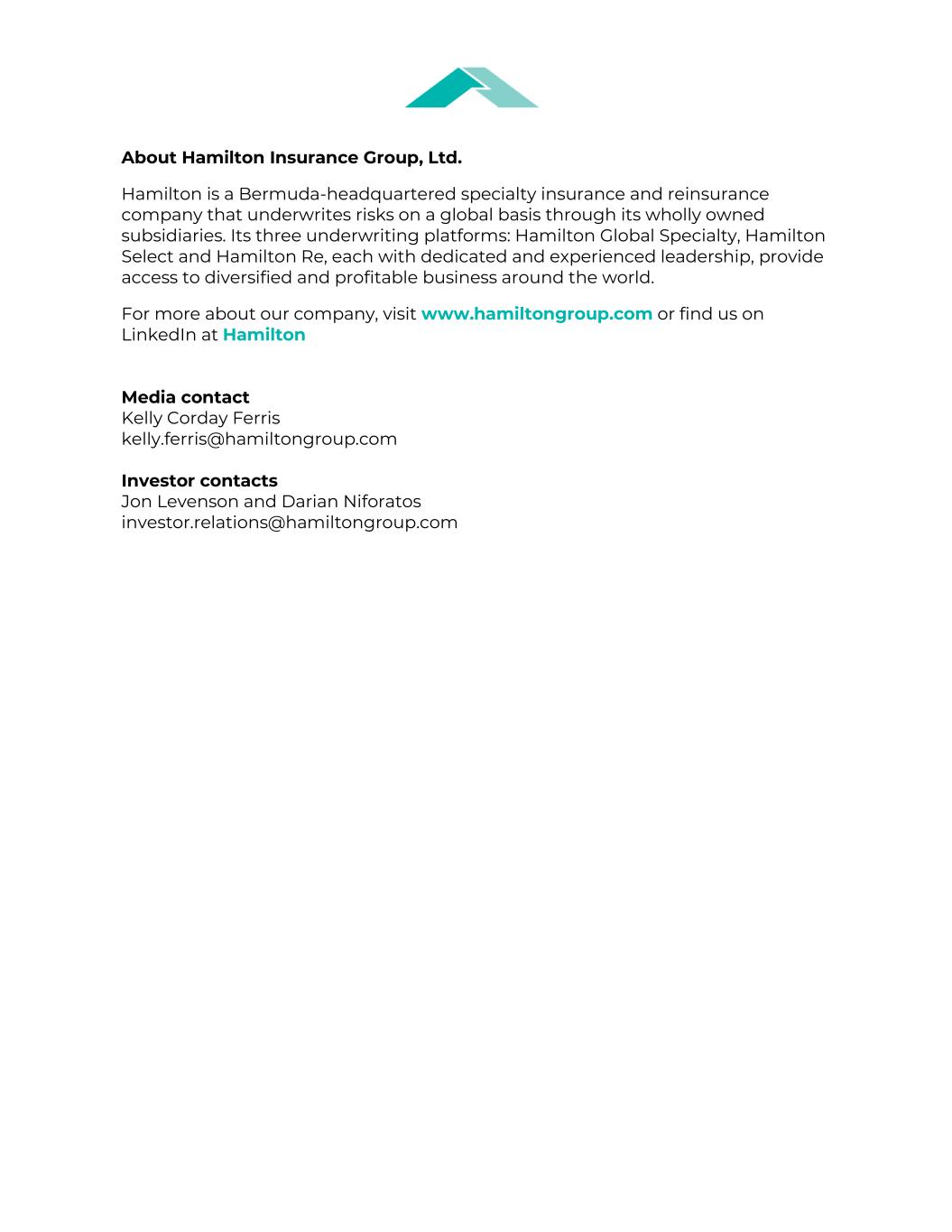About Hamilton Insurance Group, Ltd. Hamilton is a Bermuda-headquartered specialty insurance and reinsurance company that underwrites risks on a global basis through its wholly owned subsidiaries. Its three underwriting platforms: Hamilton Global Specialty, Hamilton Select and Hamilton Re, each with dedicated and experienced leadership, provide access to diversified and profitable business around the world. For more about our company, visit www.hamiltongroup.com or find us on LinkedIn at Hamilton Media contact Kelly Corday Ferris kelly.ferris@hamiltongroup.com Investor contacts Jon Levenson and Darian Niforatos investor.relations@hamiltongroup.com