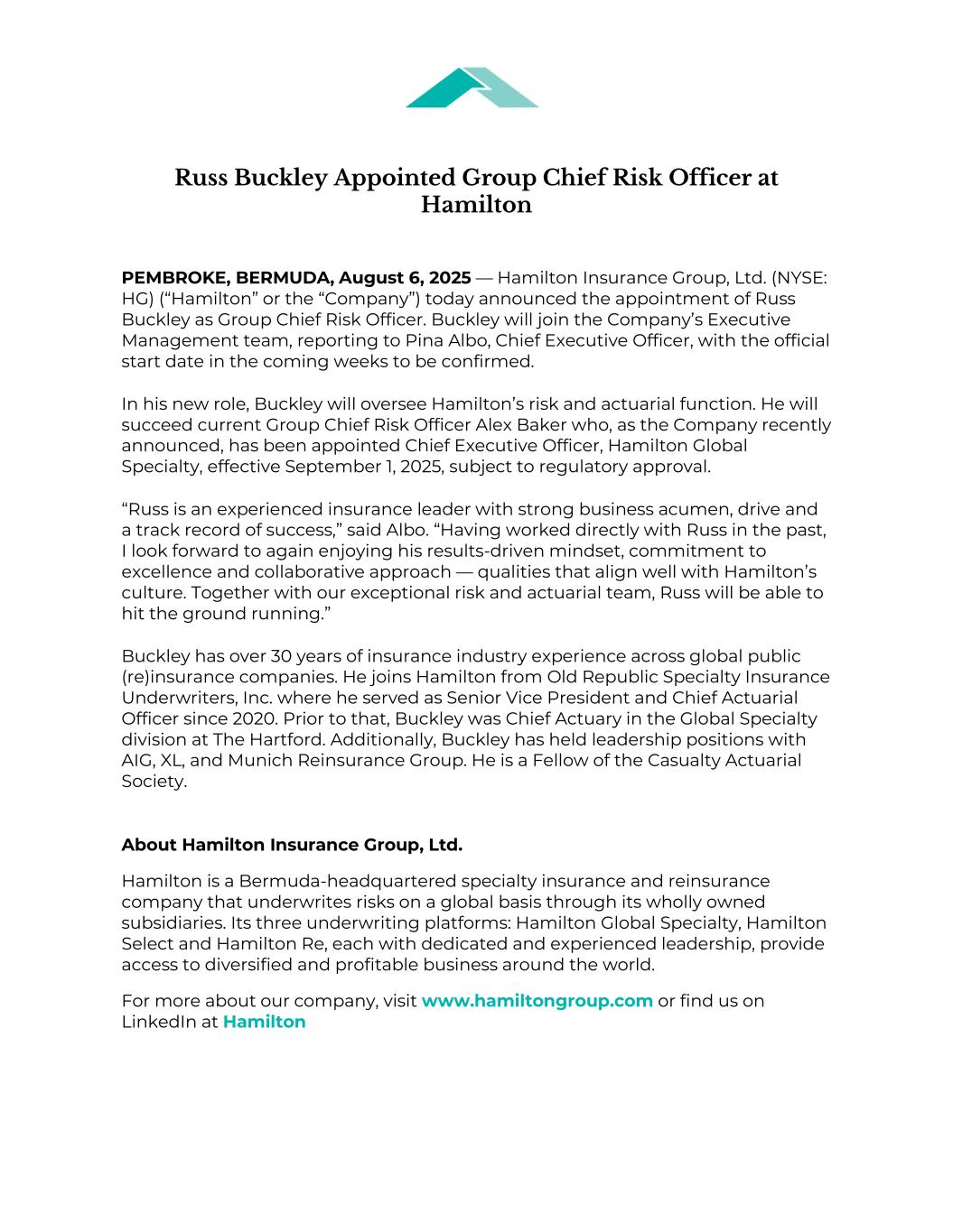Russ Buckley Appointed Group Chief Risk Officer at Hamilton PEMBROKE, BERMUDA, August 6, 2025 — Hamilton Insurance Group, Ltd. (NYSE: HG) (“Hamilton” or the “Company”) today announced the appointment of Russ Buckley as Group Chief Risk Officer. Buckley will join the Company’s Executive Management team, reporting to Pina Albo, Chief Executive Officer, with the official start date in the coming weeks to be confirmed. In his new role, Buckley will oversee Hamilton’s risk and actuarial function. He will succeed current Group Chief Risk Officer Alex Baker who, as the Company recently announced, has been appointed Chief Executive Officer, Hamilton Global Specialty, effective September 1, 2025, subject to regulatory approval. “Russ is an experienced insurance leader with strong business acumen, drive and a track record of success,” said Albo. “Having worked directly with Russ in the past, I look forward to again enjoying his results-driven mindset, commitment to excellence and collaborative approach — qualities that align well with Hamilton’s culture. Together with our exceptional risk and actuarial team, Russ will be able to hit the ground running.” Buckley has over 30 years of insurance industry experience across global public (re)insurance companies. He joins Hamilton from Old Republic Specialty Insurance Underwriters, Inc. where he served as Senior Vice President and Chief Actuarial Officer since 2020. Prior to that, Buckley was Chief Actuary in the Global Specialty division at The Hartford. Additionally, Buckley has held leadership positions with AIG, XL, and Munich Reinsurance Group. He is a Fellow of the Casualty Actuarial Society. About Hamilton Insurance Group, Ltd. Hamilton is a Bermuda-headquartered specialty insurance and reinsurance company that underwrites risks on a global basis through its wholly owned subsidiaries. Its three underwriting platforms: Hamilton Global Specialty, Hamilton Select and Hamilton Re, each with dedicated and experienced leadership, provide access to diversified and profitable business around the world. For more about our company, visit www.hamiltongroup.com or find us on LinkedIn at Hamilton