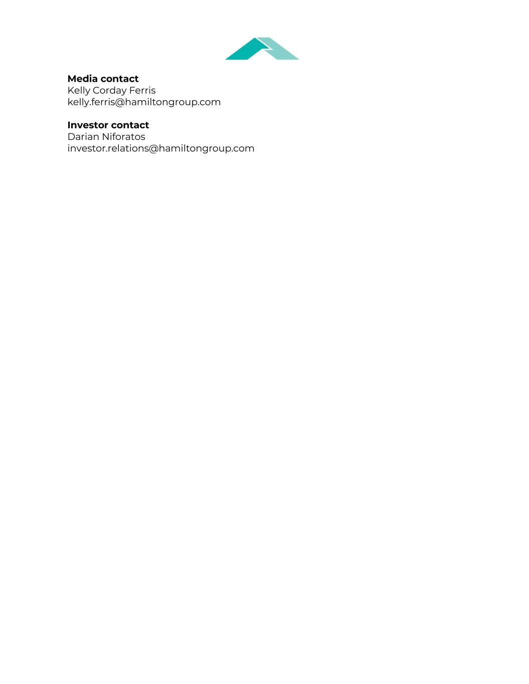 Media contact Kelly Corday Ferris kelly.ferris@hamiltongroup.com Investor contact Darian Niforatos investor.relations@hamiltongroup.com