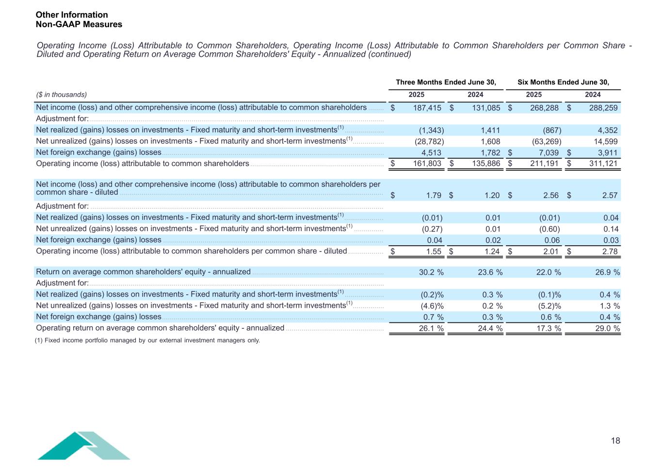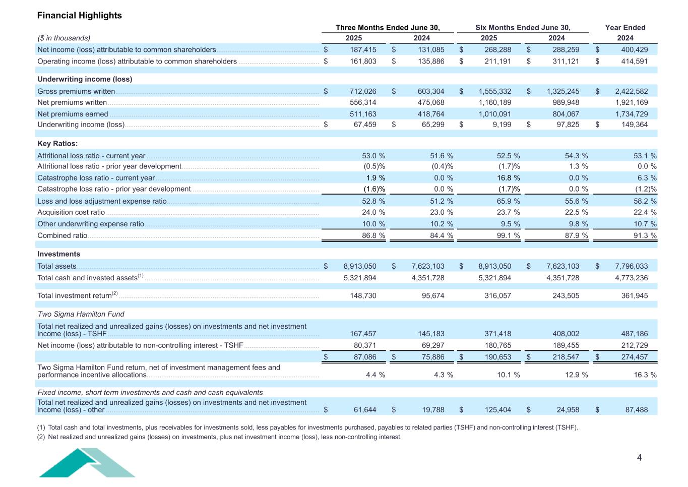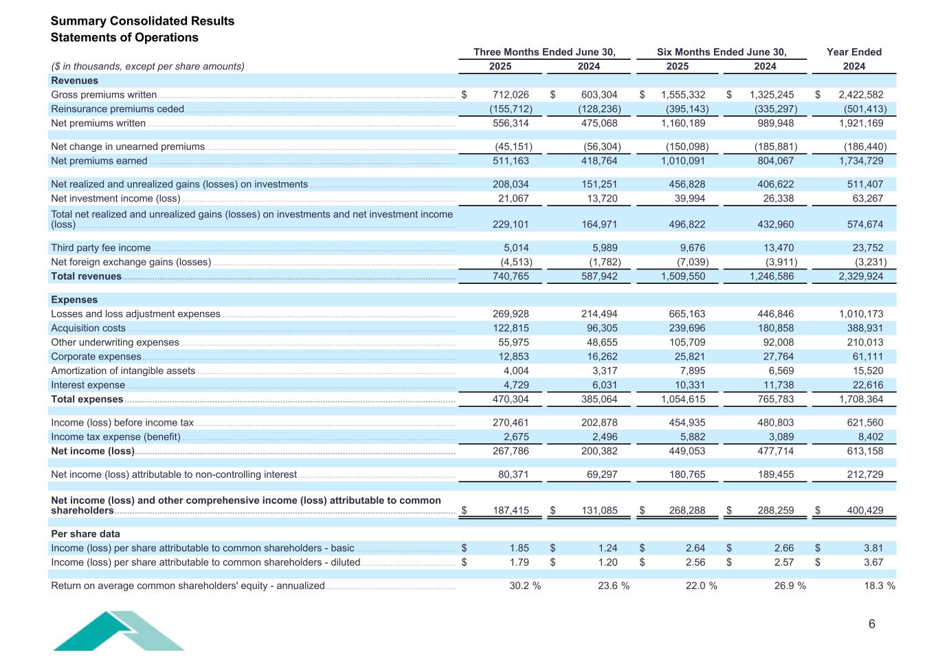 バミューダ、ペンブローク、2025 年 8 月 6 日 - ハミルトン・インシュアランス・グループ(Hamilton Insurance Group, Ltd.(NYSE:HG、以下「ハミルトン」または「当社」)は本日、2025年6月30日に終了した第2四半期の業績を発表した。