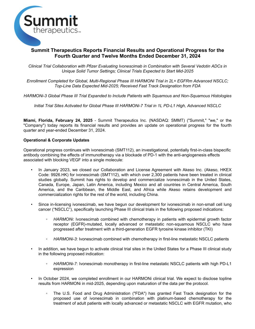 Summit Therapeutics Reports Financial Results and Operational Progress for the Fourth Quarter and Twelve Months Ended December 31, 2024 Clinical Trial Collaboration with Pfizer Evaluating Ivonescimab in Combination with Several Vedotin ADCs in Unique Solid Tumor Settings; Clinical Trials Expected to Start Mid-2025 Enrollment Completed for Global, Multi-Regional Phase III HARMONi Trial in 2L+ EGFRm Advanced NSCLC; Top-Line Data Expected Mid-2025; Received Fast Track Designation from FDA HARMONi-3 Global Phase III Trial Expanded to Include Patients with Squamous and Non-Squamous Histologies Initial Trial Sites Activated for Global Phase III HARMONi-7 Trial in 1L PD-L1 High, Advanced NSCLC Miami, Florida, February 24, 2025 - Summit Therapeutics Inc. (NASDAQ: SMMT) ("Summit," "we," or the "Company") today reports its financial results and provides an update on operational progress for the fourth quarter and year-ended December 31, 2024. Operational & Corporate Updates Operational progress continues with ivonescimab (SMT112), an investigational, potentially first-in-class bispecific antibody combining the effects of immunotherapy via a blockade of PD-1 with the anti-angiogenesis effects associated with blocking VEGF into a single molecule: • In January 2023, we closed our Collaboration and License Agreement with Akeso Inc. (Akeso, HKEX Code: 9926.HK) for ivonescimab (SMT112), with which over 2,300 patients have been treated in clinical studies globally. Summit has rights to develop and commercialize ivonescimab in the United States, Canada, Europe, Japan, Latin America, including Mexico and all countries in Central America, South America, and the Caribbean, the Middle East, and Africa while Akeso retains development and commercialization rights for the rest of the world, including China. • Since in-licensing ivonescimab, we have begun our development for ivonescimab in non-small cell lung cancer (“NSCLC”), specifically launching Phase III clinical trials in the following proposed indications: ◦ HARMONi: Ivonescimab combined with chemotherapy in patients with epidermal growth factor receptor (EGFR)-mutated, locally advanced or metastatic non-squamous NSCLC who have progressed after treatment with a third-generation EGFR tyrosine kinase inhibitor (TKI) ◦ HARMONi-3: Ivonescimab combined with chemotherapy in first-line metastatic NSCLC patients • In addition, we have begun to activate clinical trial sites in the United States for a Phase III clinical study in the following proposed indication: ◦ HARMONi-7: Ivonescimab monotherapy in first-line metastatic NSCLC patients with high PD-L1 expression • In October 2024, we completed enrollment in our HARMONi clinical trial. We expect to disclose topline results from HARMONi in mid-2025, depending upon maturation of the data per the protocol. ◦ The U.S. Food and Drug Administration ("FDA") has granted Fast Track designation for the proposed use of ivonescimab in combination with platinum-based chemotherapy for the treatment of adult patients with locally advanced or metastatic NSCLC with EGFR mutation, who