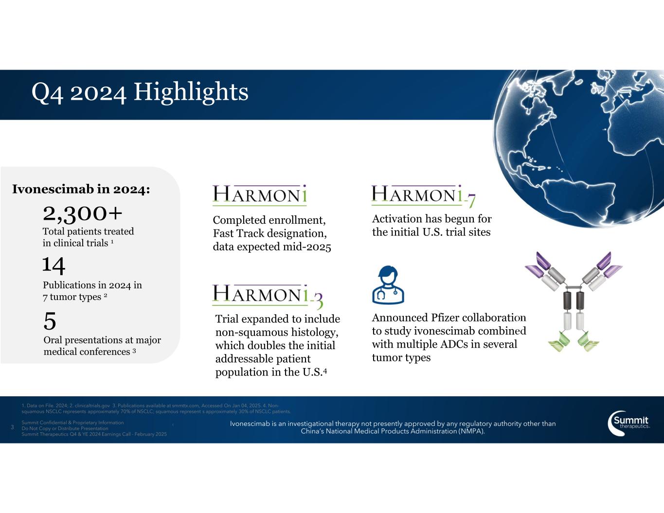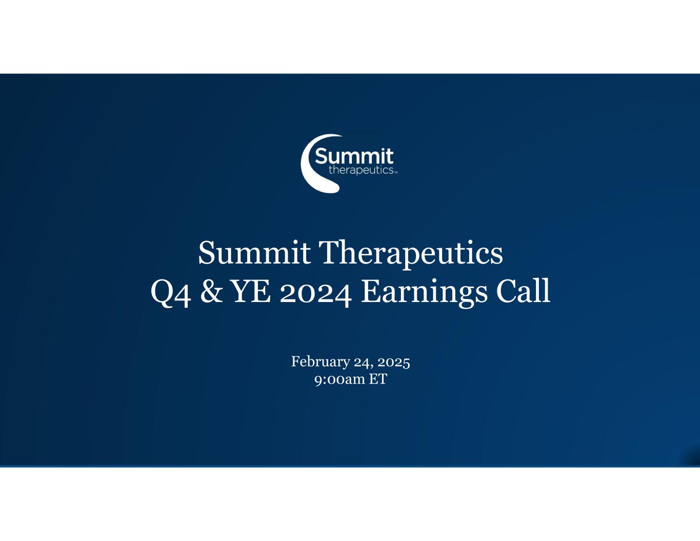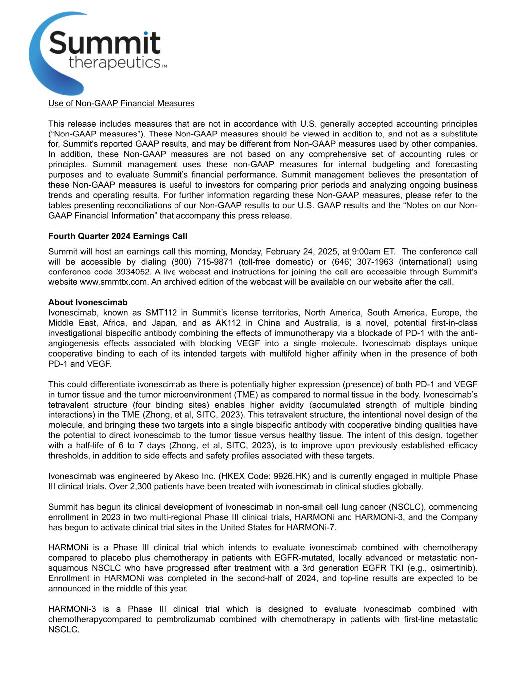 Use of Non-GAAP Financial Measures This release includes measures that are not in accordance with U.S. generally accepted accounting principles (“Non-GAAP measures”). These Non-GAAP measures should be viewed in addition to, and not as a substitute for, Summit's reported GAAP results, and may be different from Non-GAAP measures used by other companies. In addition, these Non-GAAP measures are not based on any comprehensive set of accounting rules or principles. Summit management uses these non-GAAP measures for internal budgeting and forecasting purposes and to evaluate Summit’s financial performance. Summit management believes the presentation of these Non-GAAP measures is useful to investors for comparing prior periods and analyzing ongoing business trends and operating results. For further information regarding these Non-GAAP measures, please refer to the tables presenting reconciliations of our Non-GAAP results to our U.S. GAAP results and the “Notes on our Non- GAAP Financial Information” that accompany this press release. Fourth Quarter 2024 Earnings Call Summit will host an earnings call this morning, Monday, February 24, 2025, at 9:00am ET. The conference call will be accessible by dialing (800) 715-9871 (toll-free domestic) or (646) 307-1963 (international) using conference code 3934052. A live webcast and instructions for joining the call are accessible through Summit’s website www.smmttx.com. An archived edition of the webcast will be available on our website after the call. About Ivonescimab Ivonescimab, known as SMT112 in Summit’s license territories, North America, South America, Europe, the Middle East, Africa, and Japan, and as AK112 in China and Australia, is a novel, potential first-in-class investigational bispecific antibody combining the effects of immunotherapy via a blockade of PD-1 with the anti- angiogenesis effects associated with blocking VEGF into a single molecule. Ivonescimab displays unique cooperative binding to each of its intended targets with multifold higher affinity when in the presence of both PD-1 and VEGF. This could differentiate ivonescimab as there is potentially higher expression (presence) of both PD-1 and VEGF in tumor tissue and the tumor microenvironment (TME) as compared to normal tissue in the body. Ivonescimab’s tetravalent structure (four binding sites) enables higher avidity (accumulated strength of multiple binding interactions) in the TME (Zhong, et al, SITC, 2023). This tetravalent structure, the intentional novel design of the molecule, and bringing these two targets into a single bispecific antibody with cooperative binding qualities have the potential to direct ivonescimab to the tumor tissue versus healthy tissue. The intent of this design, together with a half-life of 6 to 7 days (Zhong, et al, SITC, 2023), is to improve upon previously established efficacy thresholds, in addition to side effects and safety profiles associated with these targets. Ivonescimab was engineered by Akeso Inc. (HKEX Code: 9926.HK) and is currently engaged in multiple Phase III clinical trials. Over 2,300 patients have been treated with ivonescimab in clinical studies globally. Summit has begun its clinical development of ivonescimab in non-small cell lung cancer (NSCLC), commencing enrollment in 2023 in two multi-regional Phase III clinical trials, HARMONi and HARMONi-3, and the Company has begun to activate clinical trial sites in the United States for HARMONi-7. HARMONi is a Phase III clinical trial which intends to evaluate ivonescimab combined with chemotherapy compared to placebo plus chemotherapy in patients with EGFR-mutated, locally advanced or metastatic non- squamous NSCLC who have progressed after treatment with a 3rd generation EGFR TKI (e.g., osimertinib). Enrollment in HARMONi was completed in the second-half of 2024, and top-line results are expected to be announced in the middle of this year. HARMONi-3 is a Phase III clinical trial which is designed to evaluate ivonescimab combined with chemotherapycompared to pembrolizumab combined with chemotherapy in patients with first-line metastatic NSCLC.